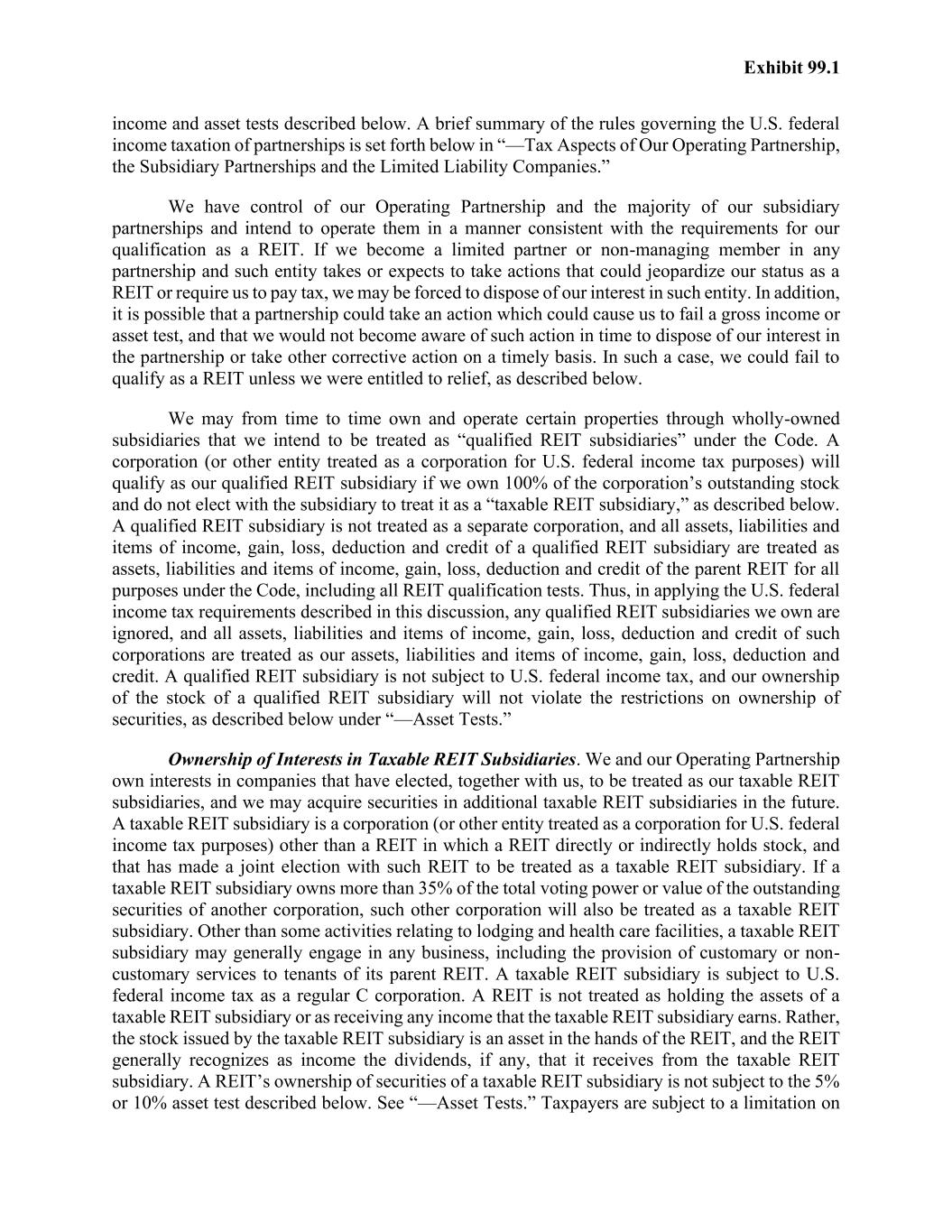 Exhibit 99.1 income and asset tests described below. A brief summary of the rules governing the U.S. federal income taxation of partnerships is set forth below in “—Tax Aspects of Our Operating Partnership, the Subsidiary Partnerships and the Limited Liability Companies.” We have control of our Operating Partnership and the majority of our subsidiary partnerships and intend to operate them in a manner consistent with the requirements for our qualification as a REIT. If we become a limited partner or non-managing member in any partnership and such entity takes or expects to take actions that could jeopardize our status as a REIT or require us to pay tax, we may be forced to dispose of our interest in such entity. In addition, it is possible that a partnership could take an action which could cause us to fail a gross income or asset test, and that we would not become aware of such action in time to dispose of our interest in the partnership or take other corrective action on a timely basis. In such a case, we could fail to qualify as a REIT unless we were entitled to relief, as described below. We may from time to time own and operate certain properties through wholly-owned subsidiaries that we intend to be treated as “qualified REIT subsidiaries” under the Code. A corporation (or other entity treated as a corporation for U.S. federal income tax purposes) will qualify as our qualified REIT subsidiary if we own 100% of the corporation’s outstanding stock and do not elect with the subsidiary to treat it as a “taxable REIT subsidiary,” as described below. A qualified REIT subsidiary is not treated as a separate corporation, and all assets, liabilities and items of income, gain, loss, deduction and credit of a qualified REIT subsidiary are treated as assets, liabilities and items of income, gain, loss, deduction and credit of the parent REIT for all purposes under the Code, including all REIT qualification tests. Thus, in applying the U.S. federal income tax requirements described in this discussion, any qualified REIT subsidiaries we own are ignored, and all assets, liabilities and items of income, gain, loss, deduction and credit of such corporations are treated as our assets, liabilities and items of income, gain, loss, deduction and credit. A qualified REIT subsidiary is not subject to U.S. federal income tax, and our ownership of the stock of a qualified REIT subsidiary will not violate the restrictions on ownership of securities, as described below under “—Asset Tests.” Ownership of Interests in Taxable REIT Subsidiaries. We and our Operating Partnership own interests in companies that have elected, together with us, to be treated as our taxable REIT subsidiaries, and we may acquire securities in additional taxable REIT subsidiaries in the future. A taxable REIT subsidiary is a corporation (or other entity treated as a corporation for U.S. federal income tax purposes) other than a REIT in which a REIT directly or indirectly holds stock, and that has made a joint election with such REIT to be treated as a taxable REIT subsidiary. If a taxable REIT subsidiary owns more than 35% of the total voting power or value of the outstanding securities of another corporation, such other corporation will also be treated as a taxable REIT subsidiary. Other than some activities relating to lodging and health care facilities, a taxable REIT subsidiary may generally engage in any business, including the provision of customary or non- customary services to tenants of its parent REIT. A taxable REIT subsidiary is subject to U.S. federal income tax as a regular C corporation. A REIT is not treated as holding the assets of a taxable REIT subsidiary or as receiving any income that the taxable REIT subsidiary earns. Rather, the stock issued by the taxable REIT subsidiary is an asset in the hands of the REIT, and the REIT generally recognizes as income the dividends, if any, that it receives from the taxable REIT subsidiary. A REIT’s ownership of securities of a taxable REIT subsidiary is not subject to the 5% or 10% asset test described below. See “—Asset Tests.” Taxpayers are subject to a limitation on