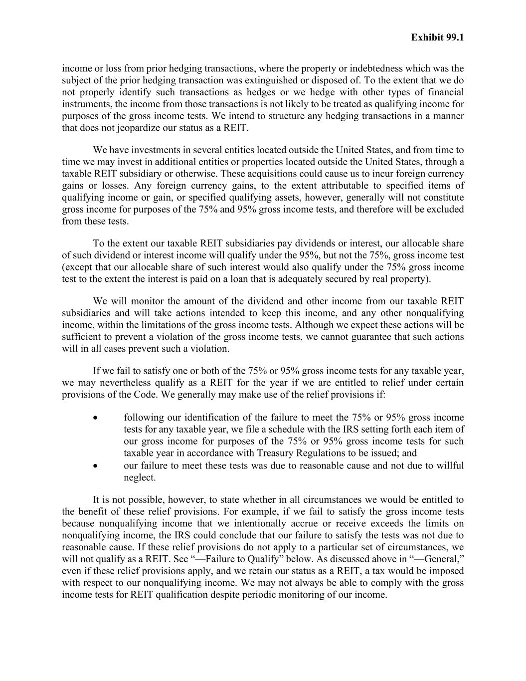 Exhibit 99.1 income or loss from prior hedging transactions, where the property or indebtedness which was the subject of the prior hedging transaction was extinguished or disposed of. To the extent that we do not properly identify such transactions as hedges or we hedge with other types of financial instruments, the income from those transactions is not likely to be treated as qualifying income for purposes of the gross income tests. We intend to structure any hedging transactions in a manner that does not jeopardize our status as a REIT. We have investments in several entities located outside the United States, and from time to time we may invest in additional entities or properties located outside the United States, through a taxable REIT subsidiary or otherwise. These acquisitions could cause us to incur foreign currency gains or losses. Any foreign currency gains, to the extent attributable to specified items of qualifying income or gain, or specified qualifying assets, however, generally will not constitute gross income for purposes of the 75% and 95% gross income tests, and therefore will be excluded from these tests. To the extent our taxable REIT subsidiaries pay dividends or interest, our allocable share of such dividend or interest income will qualify under the 95%, but not the 75%, gross income test (except that our allocable share of such interest would also qualify under the 75% gross income test to the extent the interest is paid on a loan that is adequately secured by real property). We will monitor the amount of the dividend and other income from our taxable REIT subsidiaries and will take actions intended to keep this income, and any other nonqualifying income, within the limitations of the gross income tests. Although we expect these actions will be sufficient to prevent a violation of the gross income tests, we cannot guarantee that such actions will in all cases prevent such a violation. If we fail to satisfy one or both of the 75% or 95% gross income tests for any taxable year, we may nevertheless qualify as a REIT for the year if we are entitled to relief under certain provisions of the Code. We generally may make use of the relief provisions if: • following our identification of the failure to meet the 75% or 95% gross income tests for any taxable year, we file a schedule with the IRS setting forth each item of our gross income for purposes of the 75% or 95% gross income tests for such taxable year in accordance with Treasury Regulations to be issued; and • our failure to meet these tests was due to reasonable cause and not due to willful neglect. It is not possible, however, to state whether in all circumstances we would be entitled to the benefit of these relief provisions. For example, if we fail to satisfy the gross income tests because nonqualifying income that we intentionally accrue or receive exceeds the limits on nonqualifying income, the IRS could conclude that our failure to satisfy the tests was not due to reasonable cause. If these relief provisions do not apply to a particular set of circumstances, we will not qualify as a REIT. See “—Failure to Qualify” below. As discussed above in “—General,” even if these relief provisions apply, and we retain our status as a REIT, a tax would be imposed with respect to our nonqualifying income. We may not always be able to comply with the gross income tests for REIT qualification despite periodic monitoring of our income.