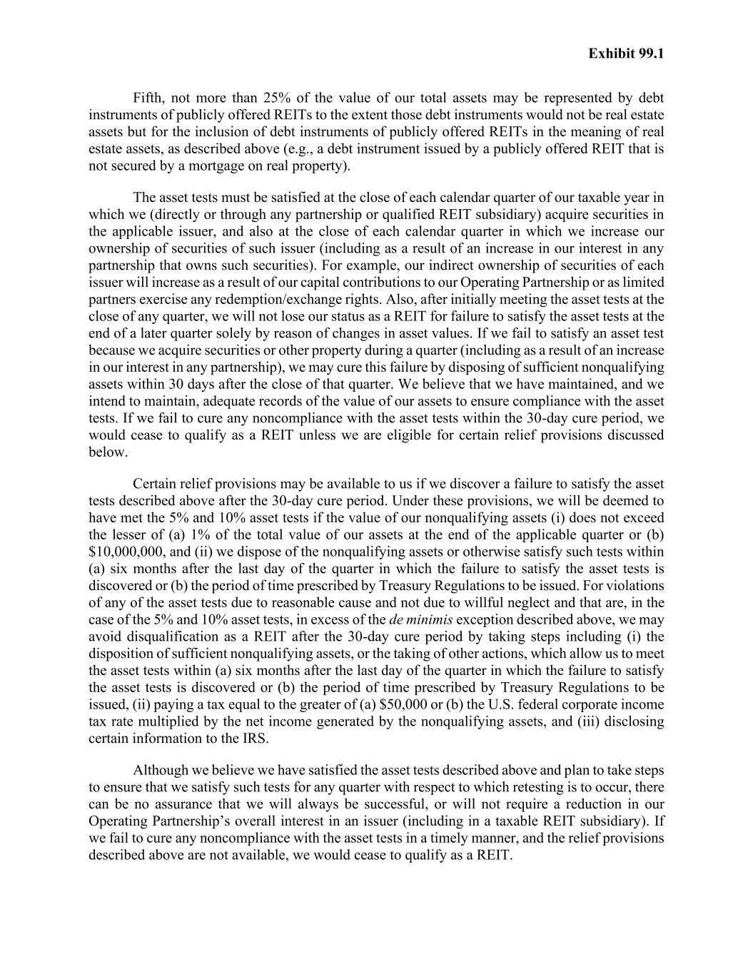 Exhibit 99.1 Fifth, not more than 25% of the value of our total assets may be represented by debt instruments of publicly offered REITs to the extent those debt instruments would not be real estate assets but for the inclusion of debt instruments of publicly offered REITs in the meaning of real estate assets, as described above (e.g., a debt instrument issued by a publicly offered REIT that is not secured by a mortgage on real property). The asset tests must be satisfied at the close of each calendar quarter of our taxable year in which we (directly or through any partnership or qualified REIT subsidiary) acquire securities in the applicable issuer, and also at the close of each calendar quarter in which we increase our ownership of securities of such issuer (including as a result of an increase in our interest in any partnership that owns such securities). For example, our indirect ownership of securities of each issuer will increase as a result of our capital contributions to our Operating Partnership or as limited partners exercise any redemption/exchange rights. Also, after initially meeting the asset tests at the close of any quarter, we will not lose our status as a REIT for failure to satisfy the asset tests at the end of a later quarter solely by reason of changes in asset values. If we fail to satisfy an asset test because we acquire securities or other property during a quarter (including as a result of an increase in our interest in any partnership), we may cure this failure by disposing of sufficient nonqualifying assets within 30 days after the close of that quarter. We believe that we have maintained, and we intend to maintain, adequate records of the value of our assets to ensure compliance with the asset tests. If we fail to cure any noncompliance with the asset tests within the 30-day cure period, we would cease to qualify as a REIT unless we are eligible for certain relief provisions discussed below. Certain relief provisions may be available to us if we discover a failure to satisfy the asset tests described above after the 30-day cure period. Under these provisions, we will be deemed to have met the 5% and 10% asset tests if the value of our nonqualifying assets (i) does not exceed the lesser of (a) 1% of the total value of our assets at the end of the applicable quarter or (b) $10,000,000, and (ii) we dispose of the nonqualifying assets or otherwise satisfy such tests within (a) six months after the last day of the quarter in which the failure to satisfy the asset tests is discovered or (b) the period of time prescribed by Treasury Regulations to be issued. For violations of any of the asset tests due to reasonable cause and not due to willful neglect and that are, in the case of the 5% and 10% asset tests, in excess of the de minimis exception described above, we may avoid disqualification as a REIT after the 30-day cure period by taking steps including (i) the disposition of sufficient nonqualifying assets, or the taking of other actions, which allow us to meet the asset tests within (a) six months after the last day of the quarter in which the failure to satisfy the asset tests is discovered or (b) the period of time prescribed by Treasury Regulations to be issued, (ii) paying a tax equal to the greater of (a) $50,000 or (b) the U.S. federal corporate income tax rate multiplied by the net income generated by the nonqualifying assets, and (iii) disclosing certain information to the IRS. Although we believe we have satisfied the asset tests described above and plan to take steps to ensure that we satisfy such tests for any quarter with respect to which retesting is to occur, there can be no assurance that we will always be successful, or will not require a reduction in our Operating Partnership’s overall interest in an issuer (including in a taxable REIT subsidiary). If we fail to cure any noncompliance with the asset tests in a timely manner, and the relief provisions described above are not available, we would cease to qualify as a REIT.