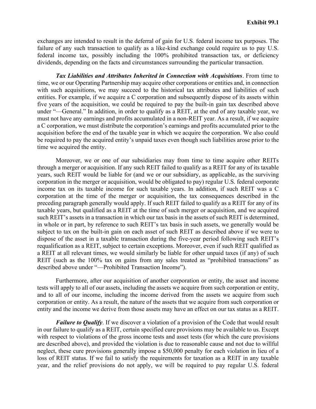 Exhibit 99.1 exchanges are intended to result in the deferral of gain for U.S. federal income tax purposes. The failure of any such transaction to qualify as a like-kind exchange could require us to pay U.S. federal income tax, possibly including the 100% prohibited transaction tax, or deficiency dividends, depending on the facts and circumstances surrounding the particular transaction. Tax Liabilities and Attributes Inherited in Connection with Acquisitions. From time to time, we or our Operating Partnership may acquire other corporations or entities and, in connection with such acquisitions, we may succeed to the historical tax attributes and liabilities of such entities. For example, if we acquire a C corporation and subsequently dispose of its assets within five years of the acquisition, we could be required to pay the built-in gain tax described above under “—General.” In addition, in order to qualify as a REIT, at the end of any taxable year, we must not have any earnings and profits accumulated in a non-REIT year. As a result, if we acquire a C corporation, we must distribute the corporation’s earnings and profits accumulated prior to the acquisition before the end of the taxable year in which we acquire the corporation. We also could be required to pay the acquired entity’s unpaid taxes even though such liabilities arose prior to the time we acquired the entity. Moreover, we or one of our subsidiaries may from time to time acquire other REITs through a merger or acquisition. If any such REIT failed to qualify as a REIT for any of its taxable years, such REIT would be liable for (and we or our subsidiary, as applicable, as the surviving corporation in the merger or acquisition, would be obligated to pay) regular U.S. federal corporate income tax on its taxable income for such taxable years. In addition, if such REIT was a C corporation at the time of the merger or acquisition, the tax consequences described in the preceding paragraph generally would apply. If such REIT failed to qualify as a REIT for any of its taxable years, but qualified as a REIT at the time of such merger or acquisition, and we acquired such REIT’s assets in a transaction in which our tax basis in the assets of such REIT is determined, in whole or in part, by reference to such REIT’s tax basis in such assets, we generally would be subject to tax on the built-in gain on each asset of such REIT as described above if we were to dispose of the asset in a taxable transaction during the five-year period following such REIT’s requalification as a REIT, subject to certain exceptions. Moreover, even if such REIT qualified as a REIT at all relevant times, we would similarly be liable for other unpaid taxes (if any) of such REIT (such as the 100% tax on gains from any sales treated as “prohibited transactions” as described above under “—Prohibited Transaction Income”). Furthermore, after our acquisition of another corporation or entity, the asset and income tests will apply to all of our assets, including the assets we acquire from such corporation or entity, and to all of our income, including the income derived from the assets we acquire from such corporation or entity. As a result, the nature of the assets that we acquire from such corporation or entity and the income we derive from those assets may have an effect on our tax status as a REIT. Failure to Qualify. If we discover a violation of a provision of the Code that would result in our failure to qualify as a REIT, certain specified cure provisions may be available to us. Except with respect to violations of the gross income tests and asset tests (for which the cure provisions are described above), and provided the violation is due to reasonable cause and not due to willful neglect, these cure provisions generally impose a $50,000 penalty for each violation in lieu of a loss of REIT status. If we fail to satisfy the requirements for taxation as a REIT in any taxable year, and the relief provisions do not apply, we will be required to pay regular U.S. federal