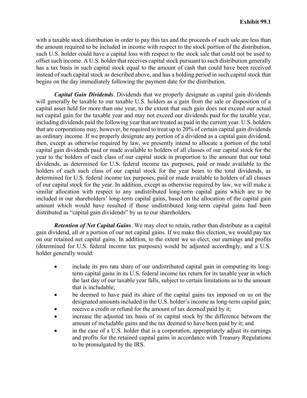 Exhibit 99.1 with a taxable stock distribution in order to pay this tax and the proceeds of such sale are less than the amount required to be included in income with respect to the stock portion of the distribution, such U.S. holder could have a capital loss with respect to the stock sale that could not be used to offset such income. A U.S. holder that receives capital stock pursuant to such distribution generally has a tax basis in such capital stock equal to the amount of cash that could have been received instead of such capital stock as described above, and has a holding period in such capital stock that begins on the day immediately following the payment date for the distribution. Capital Gain Dividends. Dividends that we properly designate as capital gain dividends will generally be taxable to our taxable U.S. holders as a gain from the sale or disposition of a capital asset held for more than one year, to the extent that such gain does not exceed our actual net capital gain for the taxable year and may not exceed our dividends paid for the taxable year, including dividends paid the following year that are treated as paid in the current year. U.S. holders that are corporations may, however, be required to treat up to 20% of certain capital gain dividends as ordinary income. If we properly designate any portion of a dividend as a capital gain dividend, then, except as otherwise required by law, we presently intend to allocate a portion of the total capital gain dividends paid or made available to holders of all classes of our capital stock for the year to the holders of each class of our capital stock in proportion to the amount that our total dividends, as determined for U.S. federal income tax purposes, paid or made available to the holders of each such class of our capital stock for the year bears to the total dividends, as determined for U.S. federal income tax purposes, paid or made available to holders of all classes of our capital stock for the year. In addition, except as otherwise required by law, we will make a similar allocation with respect to any undistributed long-term capital gains which are to be included in our shareholders’ long-term capital gains, based on the allocation of the capital gain amount which would have resulted if those undistributed long-term capital gains had been distributed as “capital gain dividends” by us to our shareholders. Retention of Net Capital Gains. We may elect to retain, rather than distribute as a capital gain dividend, all or a portion of our net capital gains. If we make this election, we would pay tax on our retained net capital gains. In addition, to the extent we so elect, our earnings and profits (determined for U.S. federal income tax purposes) would be adjusted accordingly, and a U.S. holder generally would: • include its pro rata share of our undistributed capital gain in computing its long- term capital gains in its U.S. federal income tax return for its taxable year in which the last day of our taxable year falls, subject to certain limitations as to the amount that is includable; • be deemed to have paid its share of the capital gains tax imposed on us on the designated amounts included in the U.S. holder’s income as long-term capital gain; • receive a credit or refund for the amount of tax deemed paid by it; • increase the adjusted tax basis of its capital stock by the difference between the amount of includable gains and the tax deemed to have been paid by it; and • in the case of a U.S. holder that is a corporation, appropriately adjust its earnings and profits for the retained capital gains in accordance with Treasury Regulations to be promulgated by the IRS.