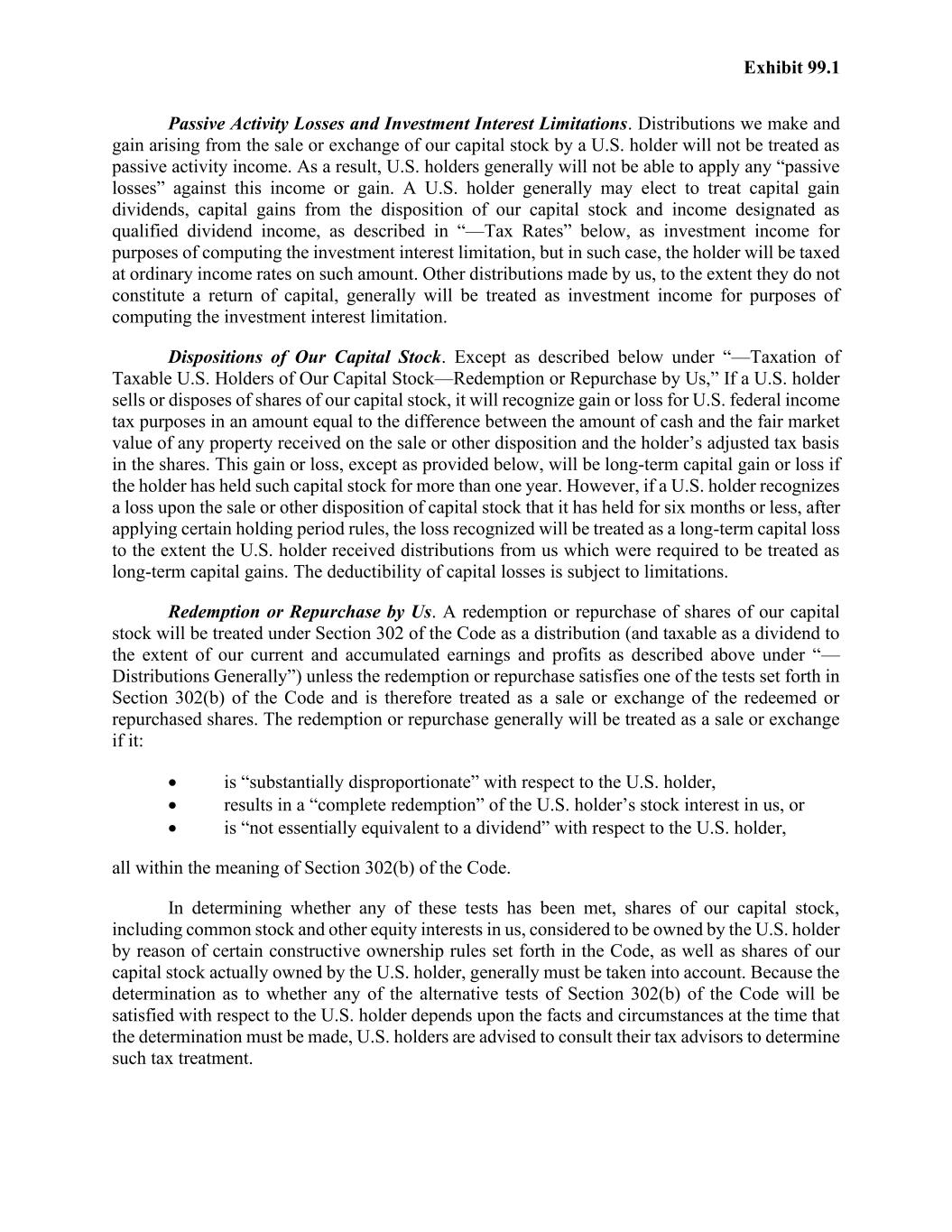 Exhibit 99.1 Passive Activity Losses and Investment Interest Limitations. Distributions we make and gain arising from the sale or exchange of our capital stock by a U.S. holder will not be treated as passive activity income. As a result, U.S. holders generally will not be able to apply any “passive losses” against this income or gain. A U.S. holder generally may elect to treat capital gain dividends, capital gains from the disposition of our capital stock and income designated as qualified dividend income, as described in “—Tax Rates” below, as investment income for purposes of computing the investment interest limitation, but in such case, the holder will be taxed at ordinary income rates on such amount. Other distributions made by us, to the extent they do not constitute a return of capital, generally will be treated as investment income for purposes of computing the investment interest limitation. Dispositions of Our Capital Stock. Except as described below under “—Taxation of Taxable U.S. Holders of Our Capital Stock—Redemption or Repurchase by Us,” If a U.S. holder sells or disposes of shares of our capital stock, it will recognize gain or loss for U.S. federal income tax purposes in an amount equal to the difference between the amount of cash and the fair market value of any property received on the sale or other disposition and the holder’s adjusted tax basis in the shares. This gain or loss, except as provided below, will be long-term capital gain or loss if the holder has held such capital stock for more than one year. However, if a U.S. holder recognizes a loss upon the sale or other disposition of capital stock that it has held for six months or less, after applying certain holding period rules, the loss recognized will be treated as a long-term capital loss to the extent the U.S. holder received distributions from us which were required to be treated as long-term capital gains. The deductibility of capital losses is subject to limitations. Redemption or Repurchase by Us. A redemption or repurchase of shares of our capital stock will be treated under Section 302 of the Code as a distribution (and taxable as a dividend to the extent of our current and accumulated earnings and profits as described above under “— Distributions Generally”) unless the redemption or repurchase satisfies one of the tests set forth in Section 302(b) of the Code and is therefore treated as a sale or exchange of the redeemed or repurchased shares. The redemption or repurchase generally will be treated as a sale or exchange if it: • is “substantially disproportionate” with respect to the U.S. holder, • results in a “complete redemption” of the U.S. holder’s stock interest in us, or • is “not essentially equivalent to a dividend” with respect to the U.S. holder, all within the meaning of Section 302(b) of the Code. In determining whether any of these tests has been met, shares of our capital stock, including common stock and other equity interests in us, considered to be owned by the U.S. holder by reason of certain constructive ownership rules set forth in the Code, as well as shares of our capital stock actually owned by the U.S. holder, generally must be taken into account. Because the determination as to whether any of the alternative tests of Section 302(b) of the Code will be satisfied with respect to the U.S. holder depends upon the facts and circumstances at the time that the determination must be made, U.S. holders are advised to consult their tax advisors to determine such tax treatment.