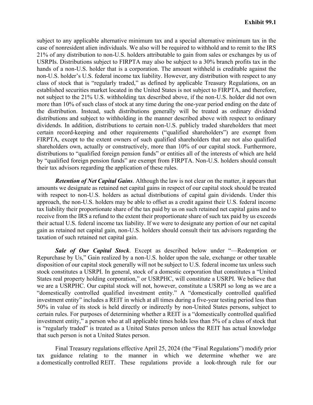 Exhibit 99.1 subject to any applicable alternative minimum tax and a special alternative minimum tax in the case of nonresident alien individuals. We also will be required to withhold and to remit to the IRS 21% of any distribution to non-U.S. holders attributable to gain from sales or exchanges by us of USRPIs. Distributions subject to FIRPTA may also be subject to a 30% branch profits tax in the hands of a non-U.S. holder that is a corporation. The amount withheld is creditable against the non-U.S. holder’s U.S. federal income tax liability. However, any distribution with respect to any class of stock that is “regularly traded,” as defined by applicable Treasury Regulations, on an established securities market located in the United States is not subject to FIRPTA, and therefore, not subject to the 21% U.S. withholding tax described above, if the non-U.S. holder did not own more than 10% of such class of stock at any time during the one-year period ending on the date of the distribution. Instead, such distributions generally will be treated as ordinary dividend distributions and subject to withholding in the manner described above with respect to ordinary dividends. In addition, distributions to certain non-U.S. publicly traded shareholders that meet certain record-keeping and other requirements (“qualified shareholders”) are exempt from FIRPTA, except to the extent owners of such qualified shareholders that are not also qualified shareholders own, actually or constructively, more than 10% of our capital stock. Furthermore, distributions to “qualified foreign pension funds” or entities all of the interests of which are held by “qualified foreign pension funds” are exempt from FIRPTA. Non-U.S. holders should consult their tax advisors regarding the application of these rules. Retention of Net Capital Gains. Although the law is not clear on the matter, it appears that amounts we designate as retained net capital gains in respect of our capital stock should be treated with respect to non-U.S. holders as actual distributions of capital gain dividends. Under this approach, the non-U.S. holders may be able to offset as a credit against their U.S. federal income tax liability their proportionate share of the tax paid by us on such retained net capital gains and to receive from the IRS a refund to the extent their proportionate share of such tax paid by us exceeds their actual U.S. federal income tax liability. If we were to designate any portion of our net capital gain as retained net capital gain, non-U.S. holders should consult their tax advisors regarding the taxation of such retained net capital gain. Sale of Our Capital Stock. Except as described below under “—Redemption or Repurchase by Us,” Gain realized by a non-U.S. holder upon the sale, exchange or other taxable disposition of our capital stock generally will not be subject to U.S. federal income tax unless such stock constitutes a USRPI. In general, stock of a domestic corporation that constitutes a “United States real property holding corporation,” or USRPHC, will constitute a USRPI. We believe that we are a USRPHC. Our capital stock will not, however, constitute a USRPI so long as we are a “domestically controlled qualified investment entity.” A “domestically controlled qualified investment entity” includes a REIT in which at all times during a five-year testing period less than 50% in value of its stock is held directly or indirectly by non-United States persons, subject to certain rules. For purposes of determining whether a REIT is a “domestically controlled qualified investment entity,” a person who at all applicable times holds less than 5% of a class of stock that is “regularly traded” is treated as a United States person unless the REIT has actual knowledge that such person is not a United States person. Final Treasury regulations effective April 25, 2024 (the “Final Regulations”) modify prior tax guidance relating to the manner in which we determine whether we are a domestically controlled REIT. These regulations provide a look-through rule for our