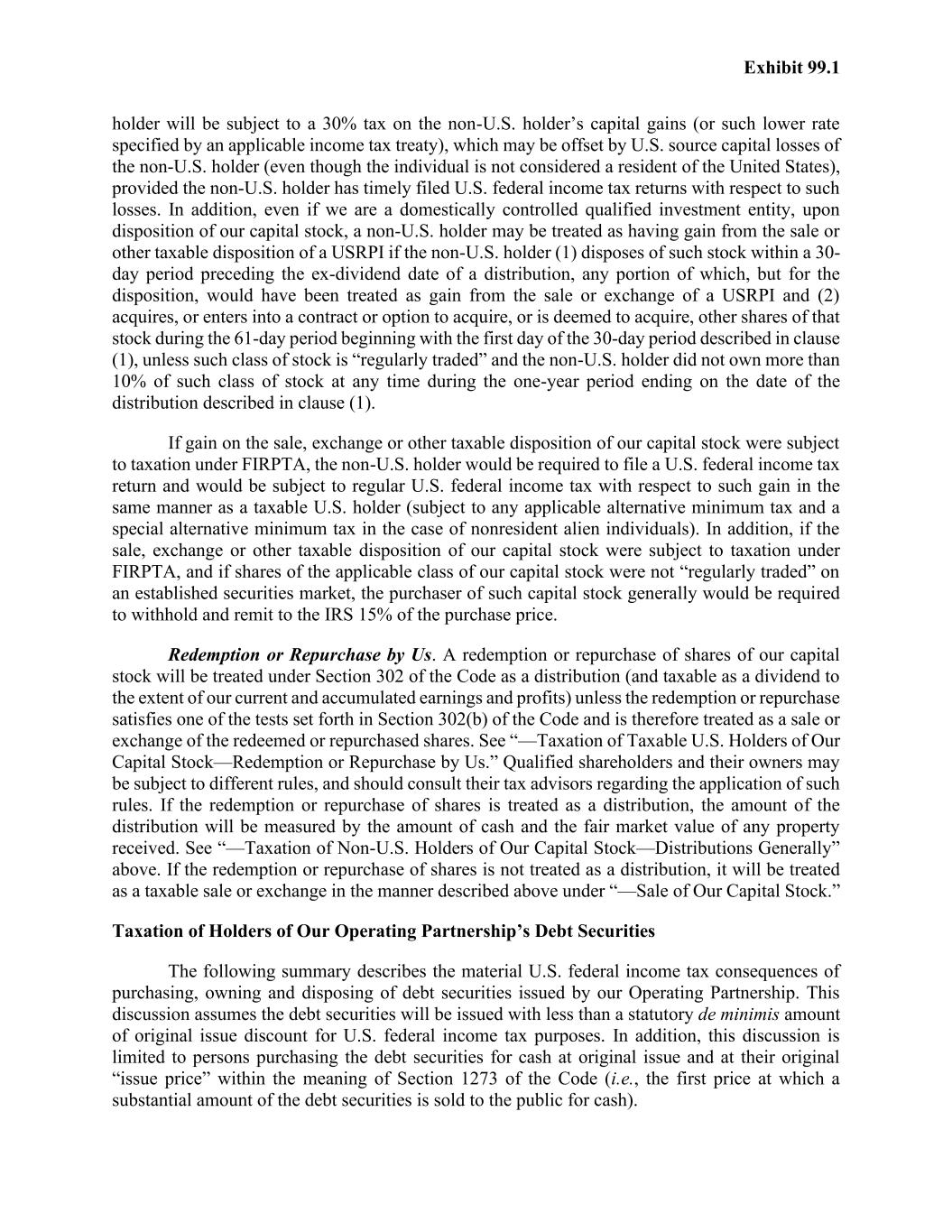 Exhibit 99.1 holder will be subject to a 30% tax on the non-U.S. holder’s capital gains (or such lower rate specified by an applicable income tax treaty), which may be offset by U.S. source capital losses of the non-U.S. holder (even though the individual is not considered a resident of the United States), provided the non-U.S. holder has timely filed U.S. federal income tax returns with respect to such losses. In addition, even if we are a domestically controlled qualified investment entity, upon disposition of our capital stock, a non-U.S. holder may be treated as having gain from the sale or other taxable disposition of a USRPI if the non-U.S. holder (1) disposes of such stock within a 30- day period preceding the ex-dividend date of a distribution, any portion of which, but for the disposition, would have been treated as gain from the sale or exchange of a USRPI and (2) acquires, or enters into a contract or option to acquire, or is deemed to acquire, other shares of that stock during the 61-day period beginning with the first day of the 30-day period described in clause (1), unless such class of stock is “regularly traded” and the non-U.S. holder did not own more than 10% of such class of stock at any time during the one-year period ending on the date of the distribution described in clause (1). If gain on the sale, exchange or other taxable disposition of our capital stock were subject to taxation under FIRPTA, the non-U.S. holder would be required to file a U.S. federal income tax return and would be subject to regular U.S. federal income tax with respect to such gain in the same manner as a taxable U.S. holder (subject to any applicable alternative minimum tax and a special alternative minimum tax in the case of nonresident alien individuals). In addition, if the sale, exchange or other taxable disposition of our capital stock were subject to taxation under FIRPTA, and if shares of the applicable class of our capital stock were not “regularly traded” on an established securities market, the purchaser of such capital stock generally would be required to withhold and remit to the IRS 15% of the purchase price. Redemption or Repurchase by Us. A redemption or repurchase of shares of our capital stock will be treated under Section 302 of the Code as a distribution (and taxable as a dividend to the extent of our current and accumulated earnings and profits) unless the redemption or repurchase satisfies one of the tests set forth in Section 302(b) of the Code and is therefore treated as a sale or exchange of the redeemed or repurchased shares. See “—Taxation of Taxable U.S. Holders of Our Capital Stock—Redemption or Repurchase by Us.” Qualified shareholders and their owners may be subject to different rules, and should consult their tax advisors regarding the application of such rules. If the redemption or repurchase of shares is treated as a distribution, the amount of the distribution will be measured by the amount of cash and the fair market value of any property received. See “—Taxation of Non-U.S. Holders of Our Capital Stock—Distributions Generally” above. If the redemption or repurchase of shares is not treated as a distribution, it will be treated as a taxable sale or exchange in the manner described above under “—Sale of Our Capital Stock.” Taxation of Holders of Our Operating Partnership’s Debt Securities The following summary describes the material U.S. federal income tax consequences of purchasing, owning and disposing of debt securities issued by our Operating Partnership. This discussion assumes the debt securities will be issued with less than a statutory de minimis amount of original issue discount for U.S. federal income tax purposes. In addition, this discussion is limited to persons purchasing the debt securities for cash at original issue and at their original “issue price” within the meaning of Section 1273 of the Code (i.e., the first price at which a substantial amount of the debt securities is sold to the public for cash).