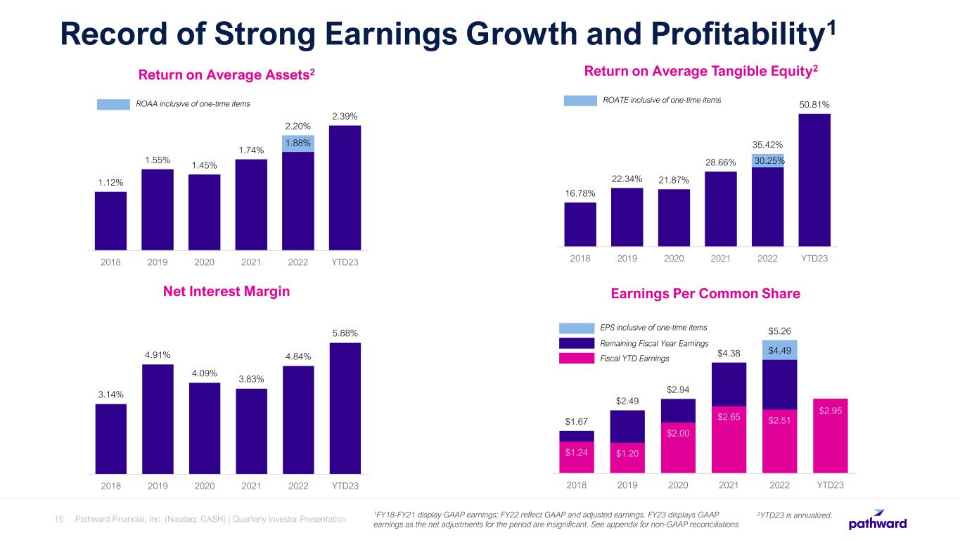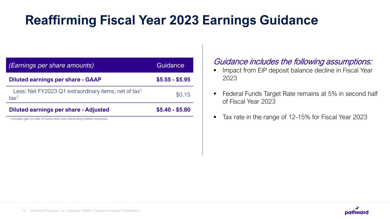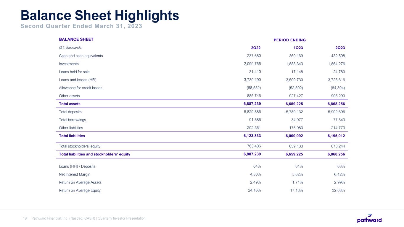 CEO Brett Pharr said, “Pathward generated solid results during the second quarter driven by the continued expansion of our net interest margin and higher non-interest income. We continue to benefit from servicing fee income on our off-balance deposits and see increases in the average yield on our interest-earnings assets as they reprice. We are very pleased that this year's tax season has performed above our initial expectations through the end of March. Based on these results, we are reaffirming our fiscal year 2023 GAAP earnings per diluted share guidance of $5.55 to $5.95, despite the $7.3 million adverse pre-tax impacts during the quarter.”