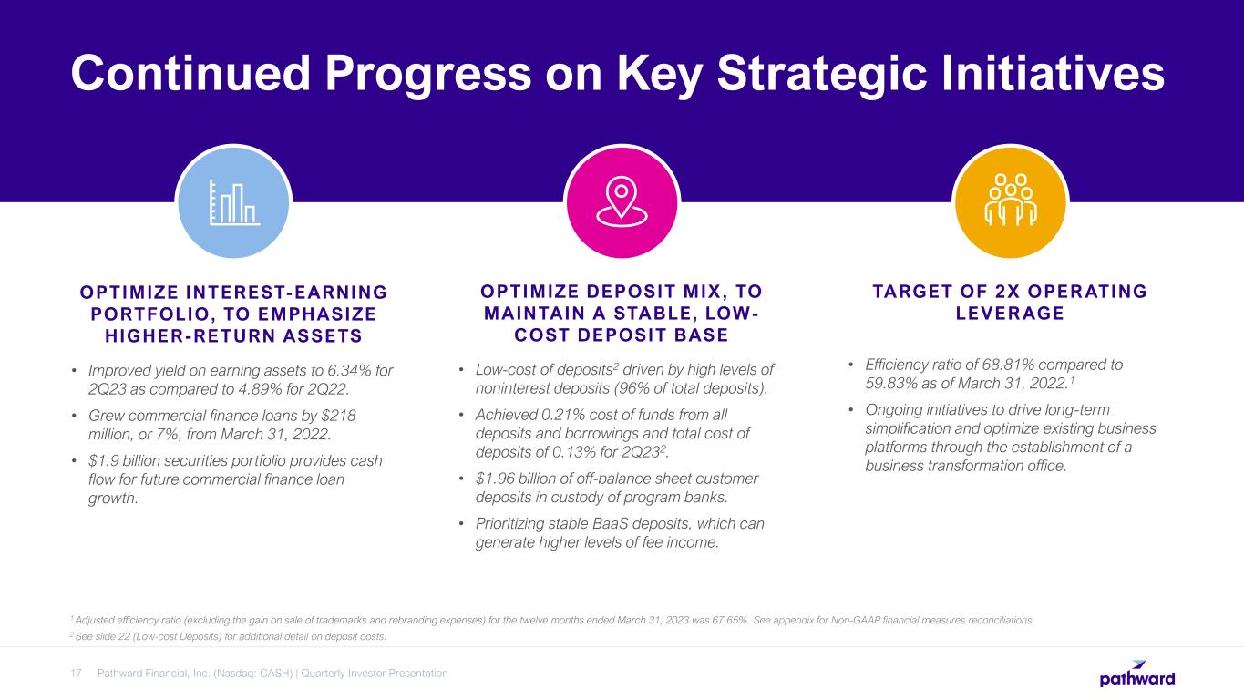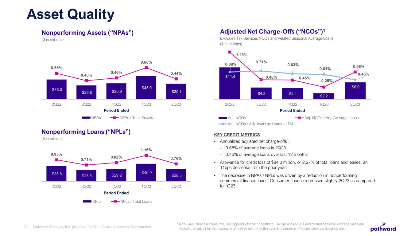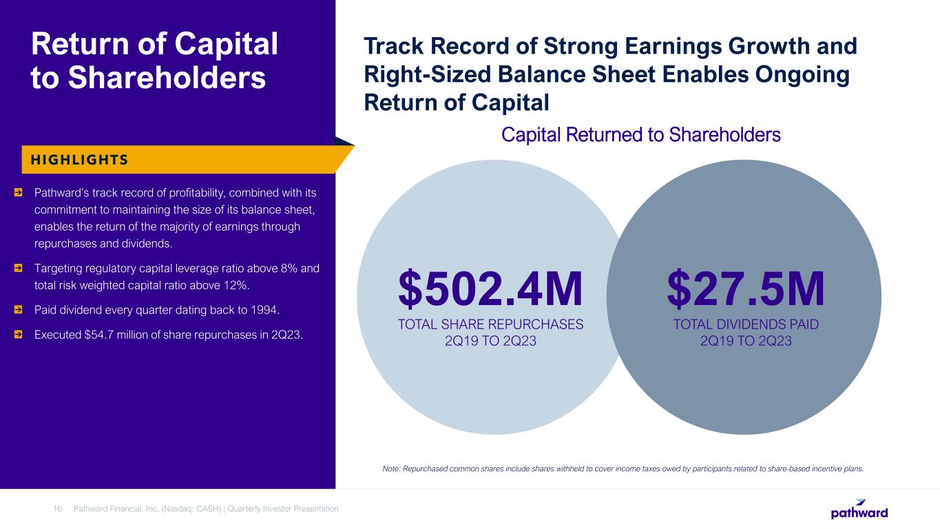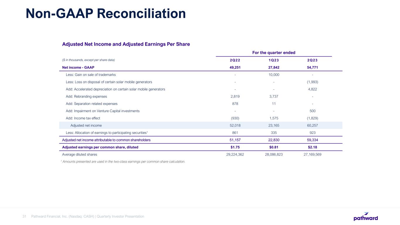 CEO Brett Pharr said, “Pathward generated solid results during the second quarter driven by the continued expansion of our net interest margin and higher non-interest income. We continue to benefit from servicing fee income on our off-balance deposits and see increases in the average yield on our interest-earnings assets as they reprice. We are very pleased that this year's tax season has performed above our initial expectations through the end of March. Based on these results, we are reaffirming our fiscal year 2023 GAAP earnings per diluted share guidance of $5.55 to $5.95, despite the $7.3 million adverse pre-tax impacts during the quarter.”