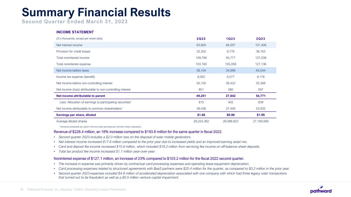 Sioux Falls, S.D., April 26, 2023 - Pathward Financial, Inc. (“Pathward Financial” or the “Company”) (Nasdaq: CASH) reported net income of $54.8 million, or $1.99 per share, for the three months ended March 31, 2023, compared to net income of $49.3 million, or $1.66 per share, for the three months ended March 31, 2022.