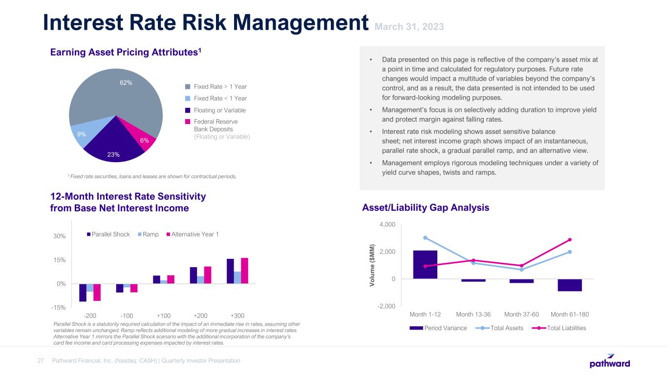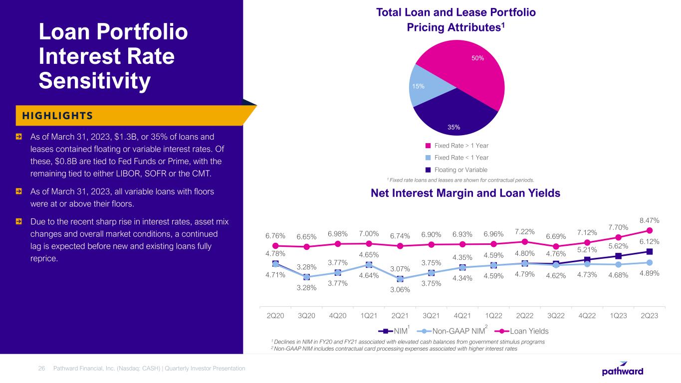 The card processing expense increase was due to structured agreements with banking as a service ("BaaS") partners. The amount of expense paid under those agreements is based on an agreed upon rate index that varies depending on the deposit levels, floor rates, market conditions, and other performance conditions. Generally this rate index averages between 50% to 85% of the Effective Federal Funds Rate ("EFFR") and reprices immediately upon a change in the EFFR. Approximately 47% of the deposit portfolio was subject to these higher card processing expenses. For the fiscal quarter ended March 31, 2023, card processing expenses related to these structured agreements were $20.4 million, as compared to $14.0 million for the fiscal quarter ended December 31, 2022 and $0.2 million for the fiscal quarter ended March 31, 2022.