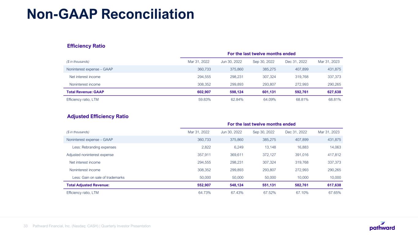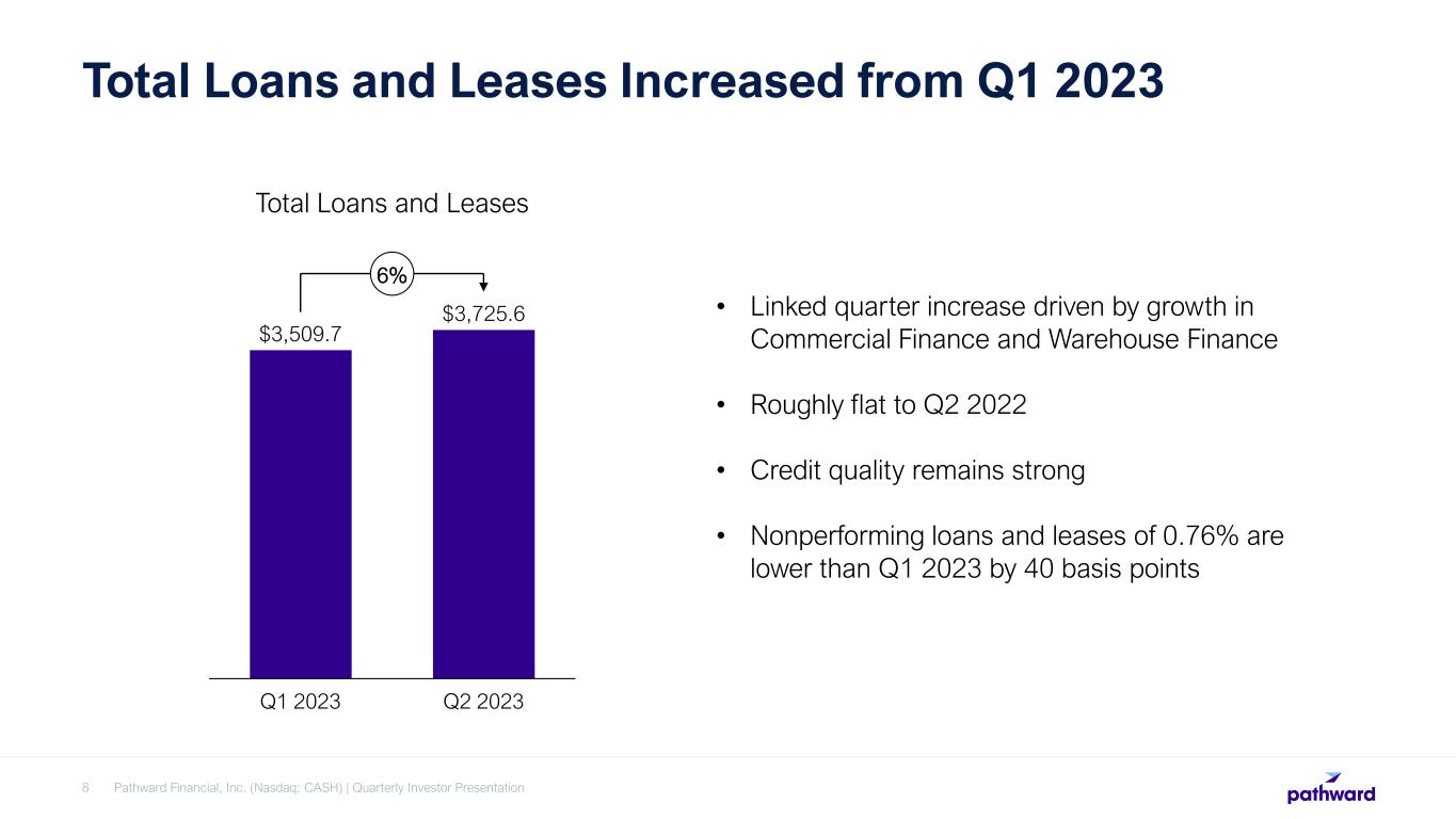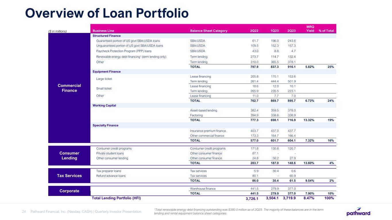 パスワードグループのCEOであるブレット・ファーは、「第2四半期は、純金利率の継続的な拡大と非金利収入の増加により、堅調な業績を上げることができました。オフバランス預金のサービシング手数料収入は引き続き恩恵を受け、また、金利収益資産の再価格決定に伴う平均利回りの上昇も見られます。今年の税制改正は、3月末まで当初の予想を上回る実績となり、大変嬉しく思っています。これらの結果に基づき、当四半期に730万ドルの税引き前不利益の影響があったものの、2023会計年度のGAAPベースの希薄化後1株当たり利益ガイダンスを5.55ドルから5.95ドルと再確認しています。"
