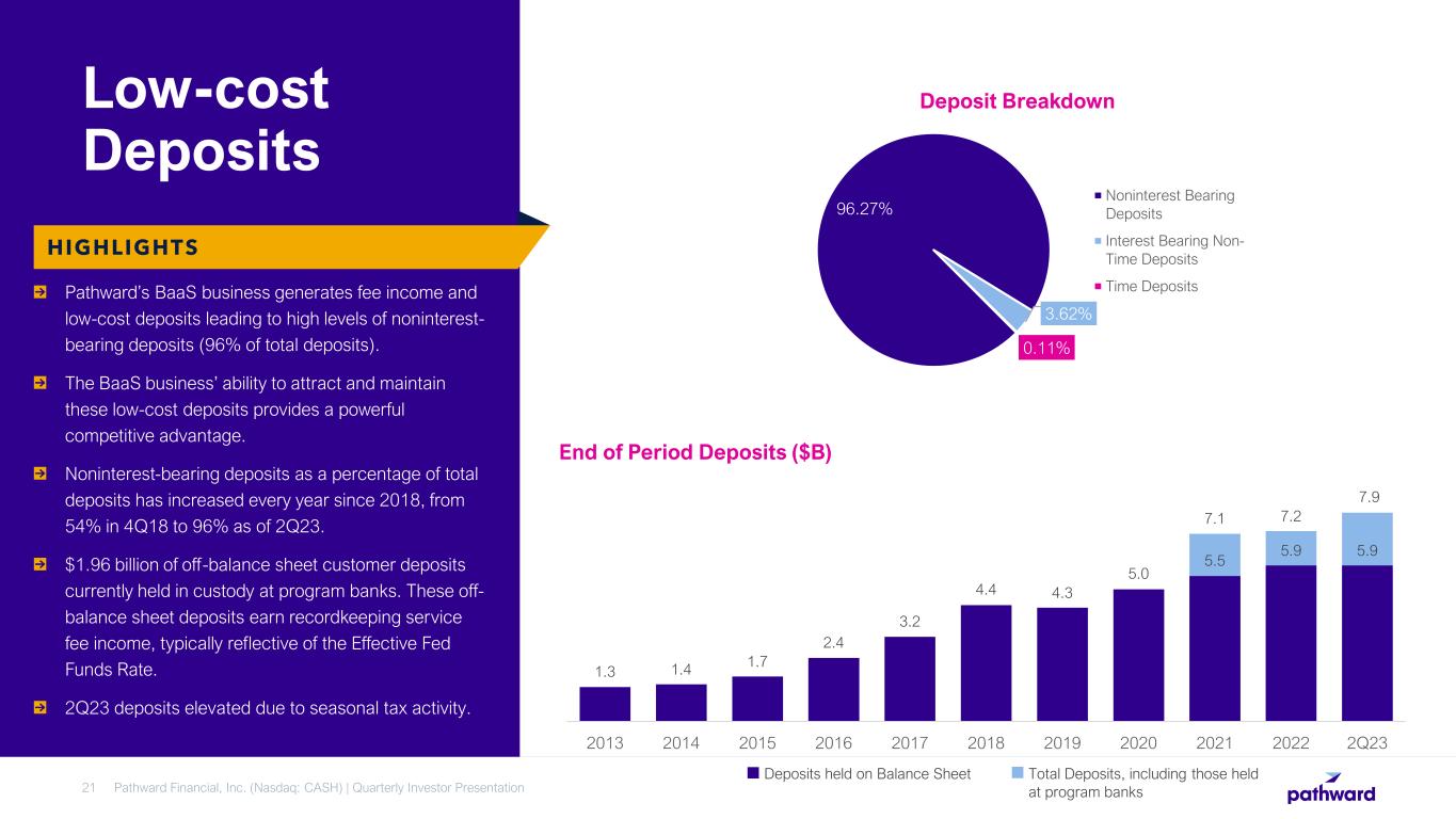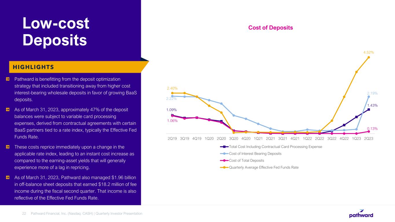 カード処理費用の増加は、banking as a service(以下「BaaS」)パートナーとの仕組まれた契約によるものです。これらの契約に基づき支払われる費用は、預金残高、フロアレート、市場環境、およびその他の業績条件により変動する合意されたレートインデックスに基づきます。一般にこの金利指数は、実効フェデラルファンド金利(以下「EFFR」)の平均50%から85%であり、EFFRの変動に伴い即座に再価格が決定されます。預金ポートフォリオの約47%がこのカード処理費用の増加の対象になっています。2023 年 3 月 31 日に終了した四半期において、これらの仕組まれた契約に関連するカード処理費用は 2040 万ドルで、2022 年 12 月 31 日に終了した四半期は 1400 万ドル、2022 年 3 月 31 日に終了した四半期は 0.2 百万ドルとなりました。