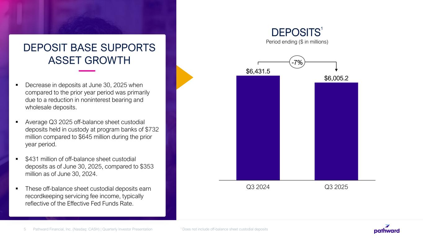 Included in card and deposit fees is servicing fee income on custodial deposits, which totaled $7.9 million during the 2025 fiscal third quarter, compared to $8.6 million for the same period of the prior year. For the fiscal quarter ended March 31, 2025, servicing fee income on custodial deposits totaled $6.5 million. The period-over-period decrease in servicing fee income on deposit balances held at partner banks was primarily due to a reduction in rates following reductions in the Effective Federal Funds Rate ("EFFR"). The sequential quarter increase in servicing fee income was due to an increase in custodial deposits.
