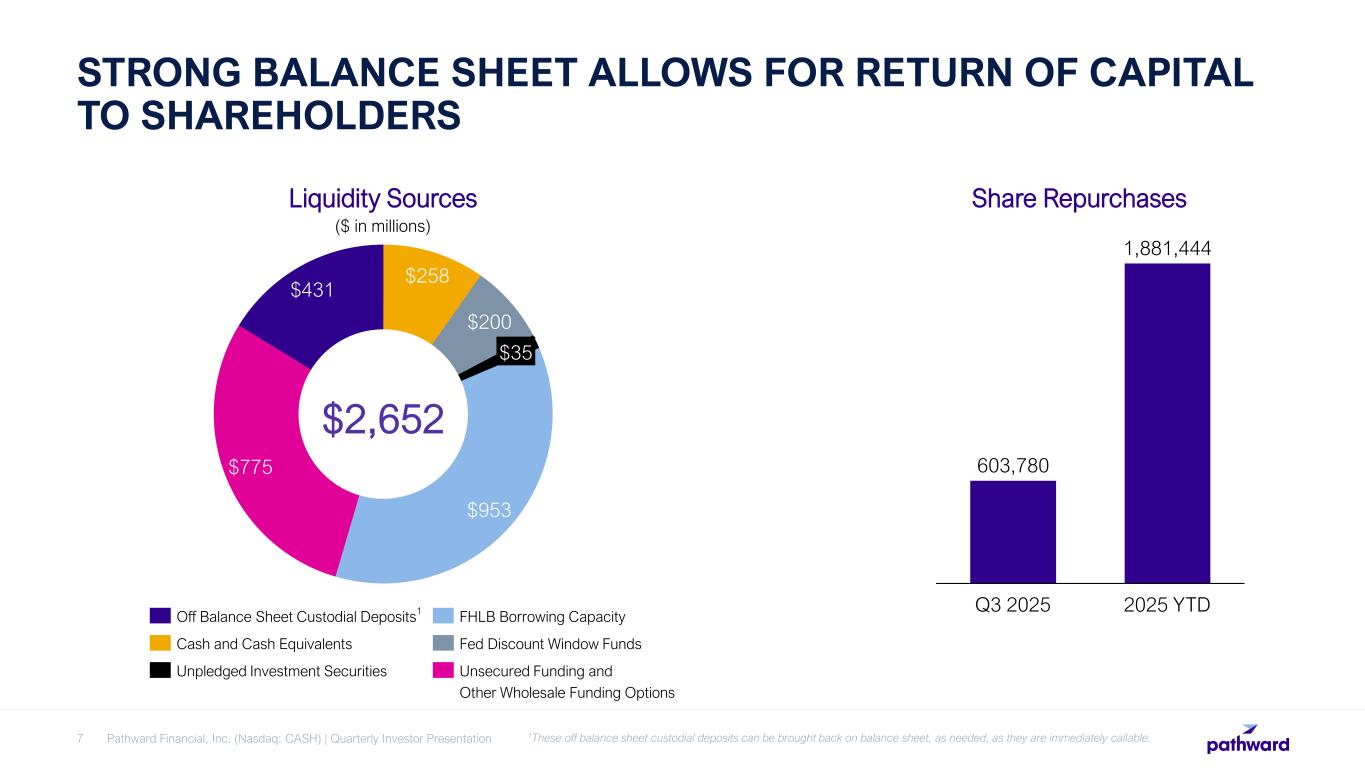 •Net interest margin ("NIM") increased 17 basis points to 7.43% for the third quarter from 7.26% during the same period last year, primarily driven by an improved earning asset mix from the continued balance sheet optimization. When including contractual, rate-related processing expenses associated with deposits on the Company's balance sheet, NIM would have been 5.98% in the fiscal 2025 third quarter compared to 5.76% during the fiscal 2024 third quarter. See non-GAAP reconciliation table below.