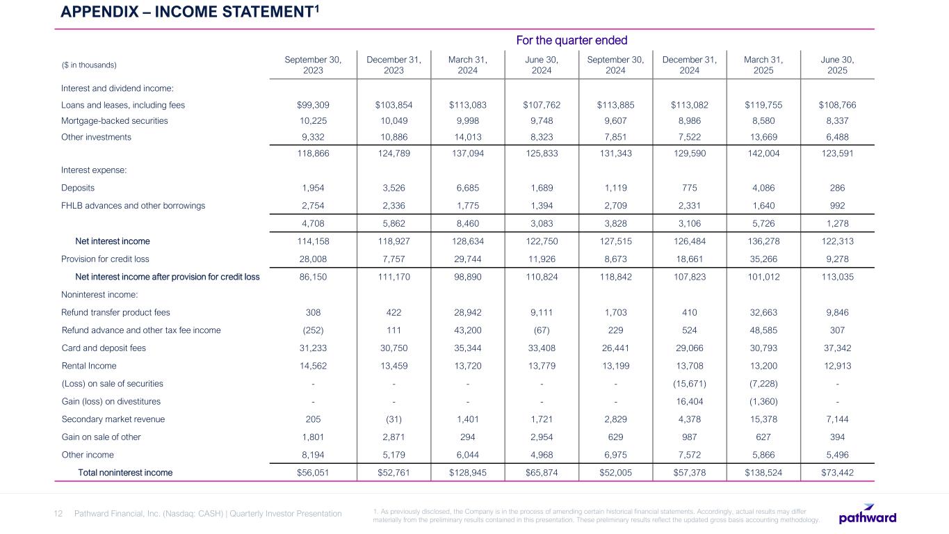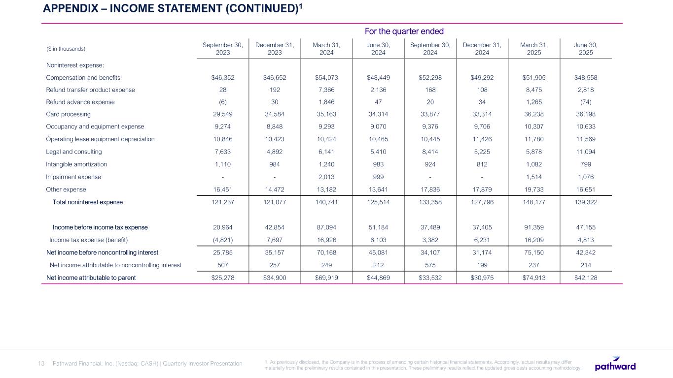 Sioux Falls, S.D., July 28, 2025 - Pathward Financial, Inc. (“Pathward Financial” or the “Company”) (Nasdaq: CASH) reported net income of $42.1 million, or $1.81 per share, for the three months ended June 30, 2025, compared to net income of $44.9 million, or $1.78 per share, for the three months ended June 30, 2024.
