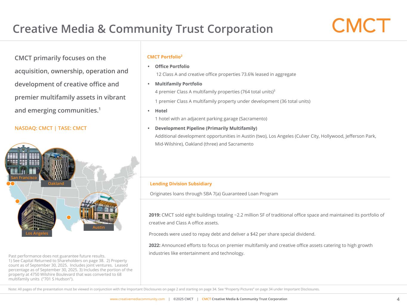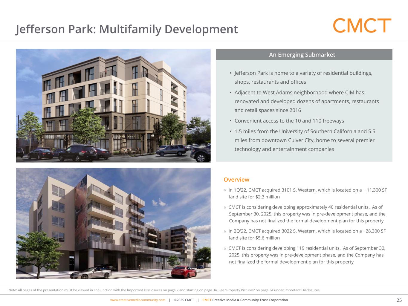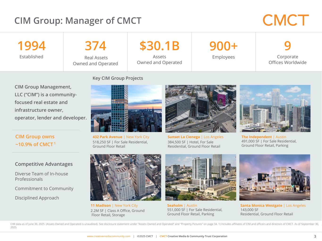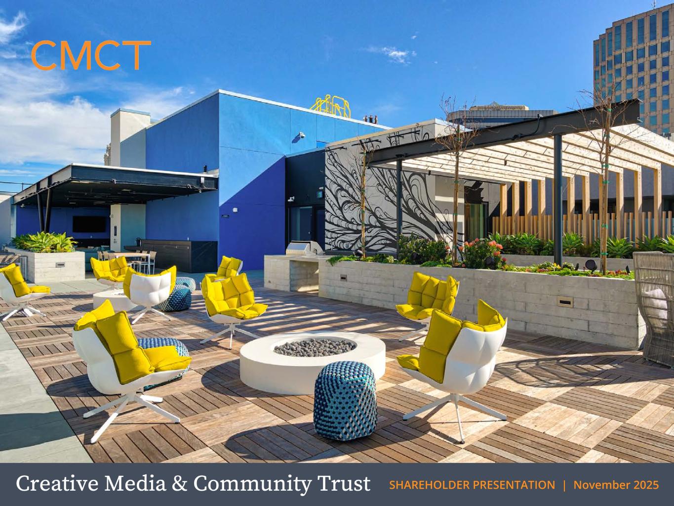 ダラス-(2025年11月14日)クリエイティブ・メディア・アンド・コミュニティ・トラスト・コーポレーション(NASDAQおよびTASE:CMCT)(「当社」、「当社」、「CMCT」または「当社」)は本日、2025年9月30日に終了した3ヶ月間の営業成績を発表した。