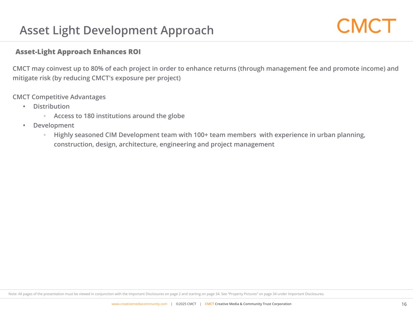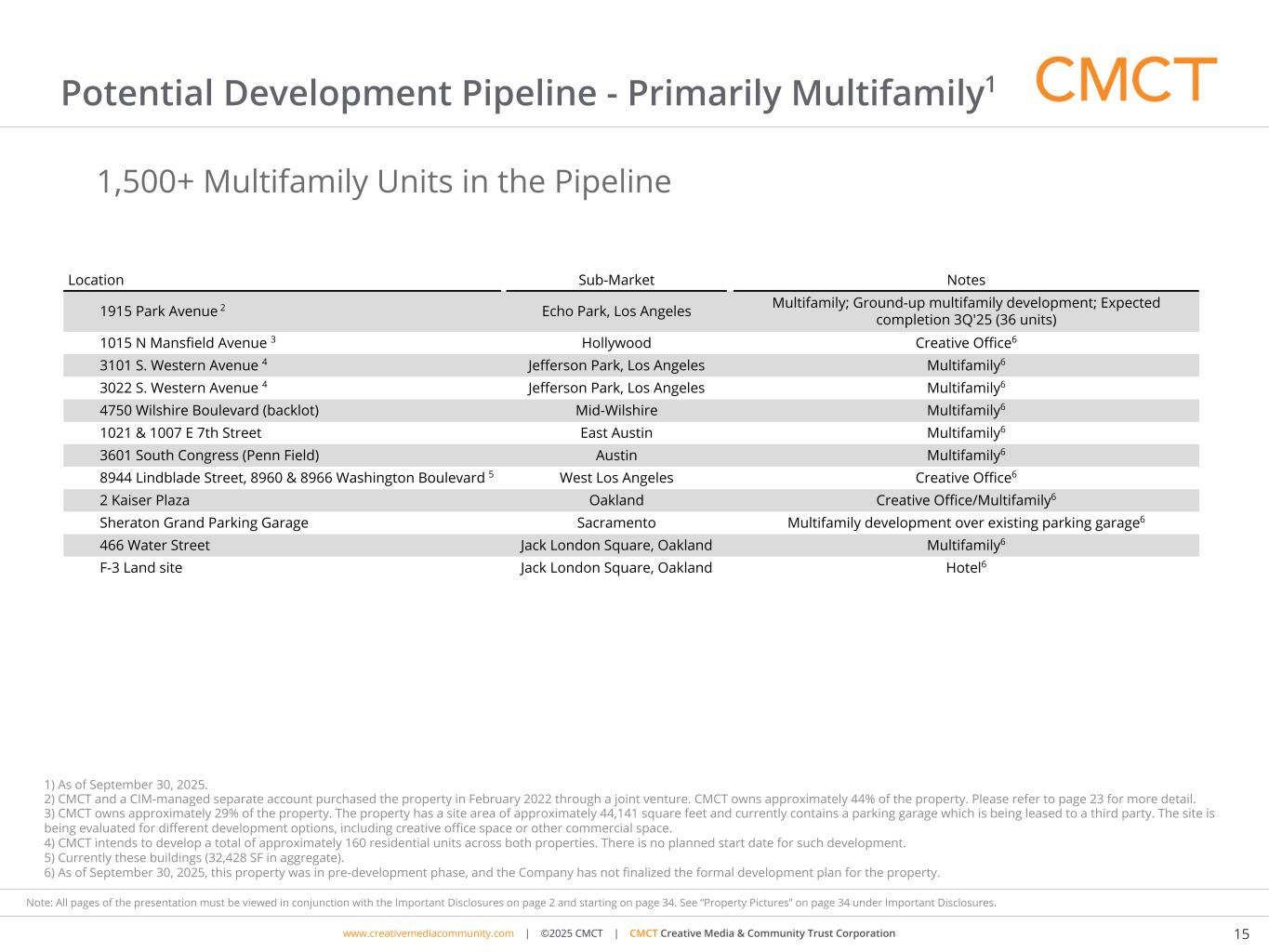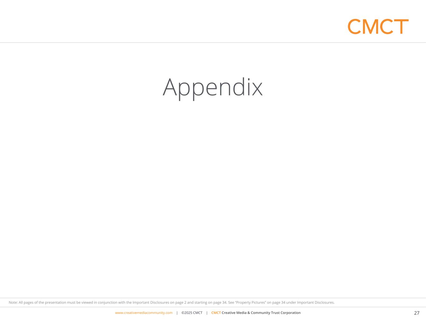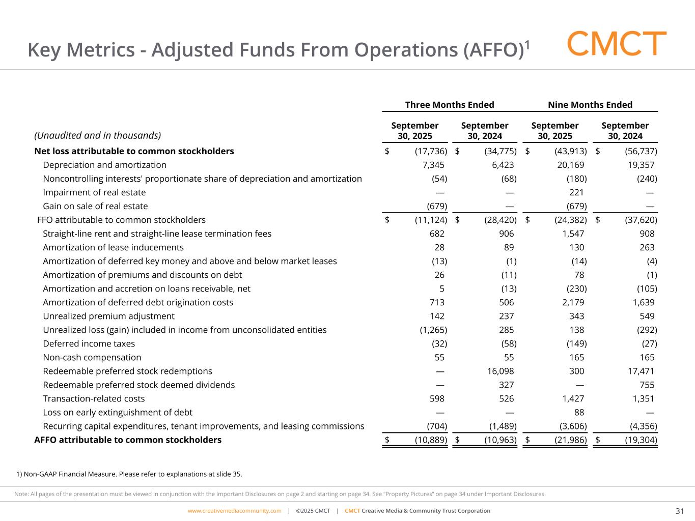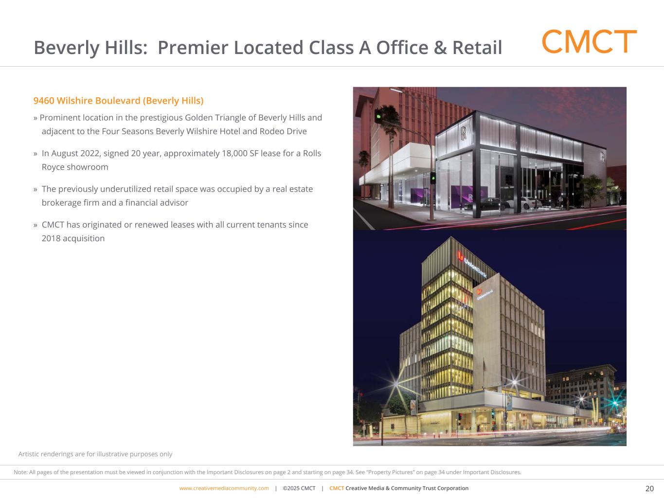 ダラス-(2025年11月14日)クリエイティブ・メディア・アンド・コミュニティ・トラスト・コーポレーション(NASDAQおよびTASE:CMCT)(「当社」、「当社」、「CMCT」または「当社」)は本日、2025年9月30日に終了した3ヶ月間の営業成績を発表した。