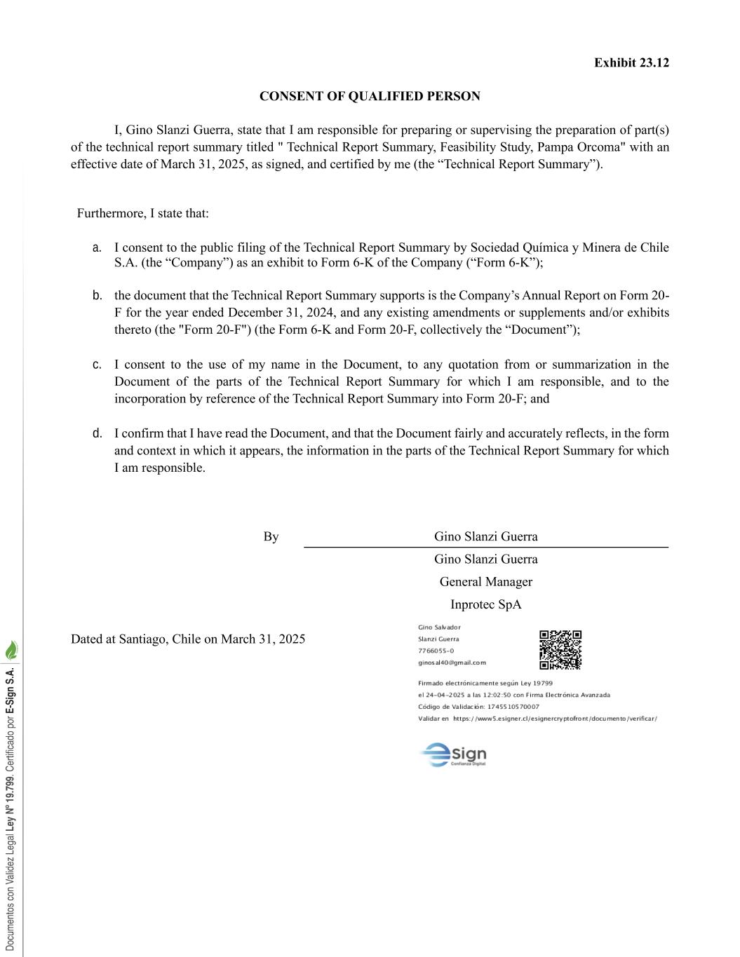 Exhibit 23.12 CONSENT OF QUALIFIED PERSON I, Gino Slanzi Guerra, state that I am responsible for preparing or supervising the preparation of part(s) of the technical report summary titled " Technical Report Summary, Feasibility Study, Pampa Orcoma" with an effective date of March 31, 2025, as signed, and certified by me (the “Technical Report Summary”). Furthermore, I state that: a. I consent to the public filing of the Technical Report Summary by Sociedad Química y Minera de Chile S.A. (the “Company”) as an exhibit to Form 6-K of the Company (“Form 6-K”); b. the document that the Technical Report Summary supports is the Company’s Annual Report on Form 20- F for the year ended December 31, 2024, and any existing amendments or supplements and/or exhibits thereto (the "Form 20-F") (the Form 6-K and Form 20-F, collectively the “Document”); c. I consent to the use of my name in the Document, to any quotation from or summarization in the Document of the parts of the Technical Report Summary for which I am responsible, and to the incorporation by reference of the Technical Report Summary into Form 20-F; and d. I confirm that I have read the Document, and that the Document fairly and accurately reflects, in the form and context in which it appears, the information in the parts of the Technical Report Summary for which I am responsible. By Gino Slanzi Guerra Gino Slanzi Guerra General Manager Inprotec SpA Dated at Santiago, Chile on March 31, 2025