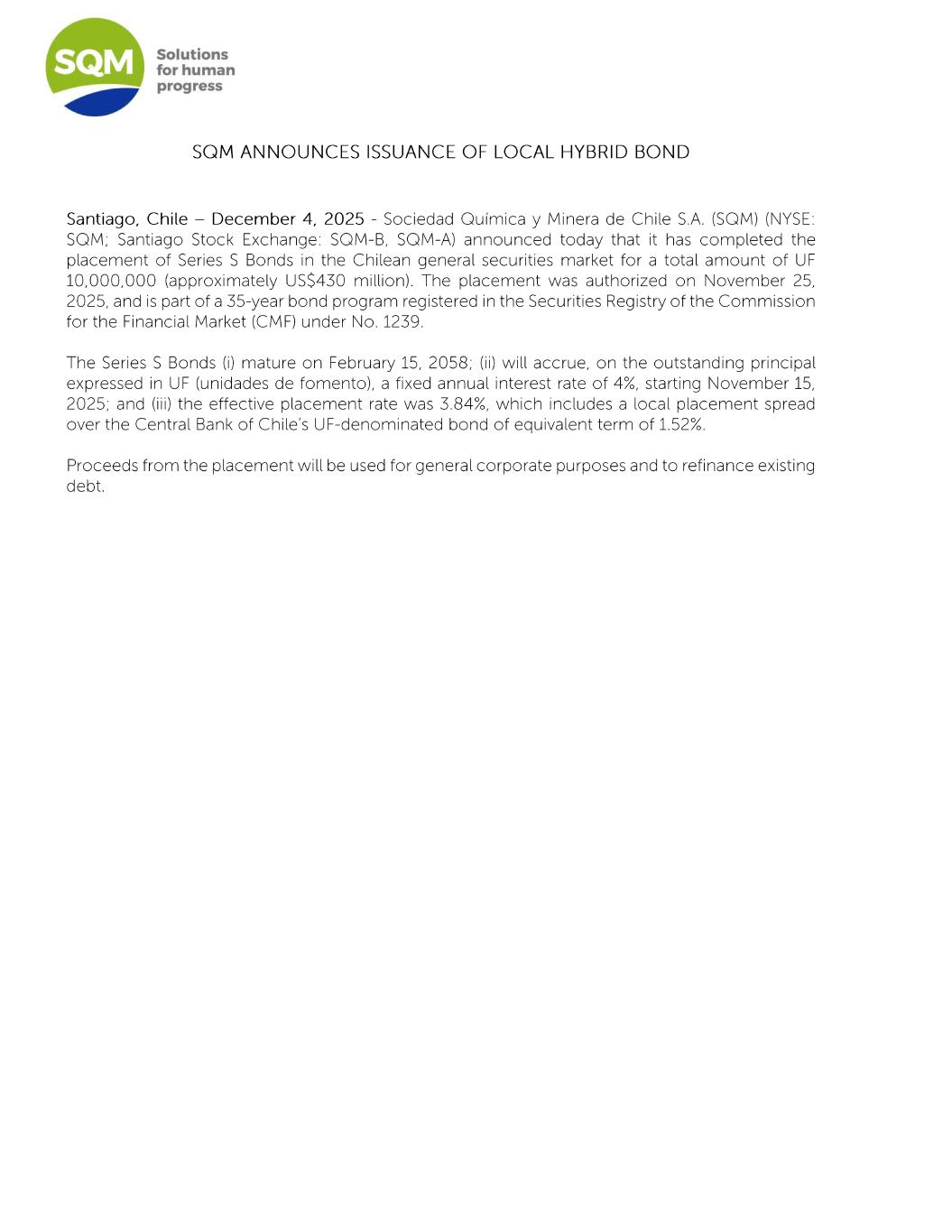 SQM ANNOUNCES ISSUANCE OF LOCAL HYBRID BOND Santiago, Chile – D ecember 4 , 20 25 - Sociedad Química y Minera de Chile S.A. (SQM) (NYSE: SQM; Santiago Stock Exchange: SQM -B, SQM -A) announced today that it has completed the placement of Series S Bonds in the Chilean general securities market for a total amount of UF 10,000,000 (approximately US$430 millio n). The placement was authorized on November 25, 2025, and is part of a 35 -year bond program registered in the Securities Registry of the Commission for the Financial Market (CMF) under No. 1239. The Series S Bonds (i ) mature on February 15, 2058; (ii) will accrue, on the outstanding principal expressed in UF (unidades de fomento ), a fixed annual interest rate of 4%, starting November 15, 2025; and (iii) the effective placement rate was 3.84%, which includes a local placement spread over the Central Bank of Chile’s UF -denominated bond of equivalent term of 1.52% . Proceeds from the placement will be used for general corporate purposes and to refinance existing debt.