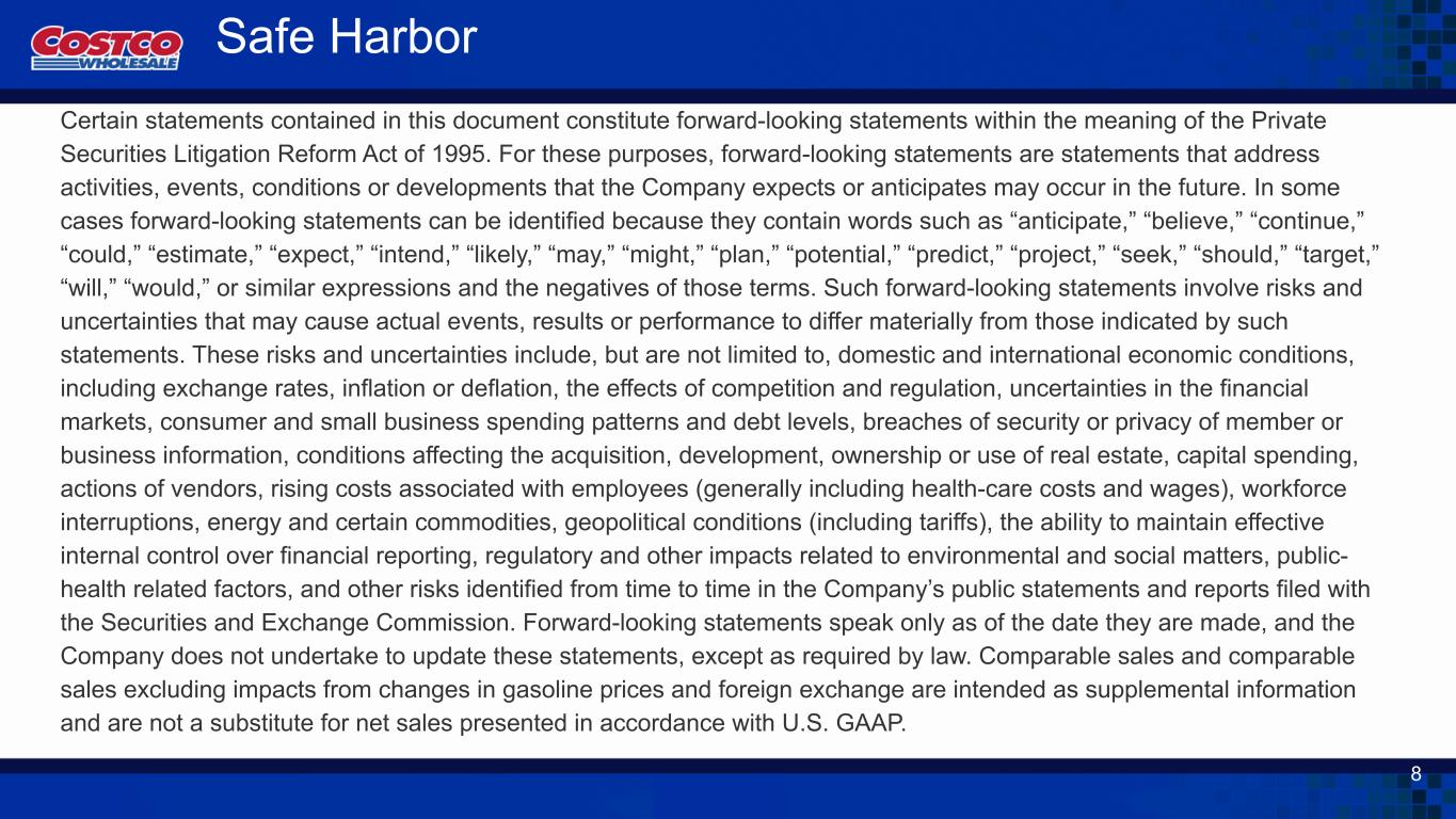 本書に含まれる一部の記述は、1995年米国私募証券訴訟改革法の定義における将来予想に関する記述に該当します。これらの目的上、将来予想に関する記述とは、当社が将来発生する可能性があると予想または予測する活動、事象、状況、または展開に関する記述を指します。将来予想に関する記述は、「予想する」、「信じる」、「継続する」、「可能性がある」、「推定する」、「期待する」、「意図する」、「可能性が高い」、「かもしれない」、「計画する」、「可能性がある」、「予測する」、「プロジェクトする」、「求める」、「はずである」、「目標する」、「する予定である」、「だろう」、または類似の表現およびそれらの否定語を含むため、特定できる場合があります。このような将来の見通しに関する記述には、リスクや不確実性が含まれており、実際の出来事、結果、または業績は、このような記述によって示されたものとは大きく異なる可能性があります。こうしたリスクや不確実性には、為替レート、インフレまたはデフレ、競争や規制の影響、金融市場の不確実性、消費者および中小企業の消費パターンおよび債務水準、会員または事業情報のセキュリティまたはプライバシーの侵害、不動産の取得、開発、所有または使用に影響を与える状況、設備投資、業者の行動など、国内外の経済状況が含まれますが、これらに限定されるものではありません、従業員に関連するコストの上昇(一般的に医療費および賃金を含む)、労働力の中断、エネルギーおよび特定の商品、地政学的状況(関税を含む)、財務報告に対する効果的な内部統制を維持する能力、環境および社会的事項に関する規制およびその他の影響、公衆衛生関連要因、および証券取引委員会に提出された当社の公式声明および報告書で随時特定されるその他のリスク。将来の見通しに関する記述は、それらが作成された時点のものであり、当社は、法律で義務付けられている場合を除き、これらの記述を更新する義務を負いません。ガソリン価格および外国為替の変動による影響を除いた比較可能売上高および比較可能売上高は、補足的な情報を意図したものであり、米国会計基準に準拠して表示された売上高の代わりとなるものではありません。