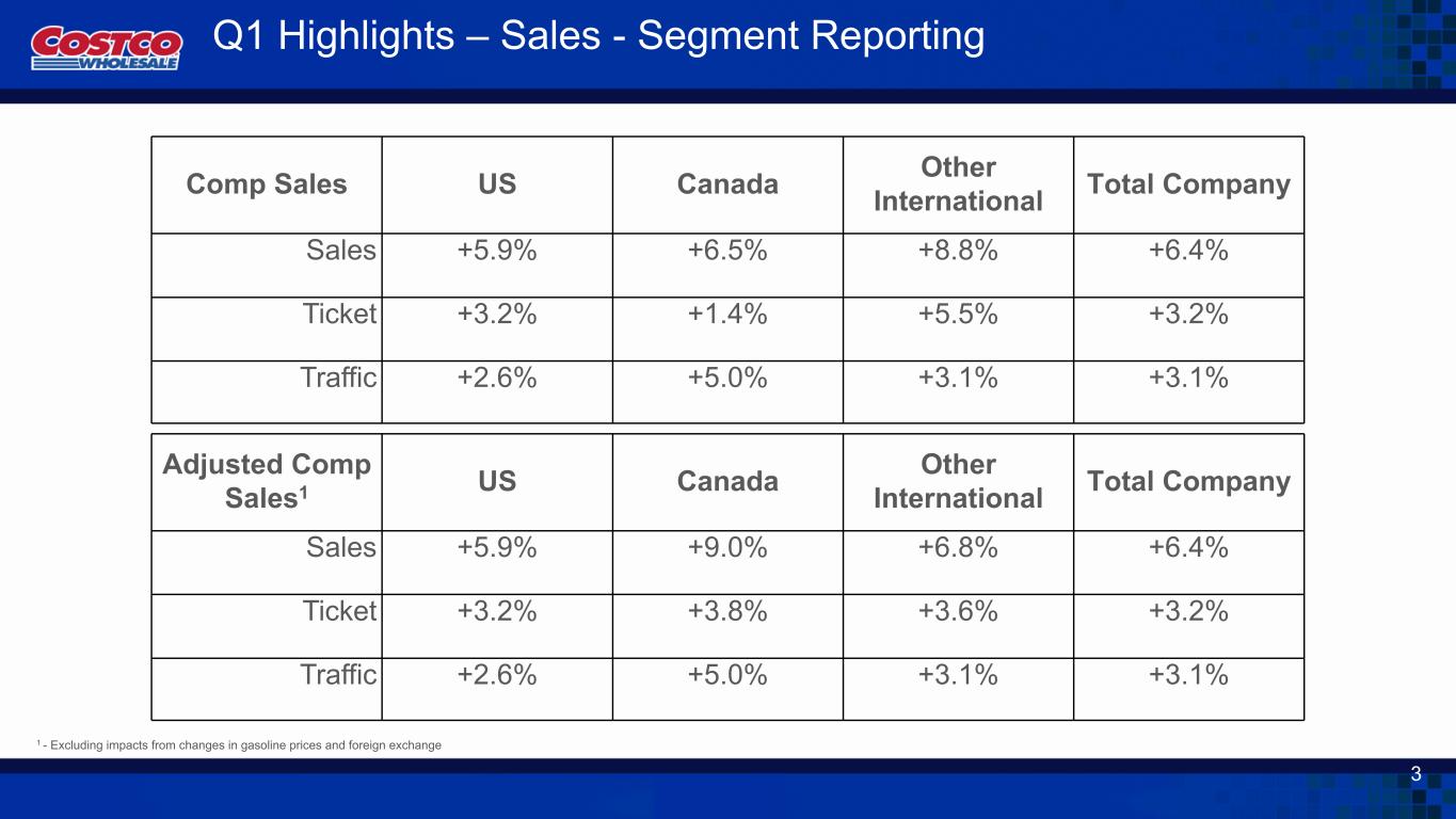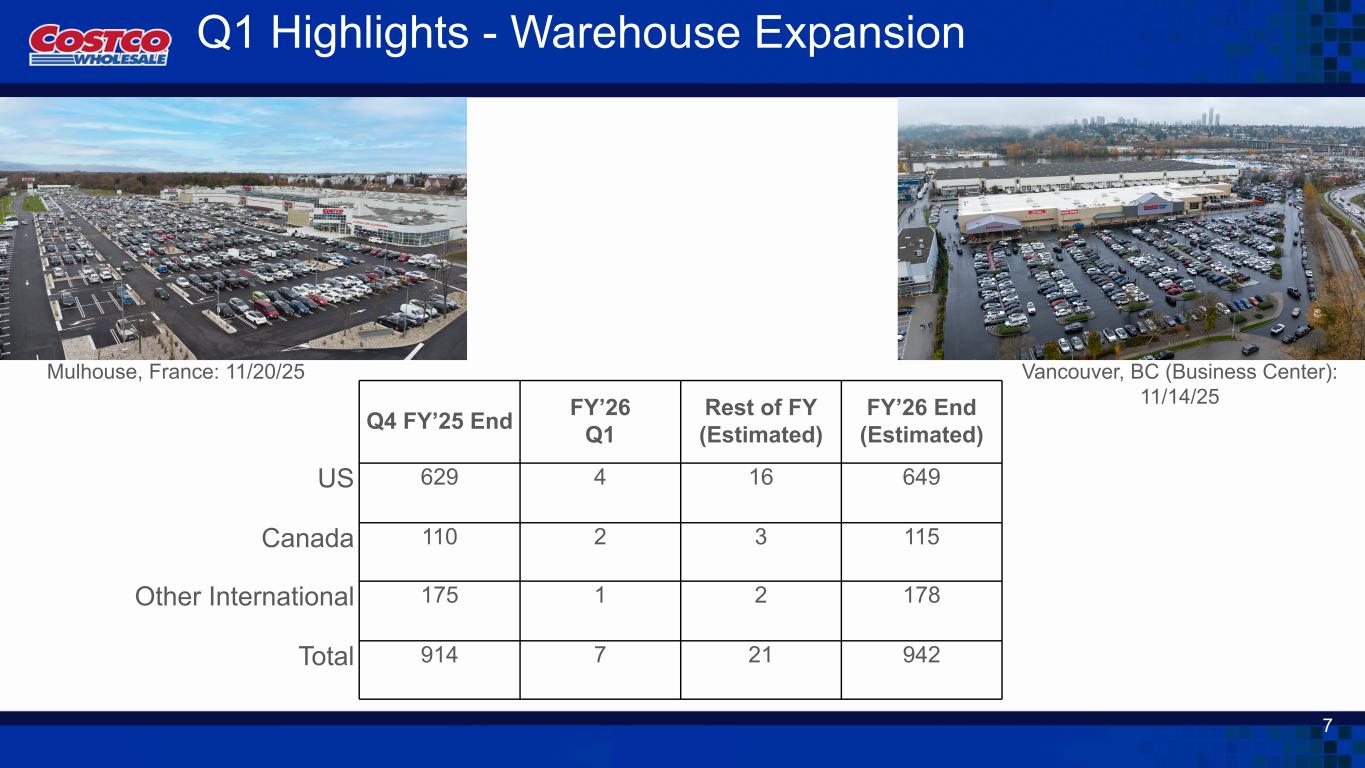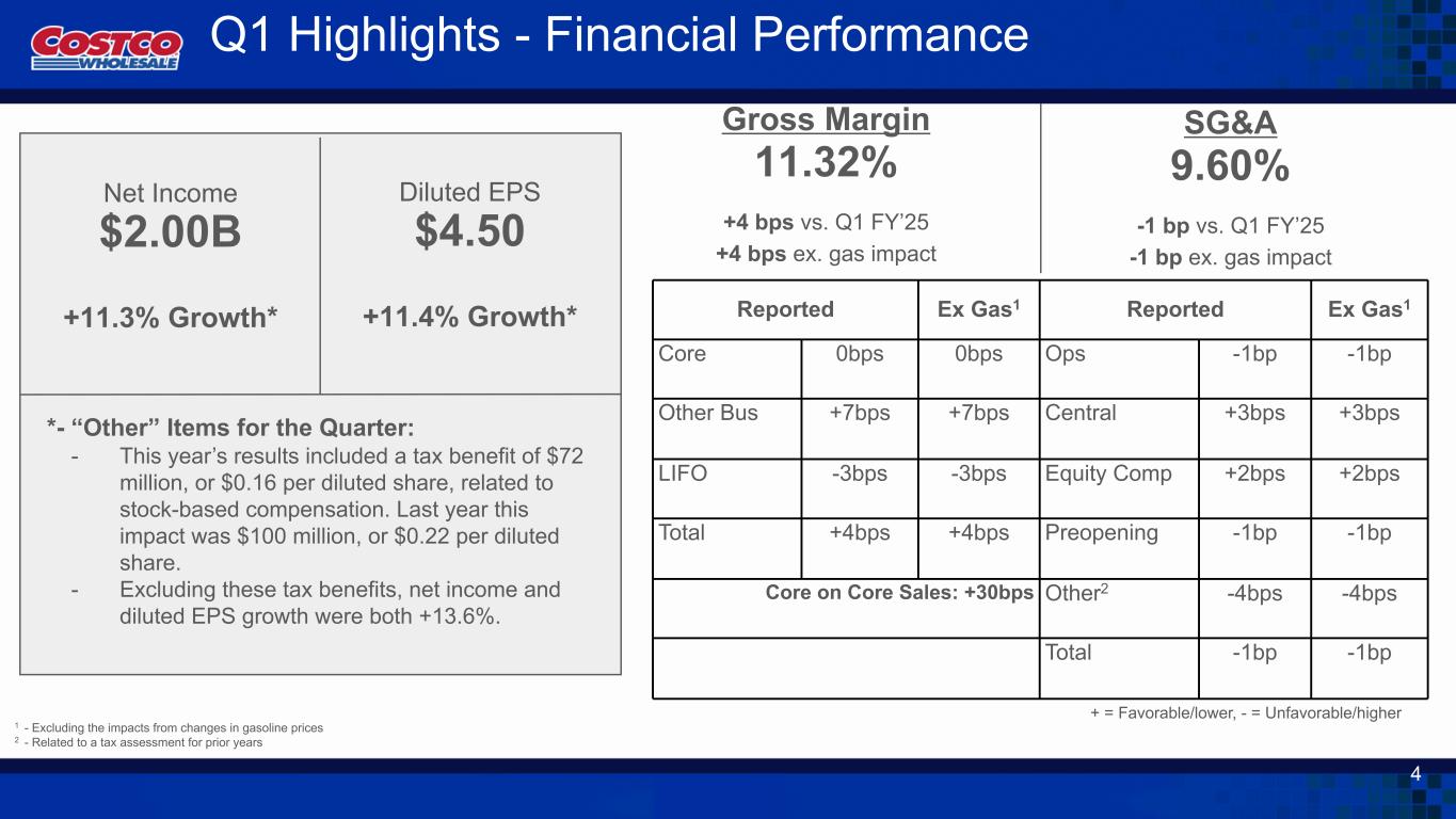 ワシントン州イサクア、2025年12月11日 - コストコホールセールコーポレーション(Nasdaq: COST)は本日、2025年11月23日を期末とする2026年度第1四半期(12週間)の業績を発表しました。