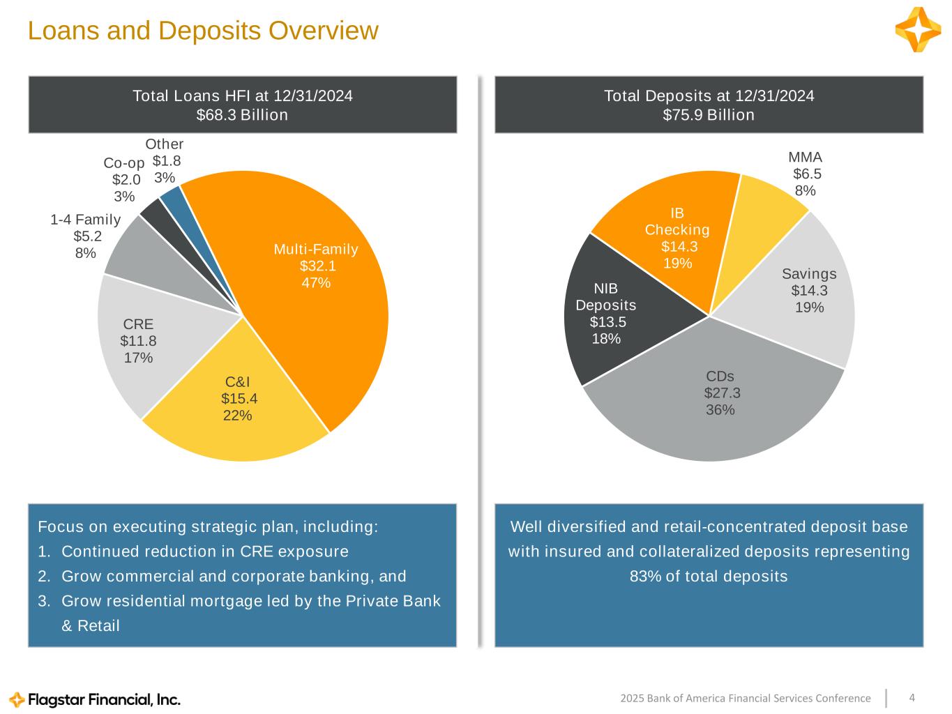 32025 Bank of America Financial Services Conference Flagstar Financial, Inc. Overview $100B Assets $76B Deposits $68B Loans HFI 1.78% Total ACL to LHFI 11.9% CET1 Ratio Branch Footprint • Over 400 branches with strong presence in the Northeast and Midwest and exposure to high growth markets in the Southeast and West Coast Consumer & Small Business • Private Bank high touch single-PoC model • Relationship-focused commercial and corporate banking model, with deep industry expertise Commercial & Private Banking • Multi-family loan portfolio primarily non-luxury, rent-regulated buildings in New York City • CRE includes diversified property types which are primarily income producing Commercial Real Estate Business Verticals
