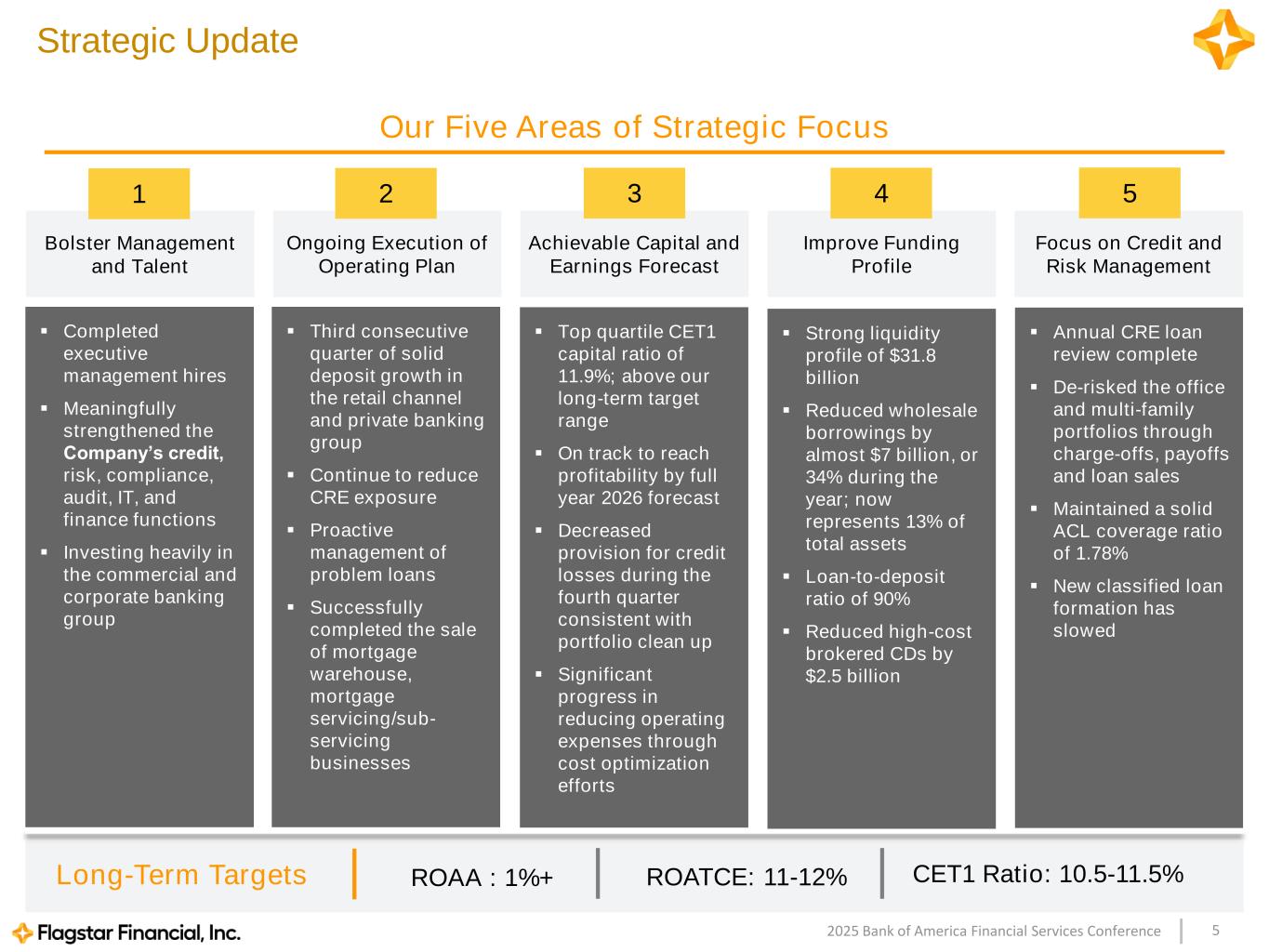 52025 Bank of America Financial Services Conference Our Five Areas of Strategic Focus Long-Term Targets Strategic Update ▪ Top quartile CET1 capital ratio of 11.9%; above our long-term target range ▪ On track to reach profitability by full year 2026 forecast ▪ Decreased provision for credit losses during the fourth quarter consistent with portfolio clean up ▪ Significant progress in reducing operating expenses through cost optimization efforts Achievable Capital and Earnings Forecast ▪ Annual CRE loan review complete ▪ De-risked the office and multi-family portfolios through charge-offs, payoffs and loan sales ▪ Maintained a solid ACL coverage ratio of 1.78% ▪ New classified loan formation has slowed Improve Funding Profile ▪ Strong liquidity profile of $31.8 billion ▪ Reduced wholesale borrowings by almost $7 billion, or 34% during the year; now represents 13% of total assets ▪ Loan-to-deposit ratio of 90% ▪ Reduced high-cost brokered CDs by $2.5 billion Focus on Credit and Risk Management ▪ Third consecutive quarter of solid deposit growth in the retail channel and private banking group ▪ Continue to reduce CRE exposure ▪ Proactive management of problem loans ▪ Successfully completed the sale of mortgage warehouse, mortgage servicing/sub- servicing businesses Ongoing Execution of Operating Plan ▪ Completed executive management hires ▪ Meaningfully strengthened the Company’s credit, risk, compliance, audit, IT, and finance functions ▪ Investing heavily in the commercial and corporate banking group Bolster Management and Talent ROAA : 1%+ ROATCE: 11-12% CET1 Ratio: 10.5-11.5% 1 2 3 4 5