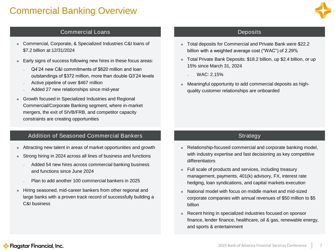 62025 Bank of America Financial Services Conference Improve Earnings Profile ▪ NIM expansion | downward deposit repricing ▪ Moderating credit costs ▪ Reduce operating expenses(1) by almost $600 million, or 23%, through operational efficiencies Execute on C&I and Private Bank Growth Initiatives ▪ Grow primary bank relationships ▪ Deploy expanded product offerings and capabilities into middle market, corporate, and specialized lending verticals Proactive Management of CRE Portfolio • Continue reduction in CRE concentration • Opportunistic loan sales to reduce NPLs Credit Normalization • Lower NCOs and provision for credit losses • Slowdown of new problem loan formation Management Focus Areas in 2025 2024 Accomplishments (Transitional Year) Assembled a Strong Management Team and Board of Directors Invested in Key Growth and Risk Management Initiatives Strengthened Capital Position and Improved Funding Profile ▪ Increased CET1 ratio over 280 basis points during the year ▪ Significantly reduced wholesale funding and brokered deposits Executed Robust Loan Portfolio Review ▪ Supplemented reserve build with additional charge-offs ▪ Utilized payoffs and loan sales to reduce problem loan exposure Improved Profitability ▪ Executed expense optimization plan ▪ Reduced funding costs Well Positioned in 2025 Due to Significant Accomplishments in 2024 Note: See cautionary statements on page 2 Note 1: Excludes impact from intangible asset amortization and merger-related expenses