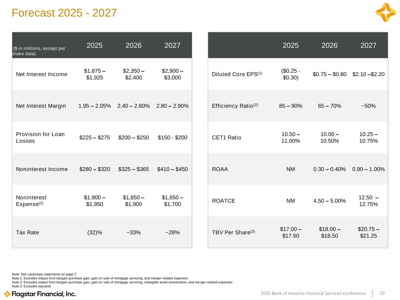 102025 Bank of America Financial Services Conference 2025 2026 2027 Diluted Core EPS(1) ($0.25 - $0.30) $0.75 – $0.80 $2.10 –$2.20 Efficiency Ratio(2) 85 – 90% 65 – 70% ~50% CET1 Ratio 10.50 – 11.00% 10.00 – 10.50% 10.25 – 10.75% ROAA NM 0.30 – 0.40% 0.90 – 1.00% ROATCE NM 4.50 – 5.00% 12.50 – 12.75% TBV Per Share(3) $17.00 – $17.50 $18.00 – $18.50 $20.75 – $21.25 Forecast 2025 - 2027 Note: See cautionary statements on page 2 Note 1: Excludes impact from bargain purchase gain, gain on sale of mortgage servicing, and merger-related expenses Note 2: Excludes impact from bargain purchase gain, gain on sale of mortgage servicing, intangible asset amortization, and merger-related expenses Note 3: Excludes warrants ($ in millions, except per share data) 2025 2026 2027 Net Interest Income $1,875 – $1,925 $2,350 – $2,400 $2,900 – $3,000 Net Interest Margin 1.95 – 2.05% 2.40 – 2.60% 2.80 – 2.90% Provision for Loan Losses $225 – $275 $200 – $250 $150 - $200 Noninterest Income $280 – $320 $325 – $365 $410 – $450 Noninterest Expense(2) $1,900 – $1,950 $1,850 – $1,900 $1,650 – $1,700 Tax Rate (32)% ~33% ~28%