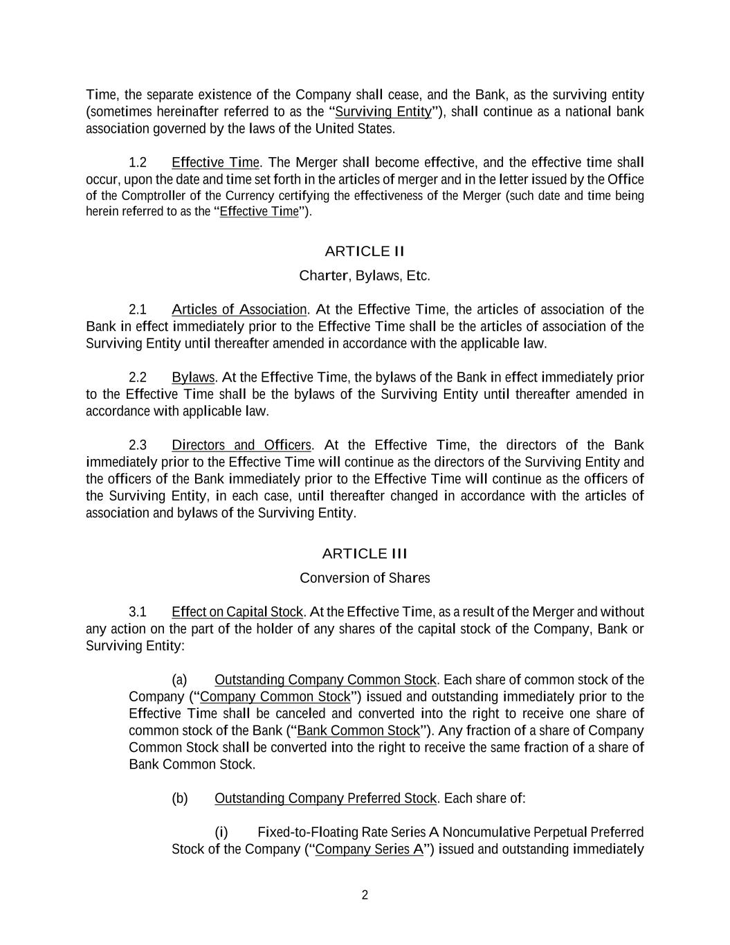 2 Time, the separate existence of the Company shall cease, and the Bank, as the surviving entity (sometimes hereinafter referred to as the “Surviving Entity”), shall continue as a national bank association governed by the laws of the United States. 1.2 Effective Time. The Merger shall become effective, and the effective time shall occur, upon the date and time set forth in the articles of merger and in the letter issued by the Office of the Comptroller of the Currency certifying the effectiveness of the Merger (such date and time being herein referred to as the “Effective Time”). ARTICLE II Charter, Bylaws, Etc. 2.1 Articles of Association. At the Effective Time, the articles of association of the Bank in effect immediately prior to the Effective Time shall be the articles of association of the Surviving Entity until thereafter amended in accordance with the applicable law. 2.2 Bylaws. At the Effective Time, the bylaws of the Bank in effect immediately prior to the Effective Time shall be the bylaws of the Surviving Entity until thereafter amended in accordance with applicable law. 2.3 Directors and Officers. At the Effective Time, the directors of the Bank immediately prior to the Effective Time will continue as the directors of the Surviving Entity and the officers of the Bank immediately prior to the Effective Time will continue as the officers of the Surviving Entity, in each case, until thereafter changed in accordance with the articles of association and bylaws of the Surviving Entity. ARTICLE III Conversion of Shares 3.1 Effect on Capital Stock. At the Effective Time, as a result of the Merger and without any action on the part of the holder of any shares of the capital stock of the Company, Bank or Surviving Entity: (a) Outstanding Company Common Stock. Each share of common stock of the Company (“Company Common Stock”) issued and outstanding immediately prior to the Effective Time shall be canceled and converted into the right to receive one share of common stock of the Bank (“Bank Common Stock”). Any fraction of a share of Company Common Stock shall be converted into the right to receive the same fraction of a share of Bank Common Stock. (b) Outstanding Company Preferred Stock. Each share of: (i) Fixed-to-Floating Rate Series A Noncumulative Perpetual Preferred Stock of the Company (“Company Series A”) issued and outstanding immediately