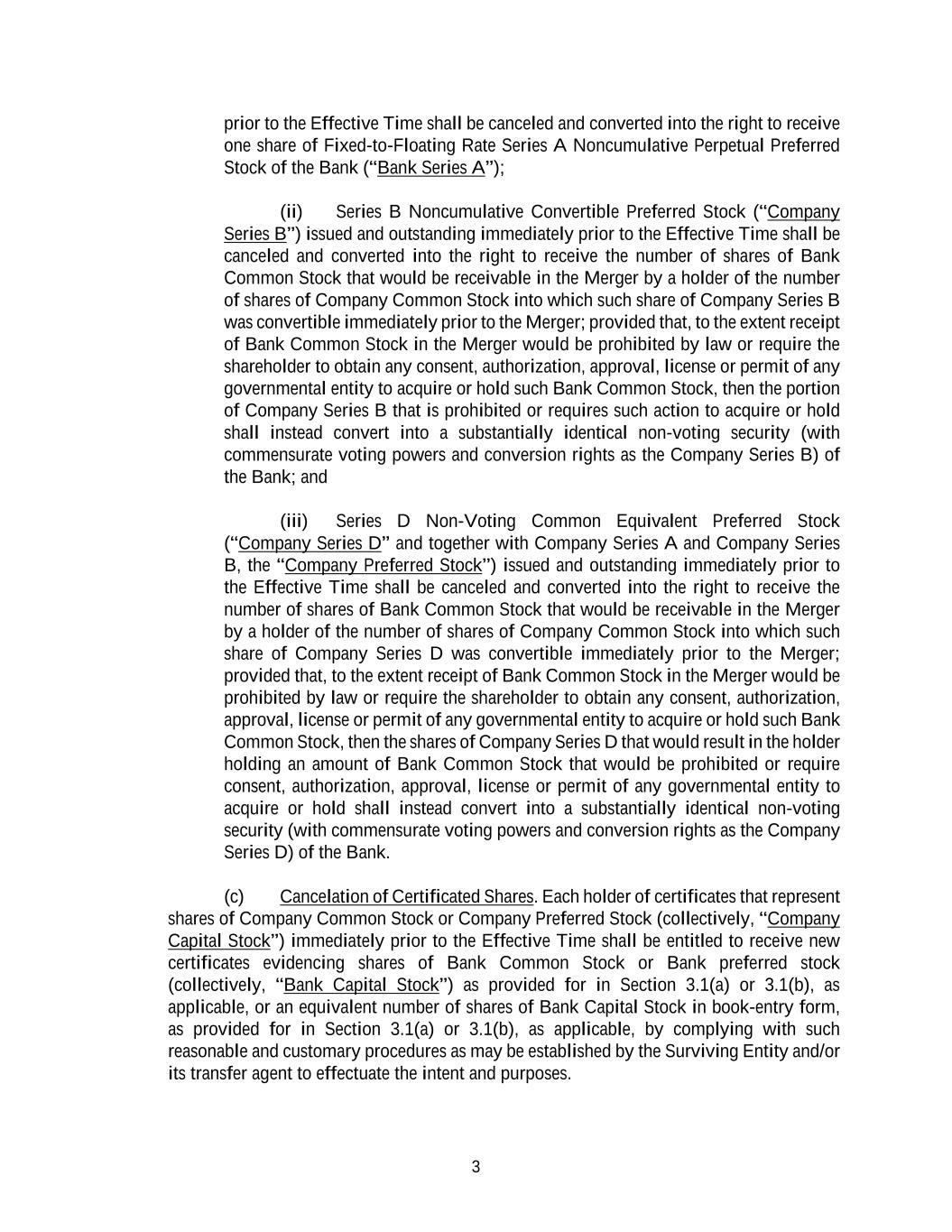 3 prior to the Effective Time shall be canceled and converted into the right to receive one share of Fixed-to-Floating Rate Series A Noncumulative Perpetual Preferred Stock of the Bank (“Bank Series A”); (ii) Series B Noncumulative Convertible Preferred Stock (“Company Series B”) issued and outstanding immediately prior to the Effective Time shall be canceled and converted into the right to receive the number of shares of Bank Common Stock that would be receivable in the Merger by a holder of the number of shares of Company Common Stock into which such share of Company Series B was convertible immediately prior to the Merger; provided that, to the extent receipt of Bank Common Stock in the Merger would be prohibited by law or require the shareholder to obtain any consent, authorization, approval, license or permit of any governmental entity to acquire or hold such Bank Common Stock, then the portion of Company Series B that is prohibited or requires such action to acquire or hold shall instead convert into a substantially identical non-voting security (with commensurate voting powers and conversion rights as the Company Series B) of the Bank; and (iii) Series D Non-Voting Common Equivalent Preferred Stock (“Company Series D” and together with Company Series A and Company Series B, the “Company Preferred Stock”) issued and outstanding immediately prior to the Effective Time shall be canceled and converted into the right to receive the number of shares of Bank Common Stock that would be receivable in the Merger by a holder of the number of shares of Company Common Stock into which such share of Company Series D was convertible immediately prior to the Merger; provided that, to the extent receipt of Bank Common Stock in the Merger would be prohibited by law or require the shareholder to obtain any consent, authorization, approval, license or permit of any governmental entity to acquire or hold such Bank Common Stock, then the shares of Company Series D that would result in the holder holding an amount of Bank Common Stock that would be prohibited or require consent, authorization, approval, license or permit of any governmental entity to acquire or hold shall instead convert into a substantially identical non-voting security (with commensurate voting powers and conversion rights as the Company Series D) of the Bank. (c) Cancelation of Certificated Shares. Each holder of certificates that represent shares of Company Common Stock or Company Preferred Stock (collectively, “Company Capital Stock”) immediately prior to the Effective Time shall be entitled to receive new certificates evidencing shares of Bank Common Stock or Bank preferred stock (collectively, “Bank Capital Stock”) as provided for in Section 3.1(a) or 3.1(b), as applicable, or an equivalent number of shares of Bank Capital Stock in book-entry form, as provided for in Section 3.1(a) or 3.1(b), as applicable, by complying with such reasonable and customary procedures as may be established by the Surviving Entity and/or its transfer agent to effectuate the intent and purposes.