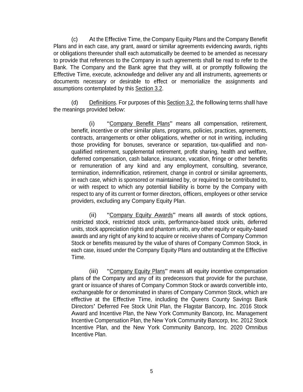 5 (c) At the Effective Time, the Company Equity Plans and the Company Benefit Plans and in each case, any grant, award or similar agreements evidencing awards, rights or obligations thereunder shall each automatically be deemed to be amended as necessary to provide that references to the Company in such agreements shall be read to refer to the Bank. The Company and the Bank agree that they will, at or promptly following the Effective Time, execute, acknowledge and deliver any and all instruments, agreements or documents necessary or desirable to effect or memorialize the assignments and assumptions contemplated by this Section 3.2. (d) Definitions. For purposes of this Section 3.2, the following terms shall have the meanings provided below: (i) “Company Benefit Plans” means all compensation, retirement, benefit, incentive or other similar plans, programs, policies, practices, agreements, contracts, arrangements or other obligations, whether or not in writing, including those providing for bonuses, severance or separation, tax-qualified and non- qualified retirement, supplemental retirement, profit sharing, health and welfare, deferred compensation, cash balance, insurance, vacation, fringe or other benefits or remuneration of any kind and any employment, consulting, severance, termination, indemnification, retirement, change in control or similar agreements, in each case, which is sponsored or maintained by, or required to be contributed to, or with respect to which any potential liability is borne by the Company with respect to any of its current or former directors, officers, employees or other service providers, excluding any Company Equity Plan. (ii) “Company Equity Awards” means all awards of stock options, restricted stock, restricted stock units, performance-based stock units, deferred units, stock appreciation rights and phantom units, any other equity or equity-based awards and any right of any kind to acquire or receive shares of Company Common Stock or benefits measured by the value of shares of Company Common Stock, in each case, issued under the Company Equity Plans and outstanding at the Effective Time. (iii) “Company Equity Plans” means all equity incentive compensation plans of the Company and any of its predecessors that provide for the purchase, grant or issuance of shares of Company Common Stock or awards convertible into, exchangeable for or denominated in shares of Company Common Stock, which are effective at the Effective Time, including the Queens County Savings Bank Directors’ Deferred Fee Stock Unit Plan, the Flagstar Bancorp, Inc. 2016 Stock Award and Incentive Plan, the New York Community Bancorp, Inc. Management Incentive Compensation Plan, the New York Community Bancorp, Inc. 2012 Stock Incentive Plan, and the New York Community Bancorp, Inc. 2020 Omnibus Incentive Plan.