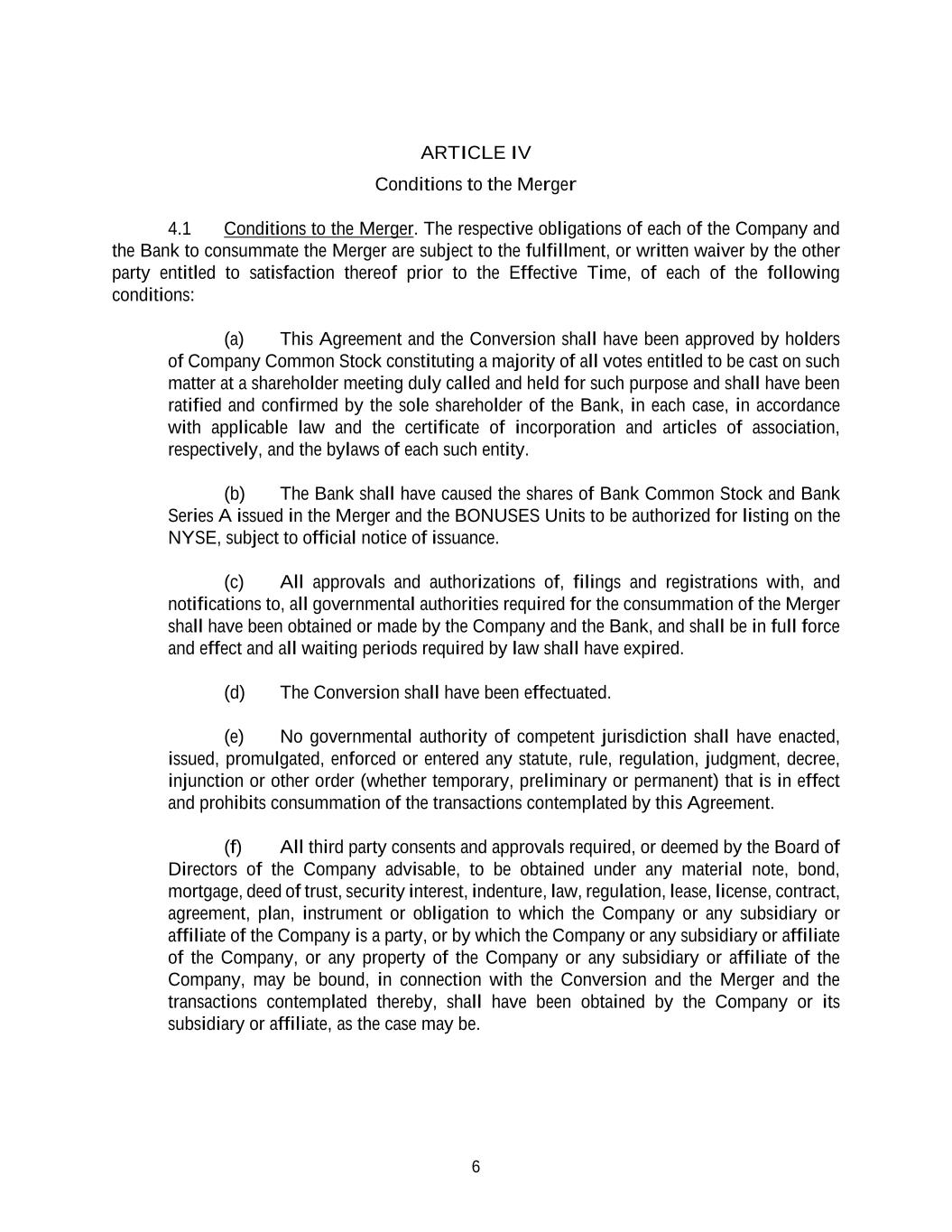 6 ARTICLE IV Conditions to the Merger 4.1 Conditions to the Merger. The respective obligations of each of the Company and the Bank to consummate the Merger are subject to the fulfillment, or written waiver by the other party entitled to satisfaction thereof prior to the Effective Time, of each of the following conditions: (a) This Agreement and the Conversion shall have been approved by holders of Company Common Stock constituting a majority of all votes entitled to be cast on such matter at a shareholder meeting duly called and held for such purpose and shall have been ratified and confirmed by the sole shareholder of the Bank, in each case, in accordance with applicable law and the certificate of incorporation and articles of association, respectively, and the bylaws of each such entity. (b) The Bank shall have caused the shares of Bank Common Stock and Bank Series A issued in the Merger and the BONUSES Units to be authorized for listing on the NYSE, subject to official notice of issuance. (c) All approvals and authorizations of, filings and registrations with, and notifications to, all governmental authorities required for the consummation of the Merger shall have been obtained or made by the Company and the Bank, and shall be in full force and effect and all waiting periods required by law shall have expired. (d) The Conversion shall have been effectuated. (e) No governmental authority of competent jurisdiction shall have enacted, issued, promulgated, enforced or entered any statute, rule, regulation, judgment, decree, injunction or other order (whether temporary, preliminary or permanent) that is in effect and prohibits consummation of the transactions contemplated by this Agreement. (f) All third party consents and approvals required, or deemed by the Board of Directors of the Company advisable, to be obtained under any material note, bond, mortgage, deed of trust, security interest, indenture, law, regulation, lease, license, contract, agreement, plan, instrument or obligation to which the Company or any subsidiary or affiliate of the Company is a party, or by which the Company or any subsidiary or affiliate of the Company, or any property of the Company or any subsidiary or affiliate of the Company, may be bound, in connection with the Conversion and the Merger and the transactions contemplated thereby, shall have been obtained by the Company or its subsidiary or affiliate, as the case may be.