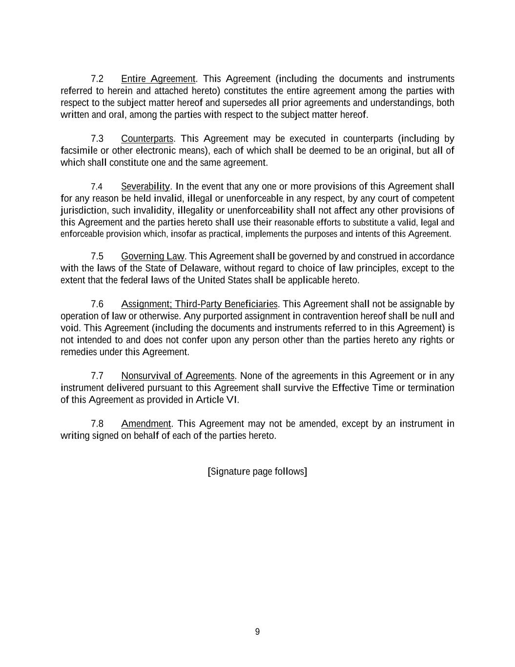 9 7.2 Entire Agreement. This Agreement (including the documents and instruments referred to herein and attached hereto) constitutes the entire agreement among the parties with respect to the subject matter hereof and supersedes all prior agreements and understandings, both written and oral, among the parties with respect to the subject matter hereof. 7.3 Counterparts. This Agreement may be executed in counterparts (including by facsimile or other electronic means), each of which shall be deemed to be an original, but all of which shall constitute one and the same agreement. 7.4 Severability. In the event that any one or more provisions of this Agreement shall for any reason be held invalid, illegal or unenforceable in any respect, by any court of competent jurisdiction, such invalidity, illegality or unenforceability shall not affect any other provisions of this Agreement and the parties hereto shall use their reasonable efforts to substitute a valid, legal and enforceable provision which, insofar as practical, implements the purposes and intents of this Agreement. 7.5 Governing Law. This Agreement shall be governed by and construed in accordance with the laws of the State of Delaware, without regard to choice of law principles, except to the extent that the federal laws of the United States shall be applicable hereto. 7.6 Assignment; Third-Party Beneficiaries. This Agreement shall not be assignable by operation of law or otherwise. Any purported assignment in contravention hereof shall be null and void. This Agreement (including the documents and instruments referred to in this Agreement) is not intended to and does not confer upon any person other than the parties hereto any rights or remedies under this Agreement. 7.7 Nonsurvival of Agreements. None of the agreements in this Agreement or in any instrument delivered pursuant to this Agreement shall survive the Effective Time or termination of this Agreement as provided in Article VI. 7.8 Amendment. This Agreement may not be amended, except by an instrument in writing signed on behalf of each of the parties hereto. [Signature page follows]