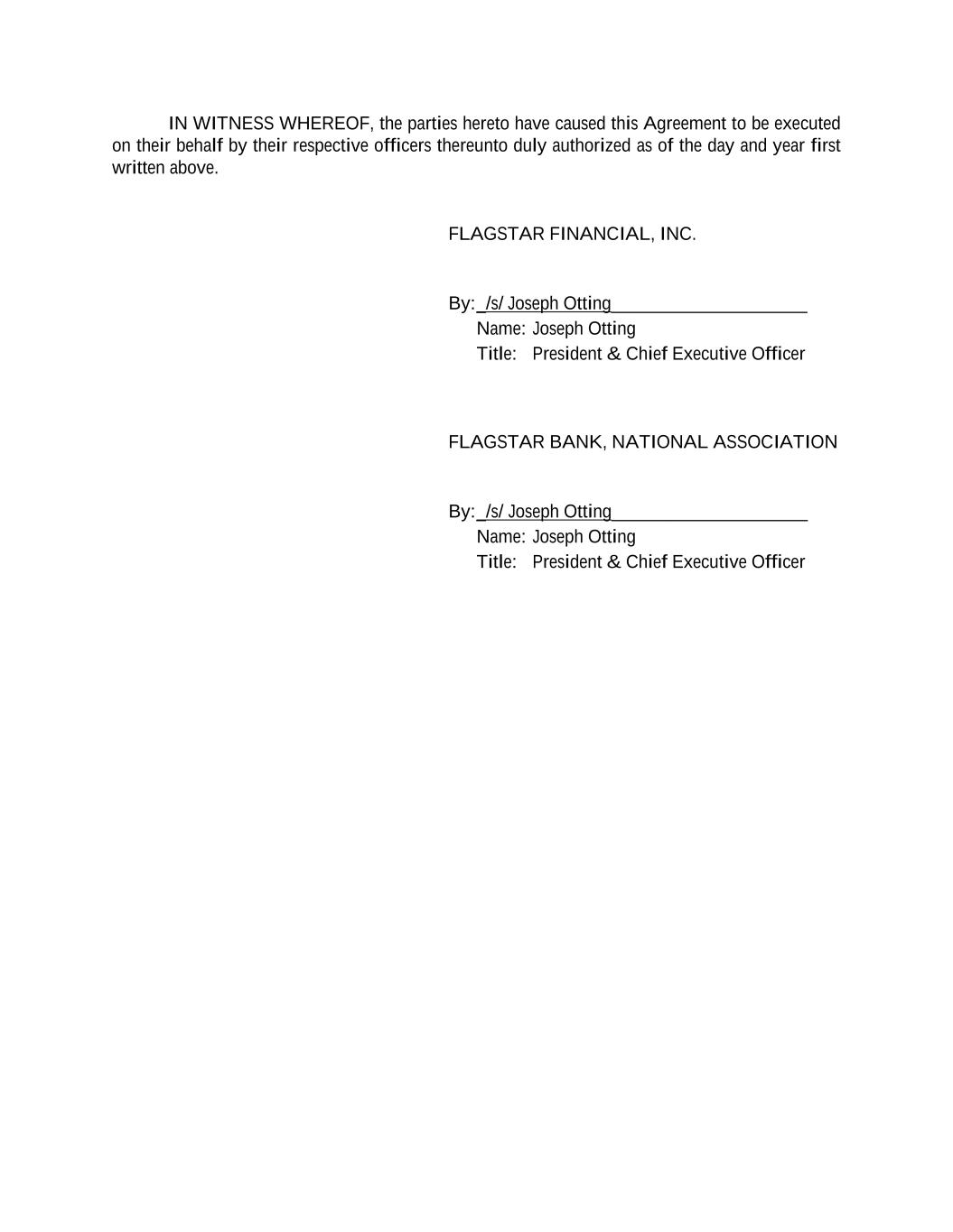 IN WITNESS WHEREOF, the parties hereto have caused this Agreement to be executed on their behalf by their respective officers thereunto duly authorized as of the day and year first written above. FLAGSTAR FINANCIAL, INC. By: _/s/ Joseph Otting_____________________ Name: Joseph Otting Title: President & Chief Executive Officer FLAGSTAR BANK, NATIONAL ASSOCIATION By: _/s/ Joseph Otting_____________________ Name: Joseph Otting Title: President & Chief Executive Officer