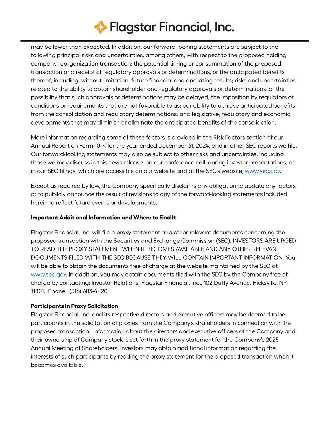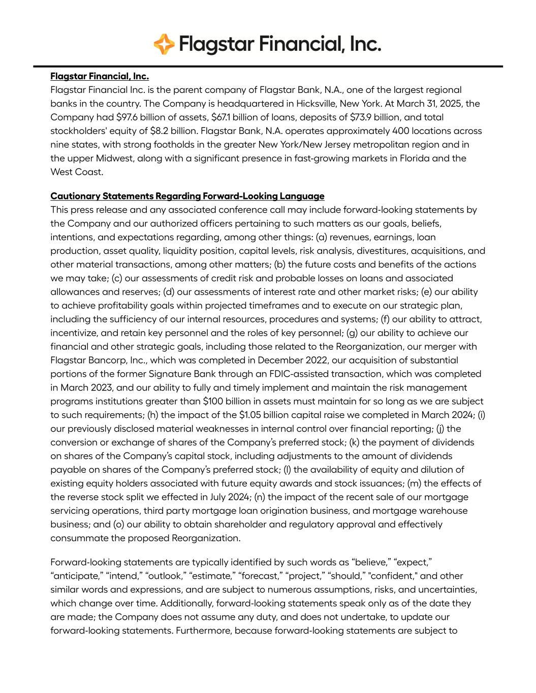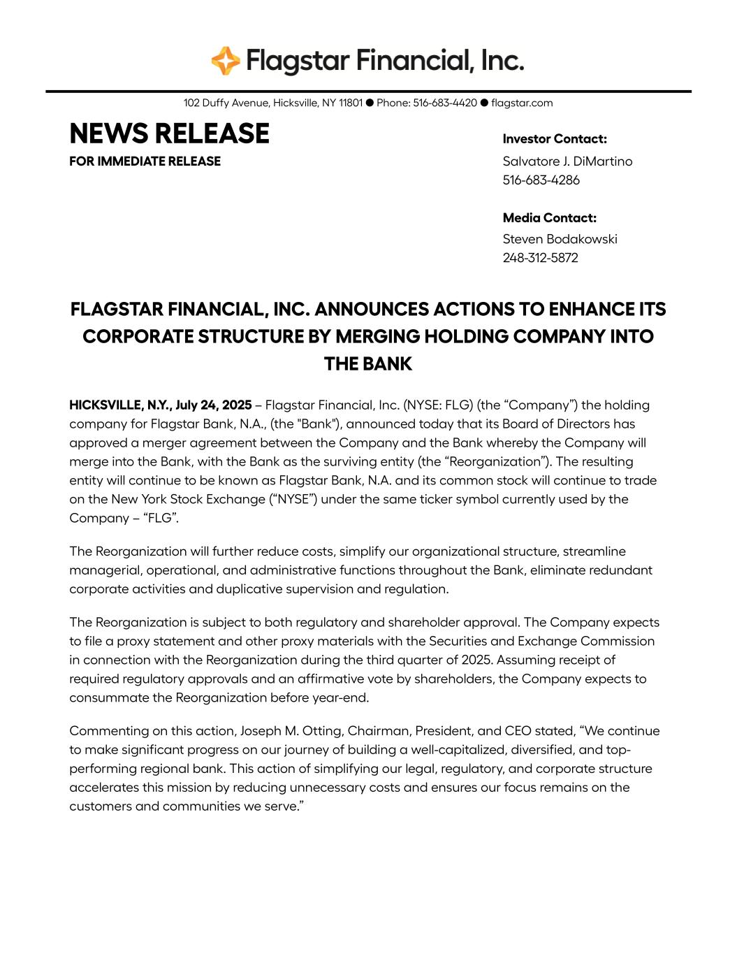 1 AGREEMENT AND PLAN OF MERGER OF FLAGSTAR FINANCIAL, INC. AND FLAGSTAR BANK, N.A. This Agreement and Plan of Merger (this “Agreement”), dated as of July 24, 2025, is adopted and made by and between FLAGSTAR FINANCIAL, INC., a Delaware corporation that will, prior to the Effective Time, convert into FLAGSTAR FINANCIAL, FEDERAL SAVINGS ASSOCIATION, an interim federal savings association chartered by the Office of the Comptroller of the Currency (the “Conversion”) (either Flagstar Financial, Inc. or Flagstar Financial, Federal Savings Association, as the case may be, is the “Company”), and FLAGSTAR BANK, NATIONAL ASSOCIATION, a banking association organized under the laws of the United States with its main office in Hicksville, New York (the “Bank”). WITNESSETH: WHEREAS, the respective Boards of Directors of the Company and the Bank have each adopted a resolution approving this Agreement, authorizing the execution hereof and recommending that this Agreement and the merger of the Company with and into the Bank (the “Merger”) contemplated hereby be submitted to the shareholders of the Company and the Bank, respectively, for approval; WHEREAS, prior to the Effective Time, the Company intends to convert into Flagstar Financial, Federal Savings Association, an interim federal savings association chartered by the Office of the Comptroller of the Currency; and WHEREAS, it is intended that each of the Conversion and the Merger for federal tax purposes qualify as a “reorganization” within the meaning of Section 368(a) of the Internal Revenue Code of 1986, as amended (the “Code”) and this Agreement will constitute a plan of reorganization for purposes of Sections 354 and 361 of the Code. NOW, THEREFORE, in consideration of the mutual covenants and agreements hereinafter set forth and other good and valuable consideration, the receipt and sufficiency of which is hereby acknowledged, and subject to the terms and conditions of this Agreement, the parties hereto agree as follows: ARTICLE I Merger 1.1 Merger. Subject to the terms and conditions of this Agreement, effective as of the Effective Time (as defined below), the Company shall be merged with and into the Bank in accordance with the laws of the State of Texas with the effect provided in Tex. Fin. Code § 62.352 and the laws of the United States with the effect provided in 12 U.S.C. § 1828(c). At the Effective