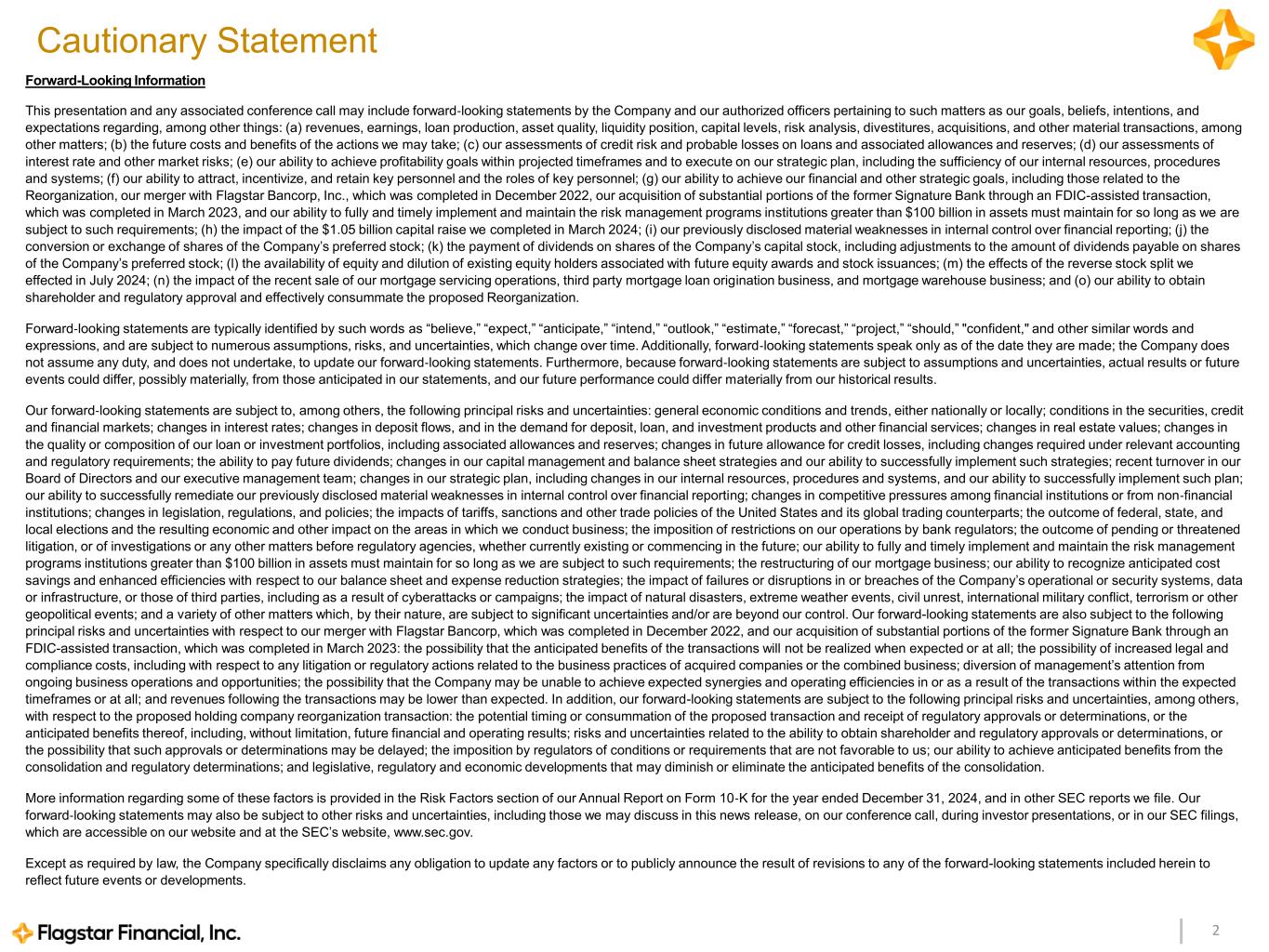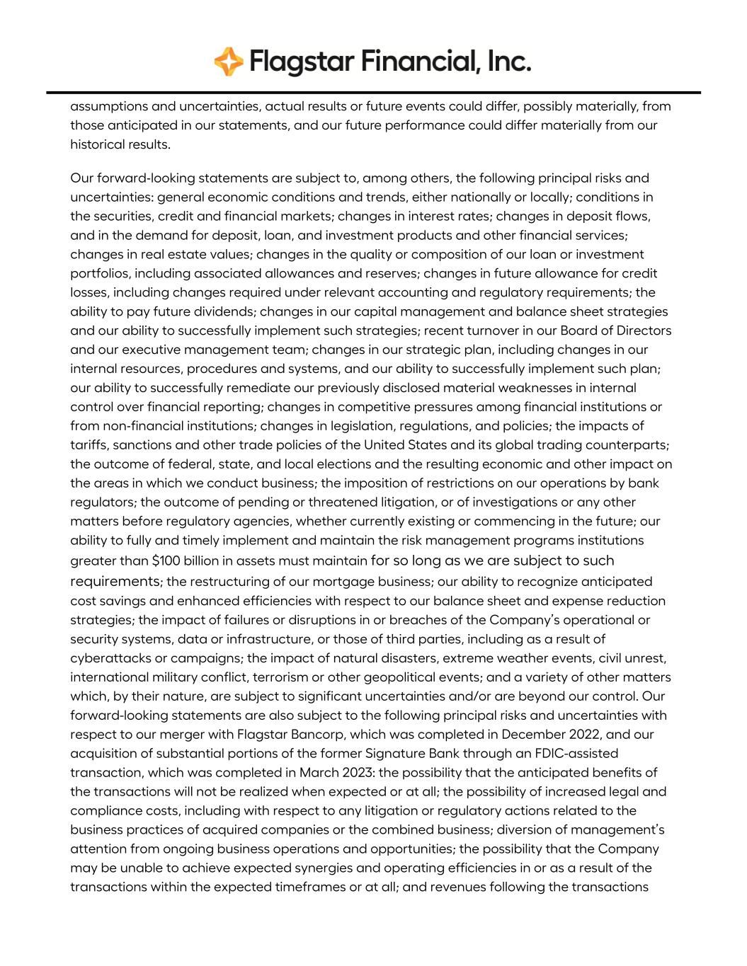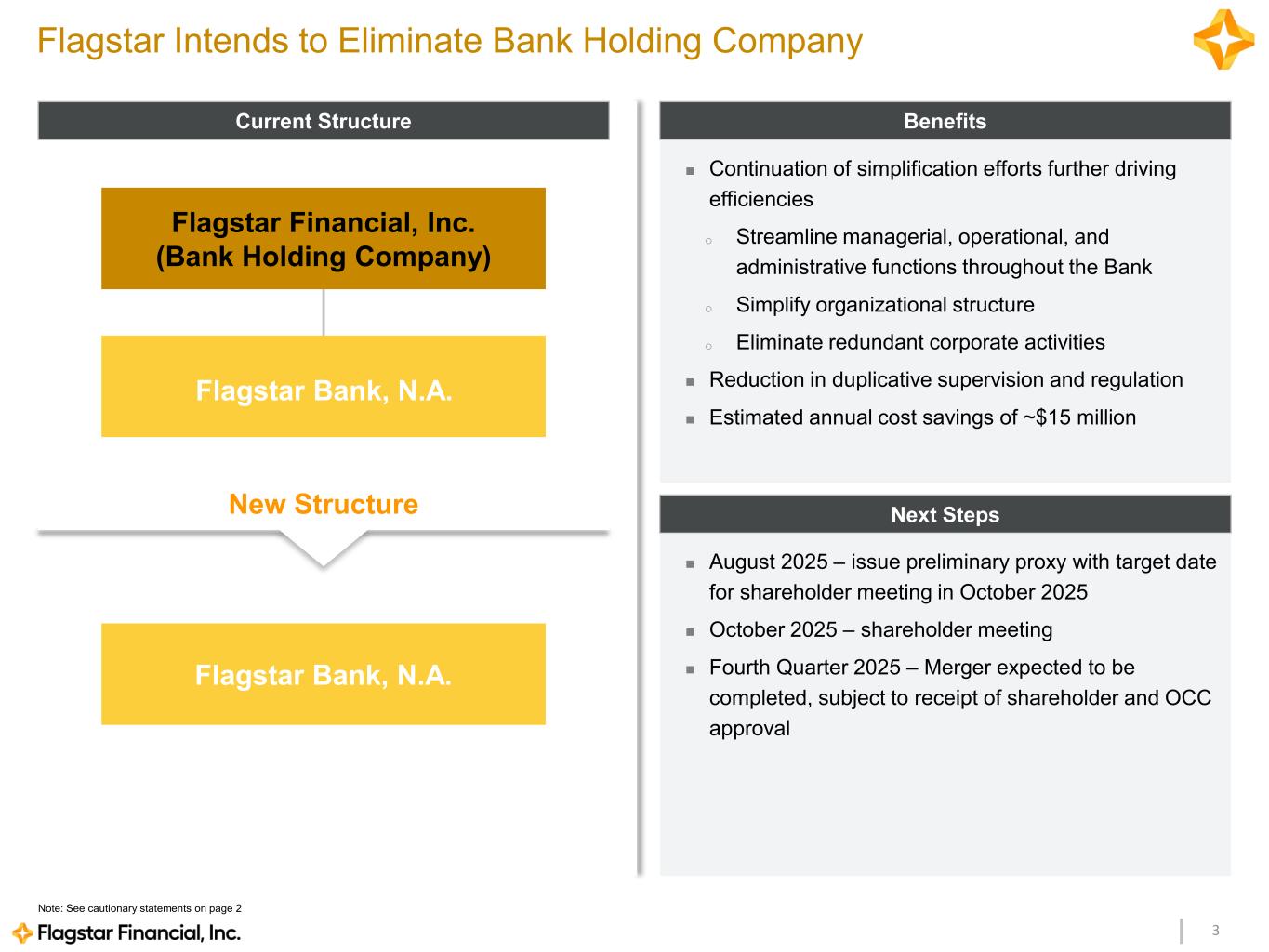 1 AGREEMENT AND PLAN OF MERGER OF FLAGSTAR FINANCIAL, INC. AND FLAGSTAR BANK, N.A. This Agreement and Plan of Merger (this “Agreement”), dated as of July 24, 2025, is adopted and made by and between FLAGSTAR FINANCIAL, INC., a Delaware corporation that will, prior to the Effective Time, convert into FLAGSTAR FINANCIAL, FEDERAL SAVINGS ASSOCIATION, an interim federal savings association chartered by the Office of the Comptroller of the Currency (the “Conversion”) (either Flagstar Financial, Inc. or Flagstar Financial, Federal Savings Association, as the case may be, is the “Company”), and FLAGSTAR BANK, NATIONAL ASSOCIATION, a banking association organized under the laws of the United States with its main office in Hicksville, New York (the “Bank”). WITNESSETH: WHEREAS, the respective Boards of Directors of the Company and the Bank have each adopted a resolution approving this Agreement, authorizing the execution hereof and recommending that this Agreement and the merger of the Company with and into the Bank (the “Merger”) contemplated hereby be submitted to the shareholders of the Company and the Bank, respectively, for approval; WHEREAS, prior to the Effective Time, the Company intends to convert into Flagstar Financial, Federal Savings Association, an interim federal savings association chartered by the Office of the Comptroller of the Currency; and WHEREAS, it is intended that each of the Conversion and the Merger for federal tax purposes qualify as a “reorganization” within the meaning of Section 368(a) of the Internal Revenue Code of 1986, as amended (the “Code”) and this Agreement will constitute a plan of reorganization for purposes of Sections 354 and 361 of the Code. NOW, THEREFORE, in consideration of the mutual covenants and agreements hereinafter set forth and other good and valuable consideration, the receipt and sufficiency of which is hereby acknowledged, and subject to the terms and conditions of this Agreement, the parties hereto agree as follows: ARTICLE I Merger 1.1 Merger. Subject to the terms and conditions of this Agreement, effective as of the Effective Time (as defined below), the Company shall be merged with and into the Bank in accordance with the laws of the State of Texas with the effect provided in Tex. Fin. Code § 62.352 and the laws of the United States with the effect provided in 12 U.S.C. § 1828(c). At the Effective