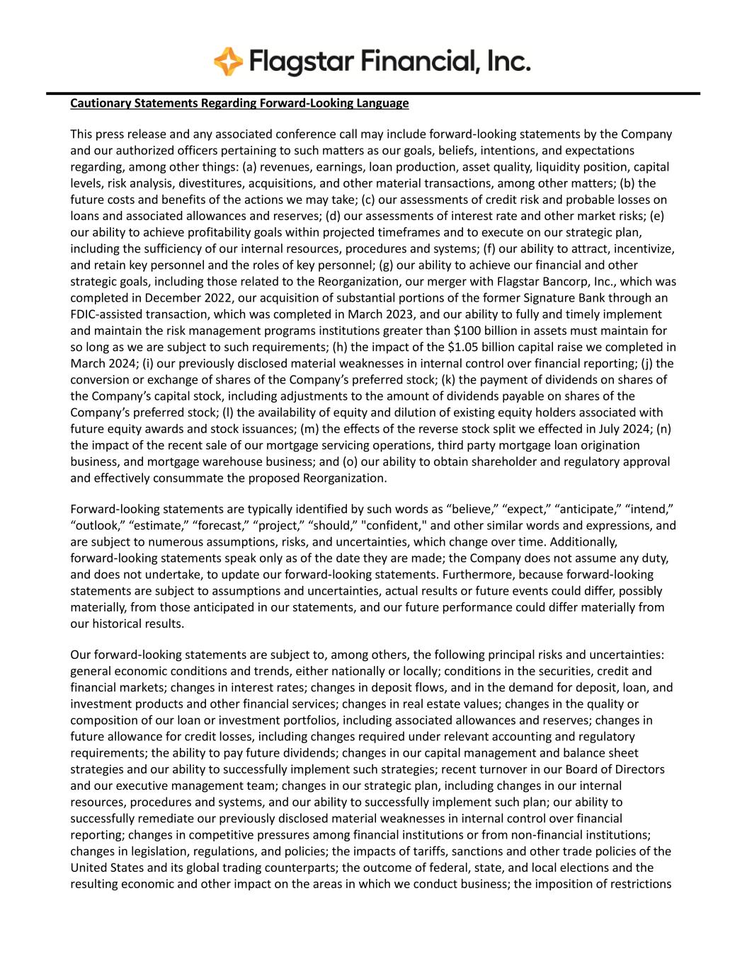 on our operations by bank regulators; the outcome of pending or threatened litigation, or of investigations or any other matters before regulatory agencies, whether currently existing or commencing in the future; our ability to fully and timely implement and maintain the risk management programs institutions greater than $100 billion in assets must maintain for so long as we are subject to such requirements; the restructuring of our mortgage business; our ability to recognize anticipated cost savings and enhanced efficiencies with respect to our balance sheet and expense reduction strategies; the impact of failures or disruptions in or breaches of the Company’s operational or security systems, data or infrastructure, or those of third parties, including as a result of cyberattacks or campaigns; the impact of natural disasters, extreme weather events, civil unrest, international military conflict, terrorism or other geopolitical events; and a variety of other matters which, by their nature, are subject to significant uncertainties and/or are beyond our control. Our forward- looking statements are also subject to the following principal risks and uncertainties with respect to our merger with Flagstar Bancorp, which was completed in December 2022, and our acquisition of substantial portions of the former Signature Bank through an FDIC-assisted transaction, which was completed in March 2023: the possibility that the anticipated benefits of the transactions will not be realized when expected or at all; the possibility of increased legal and compliance costs, including with respect to any litigation or regulatory actions related to the business practices of acquired companies or the combined business; diversion of management’s attention from ongoing business operations and opportunities; the possibility that the Company may be unable to achieve expected synergies and operating efficiencies in or as a result of the transactions within the expected timeframes or at all; and revenues following the transactions may be lower than expected. In addition, our forward-looking statements are subject to the following principal risks and uncertainties, among others, with respect to the proposed holding company reorganization transaction: the potential timing or consummation of the proposed transaction and receipt of regulatory approvals or determinations, or the anticipated benefits thereof, including, without limitation, future financial and operating results; risks and uncertainties related to the ability to obtain shareholder and regulatory approvals or determinations, or the possibility that such approvals or determinations may be delayed; the imposition by regulators of conditions or requirements that are not favorable to us; our ability to achieve anticipated benefits from the consolidation and regulatory determinations; and legislative, regulatory and economic developments that may diminish or eliminate the anticipated benefits of the consolidation. More information regarding some of these factors is provided in the Risk Factors section of our Annual Report on Form 10‐K for the year ended December 31, 2024, and in other SEC reports we file. Our forward‐looking statements may also be subject to other risks and uncertainties, including those we may discuss in this news release, on our conference call, during investor presentations, or in our SEC filings, which are accessible on our website and at the SEC’s website, www.sec.gov. Except as required by law, the Company specifically disclaims any obligation to update any factors or to publicly announce the result of revisions to any of the forward-looking statements included herein to reflect future events or developments. Important Additional Information and Where to Find It Flagstar Financial, Inc. has filed a proxy statement and other relevant documents concerning the proposed transaction with the Securities and Exchange Commission (SEC). INVESTORS ARE URGED TO READ THE PROXY STATEMENT WHEN IT BECOMES AVAILABLE AND ANY OTHER RELEVANT DOCUMENTS FILED WITH THE SEC BECAUSE THEY WILL CONTAIN IMPORTANT INFORMATION. You will be able to obtain the documents free of charge at the website maintained by the SEC at www.sec.gov. In addition, you may obtain documents filed with the SEC by the Company free of charge by contacting: Investor Relations, Flagstar Financial, Inc., 102 Duffy Avenue, Hicksville, NY 11801. Phone: (516) 683-4420