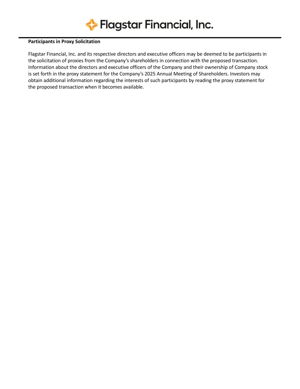 Participants in Proxy Solicitation Flagstar Financial, Inc. and its respective directors and executive officers may be deemed to be participants in the solicitation of proxies from the Company’s shareholders in connection with the proposed transaction. Information about the directors and executive officers of the Company and their ownership of Company stock is set forth in the proxy statement for the Company’s 2025 Annual Meeting of Shareholders. Investors may obtain additional information regarding the interests of such participants by reading the proxy statement for the proposed transaction when it becomes available.