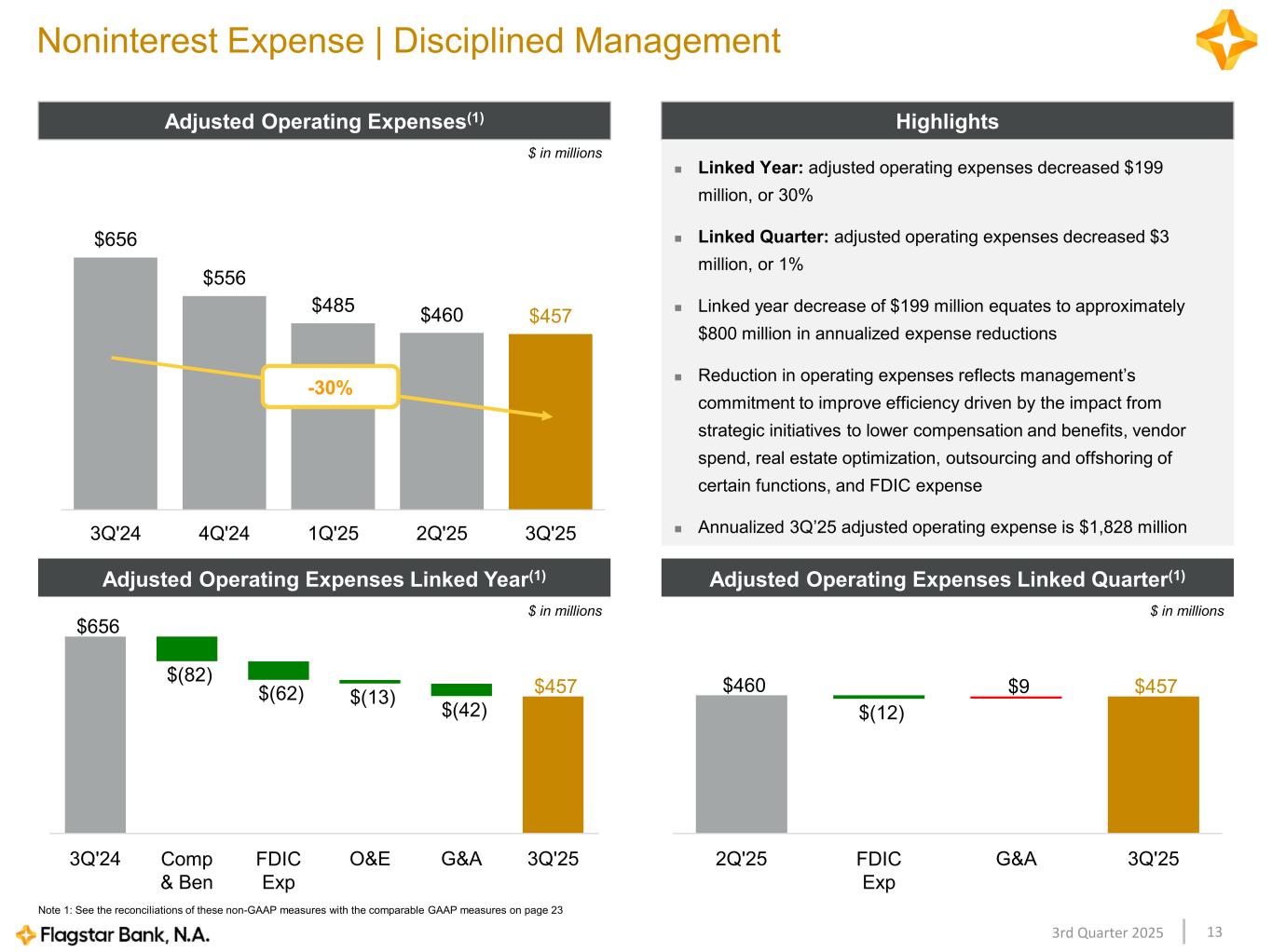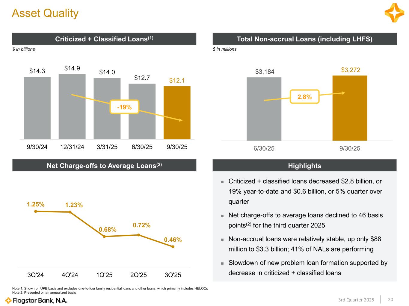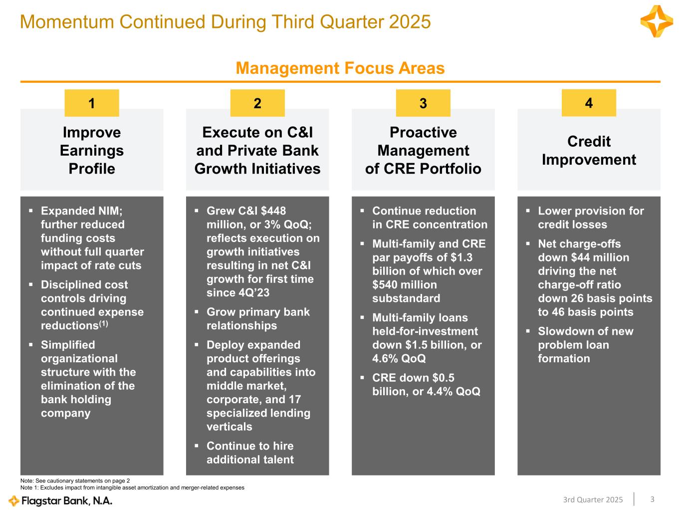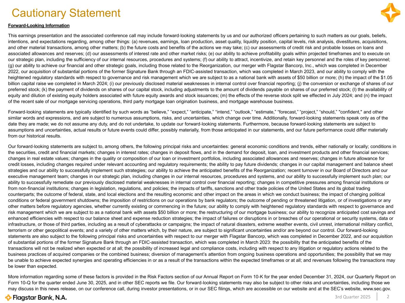 23rd Quarter 2025 Cautionary Statement Forward-Looking Information This earnings presentation and the associated conference call may include forward‐looking statements by us and our authorized officers pertaining to such matters as our goals, beliefs, intentions, and expectations regarding, among other things: (a) revenues, earnings, loan production, asset quality, liquidity position, capital levels, risk analysis, divestitures, acquisitions, and other material transactions, among other matters; (b) the future costs and benefits of the actions we may take; (c) our assessments of credit risk and probable losses on loans and associated allowances and reserves; (d) our assessments of interest rate and other market risks; (e) our ability to achieve profitability goals within projected timeframes and to execute on our strategic plan, including the sufficiency of our internal resources, procedures and systems; (f) our ability to attract, incentivize, and retain key personnel and the roles of key personnel; (g) our ability to achieve our financial and other strategic goals, including those related to the Reorganization, our merger with Flagstar Bancorp, Inc., which was completed in December 2022, our acquisition of substantial portions of the former Signature Bank through an FDIC-assisted transaction, which was completed in March 2023, and our ability to comply with the heightened regulatory standards with respect to governance and risk management which we are subject to as a national bank with assets of $50 billion or more; (h) the impact of the $1.05 billion capital raise we completed in March 2024; (i) our previously disclosed material weaknesses in internal control over financial reporting; (j) the conversion or exchange of shares of our preferred stock; (k) the payment of dividends on shares of our capital stock, including adjustments to the amount of dividends payable on shares of our preferred stock; (l) the availability of equity and dilution of existing equity holders associated with future equity awards and stock issuances; (m) the effects of the reverse stock split we effected in July 2024; and (n) the impact of the recent sale of our mortgage servicing operations, third party mortgage loan origination business, and mortgage warehouse business. Forward‐looking statements are typically identified by such words as “believe,” “expect,” “anticipate,” “intend,” “outlook,” “estimate,” “forecast,” “project,” “should,” "confident," and other similar words and expressions, and are subject to numerous assumptions, risks, and uncertainties, which change over time. Additionally, forward‐looking statements speak only as of the date they are made; we do not assume any duty, and do not undertake, to update our forward‐looking statements. Furthermore, because forward‐looking statements are subject to assumptions and uncertainties, actual results or future events could differ, possibly materially, from those anticipated in our statements, and our future performance could differ materially from our historical results. Our forward‐looking statements are subject to, among others, the following principal risks and uncertainties: general economic conditions and trends, either nationally or locally; conditions in the securities, credit and financial markets; changes in interest rates; changes in deposit flows, and in the demand for deposit, loan, and investment products and other financial services; changes in real estate values; changes in the quality or composition of our loan or investment portfolios, including associated allowances and reserves; changes in future allowance for credit losses, including changes required under relevant accounting and regulatory requirements; the ability to pay future dividends; changes in our capital management and balance sheet strategies and our ability to successfully implement such strategies; our ability to achieve the anticipated benefits of the Reorganization; recent turnover in our Board of Directors and our executive management team; changes in our strategic plan, including changes in our internal resources, procedures and systems, and our ability to successfully implement such plan; our ability to successfully remediate our previously disclosed material weaknesses in internal control over financial reporting; changes in competitive pressures among financial institutions or from non‐financial institutions; changes in legislation, regulations, and policies; the impacts of tariffs, sanctions and other trade policies of the United States and its global trading counterparts; the outcome of federal, state, and local elections and the resulting economic and other impact on the areas in which we conduct business; the impact of changing political conditions or federal government shutdowns; the imposition of restrictions on our operations by bank regulators; the outcome of pending or threatened litigation, or of investigations or any other matters before regulatory agencies, whether currently existing or commencing in the future; our ability to comply with heightened regulatory standards with respect to governance and risk management which we are subject to as a national bank with assets $50 billion or more; the restructuring of our mortgage business; our ability to recognize anticipated cost savings and enhanced efficiencies with respect to our balance sheet and expense reduction strategies; the impact of failures or disruptions in or breaches of our operational or security systems, data or infrastructure, or those of third parties, including as a result of cyberattacks or campaigns; the impact of natural disasters, extreme weather events, civil unrest, international military conflict, terrorism or other geopolitical events; and a variety of other matters which, by their nature, are subject to significant uncertainties and/or are beyond our control. Our forward-looking statements are also subject to the following principa
