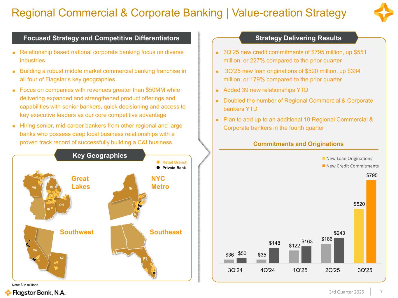 73rd Quarter 2025 Regional Commercial & Corporate Banking | Value-creation Strategy Focused Strategy and Competitive Differentiators Strategy Delivering Results NY CT NJ WI MI IN OH Relationship based national corporate banking focus on diverse industries Building a robust middle market commercial banking franchise in all four of Flagstar’s key geographies Focus on companies with revenues greater than $50MM while delivering expanded and strengthened product offerings and capabilities with senior bankers, quick decisioning and access to key executive leaders as our core competitive advantage Hiring senior, mid-career bankers from other regional and large banks who possess deep local business relationships with a proven track record of successfully building a C&I business 3Q’25 new credit commitments of $795 million, up $551 million, or 227% compared to the prior quarter 3Q’25 new loan originations of $520 million, up $334 million, or 179% compared to the prior quarter Added 39 new relationships YTD Doubled the number of Regional Commercial & Corporate bankers YTD Plan to add up to an additional 10 Regional Commercial & Corporate bankers in the fourth quarter Note: $ in millions $36 $35 $122 $186 $520 $50 $148 $163 $243 $795 3Q'24 4Q'24 1Q'25 2Q'25 3Q'25 New Loan Originations New Credit Commitments Great Lakes NYC Metro Southwest Southeast Key Geographies Retail Branch Private Bank Commitments and Originations CA AZ