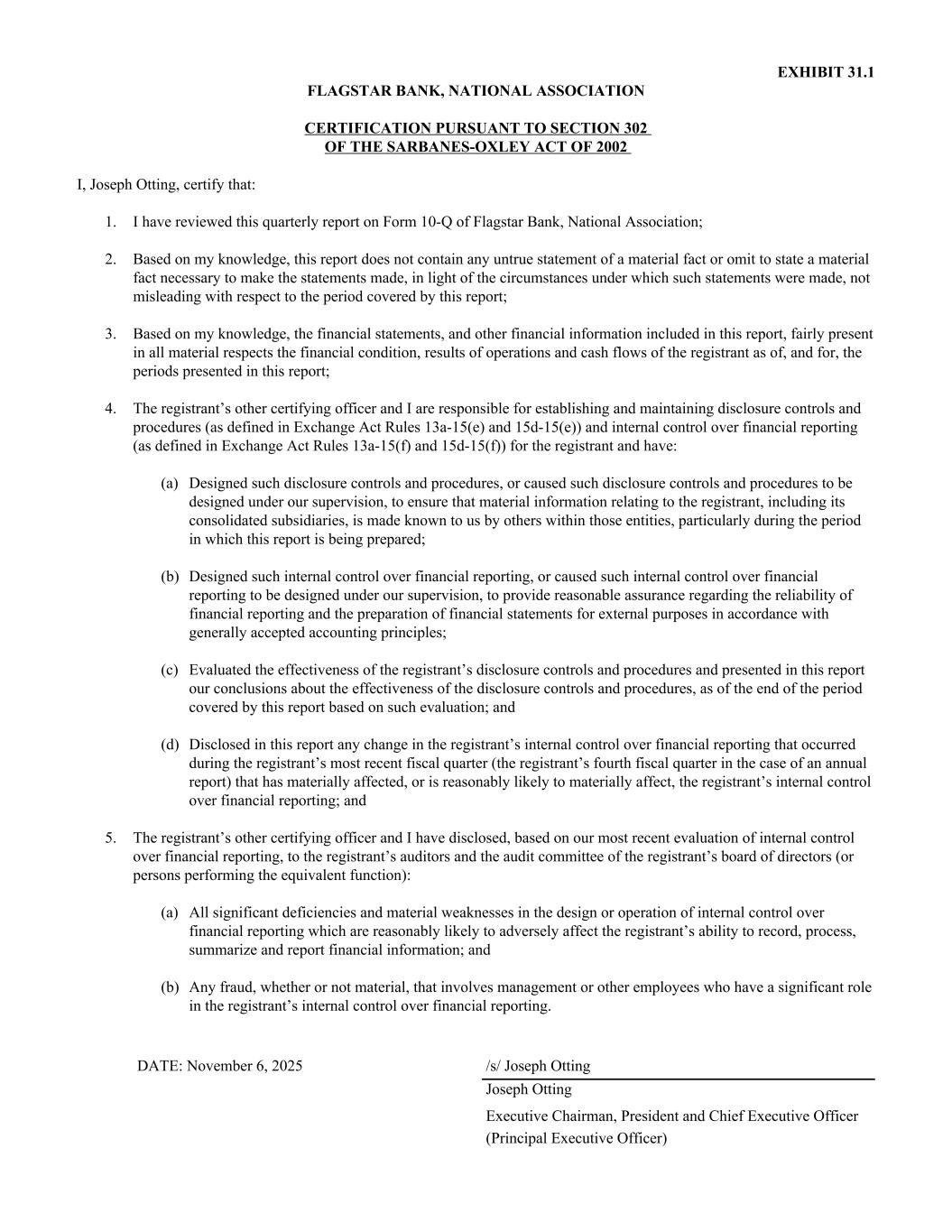 EXHIBIT 31.1 FLAGSTAR BANK, NATIONAL ASSOCIATION CERTIFICATION PURSUANT TO SECTION 302 OF THE SARBANES-OXLEY ACT OF 2002 I, Joseph Otting, certify that: 1. I have reviewed this quarterly report on Form 10-Q of Flagstar Bank, National Association; 2. Based on my knowledge, this report does not contain any untrue statement of a material fact or omit to state a material fact necessary to make the statements made, in light of the circumstances under which such statements were made, not misleading with respect to the period covered by this report; 3. Based on my knowledge, the financial statements, and other financial information included in this report, fairly present in all material respects the financial condition, results of operations and cash flows of the registrant as of, and for, the periods presented in this report; 4. The registrant’s other certifying officer and I are responsible for establishing and maintaining disclosure controls and procedures (as defined in Exchange Act Rules 13a-15(e) and 15d-15(e)) and internal control over financial reporting (as defined in Exchange Act Rules 13a-15(f) and 15d-15(f)) for the registrant and have: (a) Designed such disclosure controls and procedures, or caused such disclosure controls and procedures to be designed under our supervision, to ensure that material information relating to the registrant, including its consolidated subsidiaries, is made known to us by others within those entities, particularly during the period in which this report is being prepared; (b) Designed such internal control over financial reporting, or caused such internal control over financial reporting to be designed under our supervision, to provide reasonable assurance regarding the reliability of financial reporting and the preparation of financial statements for external purposes in accordance with generally accepted accounting principles; (c) Evaluated the effectiveness of the registrant’s disclosure controls and procedures and presented in this report our conclusions about the effectiveness of the disclosure controls and procedures, as of the end of the period covered by this report based on such evaluation; and (d) Disclosed in this report any change in the registrant’s internal control over financial reporting that occurred during the registrant’s most recent fiscal quarter (the registrant’s fourth fiscal quarter in the case of an annual report) that has materially affected, or is reasonably likely to materially affect, the registrant’s internal control over financial reporting; and 5. The registrant’s other certifying officer and I have disclosed, based on our most recent evaluation of internal control over financial reporting, to the registrant’s auditors and the audit committee of the registrant’s board of directors (or persons performing the equivalent function): (a) All significant deficiencies and material weaknesses in the design or operation of internal control over financial reporting which are reasonably likely to adversely affect the registrant’s ability to record, process, summarize and report financial information; and (b) Any fraud, whether or not material, that involves management or other employees who have a significant role in the registrant’s internal control over financial reporting. DATE: November 6, 2025 /s/ Joseph Otting Joseph Otting Executive Chairman, President and Chief Executive Officer (Principal Executive Officer)