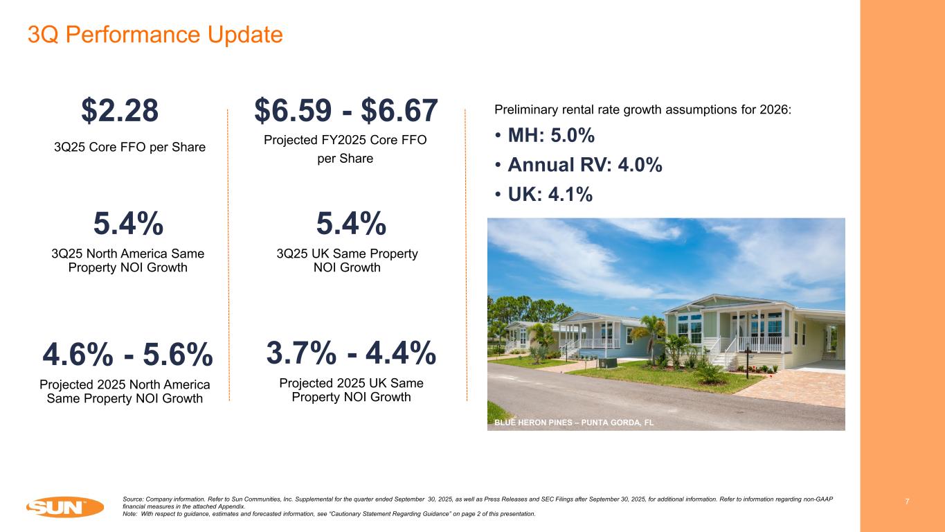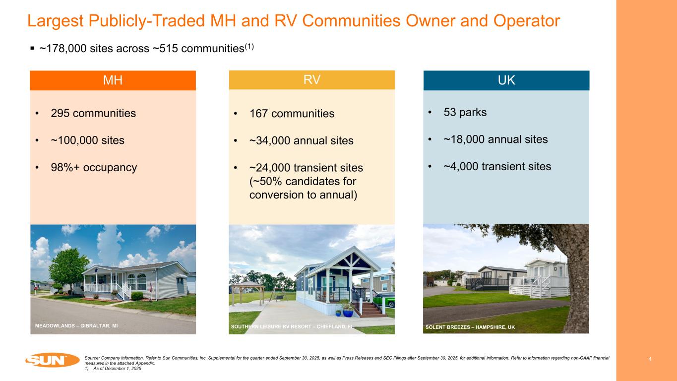 Cautionary Statement Regarding Forward-Looking Statements 2 This presentation has been prepared for informational purposes only from information supplied by Sun Communities, Inc., referred to herein as “we,” “our,” “Sun,” and “the Company,” and from third-party sources indicated herein. Such third-party information has not been independently verified. Sun makes no representation or warranty, expressed or implied, as to the accuracy or completeness of such information. This presentation contains various “forward-looking statements” within the meaning of the United States Securities Act of 1933, as amended (the "Securities Act"), and the Securities Exchange Act of 1934, as amended (the "Exchange Act"), and the Company intends that such forward-looking statements will be subject to the safe harbors created thereby. For this purpose, any statements contained in this document that relate to expectations, beliefs, projections, future plans and strategies, trends or prospective events or developments, and similar expressions concerning matters that are not historical facts are deemed to be forward-looking statements. Words such as "forecasts," "intend," "goal," "estimate," "expect," "project," "projections," "plans," "predicts," "potential," "seeks," "anticipates," "should," "could,“ "may," "will," "designed to," "foreseeable future," "believe," "scheduled," "guidance," "target," and similar expressions are intended to identify forward-looking statements, although not all forward-looking statements contain these words. These forward-looking statements reflect the Company's current views with respect to future events and financial performance, but involve known and unknown risks, uncertainties and other factors, both general and specific to the matters discussed in this document, some of which are beyond the Company's control. These risks, uncertainties and other factors may cause the Company's actual results to be materially different from any future results expressed or implied by such forward-looking statements. In addition to the risks described under "Risk Factors” contained in the Company's Annual Report on Form 10-K for the year ended December 31, 2024, and in the Company's other filings with the Securities and Exchange Commission, from time to time, such risks, uncertainties and other factors include, but are not limited to: The Company's liquidity and refinancing demands; The Company's ability to obtain or refinance maturing debt; The Company's ability to maintain compliance with covenants contained in its debt facilities and its unsecured notes; Availability of capital; General volatility of the capital markets and the market price of shares of the Company's capital stock; Increases in interest rates and operating costs, including insurance premiums and real estate taxes; Difficulties in the Company's ability to evaluate, finance, complete and integrate acquisitions, developments and expansions successfully; The ability of the Company to realize the anticipated benefits of the Safe Harbor Sale, including with respect to tax strategies, or at all; Competitive market forces; The ability of purchasers of manufactured homes to obtain financing; The level of repossessions of manufactured homes; The Company's ability to maintain effective internal control over financial reporting and disclosure controls and procedures; The Company's remediation plan and its ability to remediate the material weakness in its internal control over financial reporting; Expectations regarding the amount or frequency of impairment losses; Changes in general economic conditions, including inflation, deflation, energy costs, the real estate industry, the effects of tariffs or threats of tariffs, trade wars, immigration issues, supply chain disruptions, and the markets within which the Company operates; Changes in foreign currency exchange rates, including between the U.S. dollar and each of the Canadian dollar, Australian dollar, and pound sterling; The Company's ability to maintain its status as a REIT; Changes in real estate and zoning laws and regulations; The Company's ability to maintain rental rates and occupancy levels; Legislative or regulatory changes, including changes to laws governing the taxation of REITs; Outbreaks of disease and related restrictions on business operations; Risks related to natural disasters such as hurricanes, earthquakes, floods, droughts, and wildfires; and Litigation, judgments or settlements, including costs associated with prosecuting or defending claims and any adverse outcomes. Readers are cautioned not to place undue reliance on these forward-looking statements, which speak only as of the date the statement was made. The Company undertakes no obligation to publicly update or revise any forward-looking statements included in this presentation, whether as a result of new information, future events, changes in the Company’s expectations or otherwise, except as required by law. Although the Company believes that the expectations reflected in the forward-looking statements are reasonable, the Company cannot guarantee future results, levels of activity, performance or achievements. All written and oral forward-looking statements attributable to the Company or persons acting on the Company’s behalf are qualified in their entirety by these cautionary statements. CAUTIONARY STATEMENT REGARDING GUIDANCE This presentation includes certain estimates and assumptions included in the Company’s financial, earnings and operational guidance, as presented in its earnings press release and supplemental operating and financial data dated October 29, 2025. These estimates and assumptions represent a range of possible outcomes and may differ materially from actual results. These estimates include contributions from all acquisitions, dispositions and capital markets activity completed through October 29, 2025. These estimates exclude all other prospective acquisitions, d