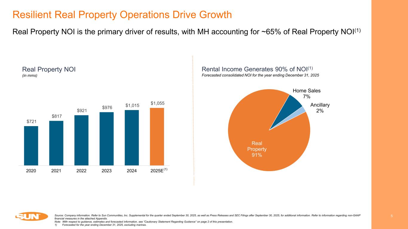 4 ~178,000 sites across ~515 communities(1) Largest Publicly-Traded MH and RV Communities Owner and Operator Source: Company information. Refer to Sun Communities, Inc. Supplemental for the quarter ended September 30, 2025, as well as Press Releases and SEC Filings after September 30, 2025, for additional information. Refer to information regarding non-GAAP financial measures in the attached Appendix. 1) As of December 1, 2025 MH • 295 communities • ~100,000 sites • 98%+ occupancy • 53 parks • ~18,000 annual sites • ~4,000 transient sites RV • 167 communities • ~34,000 annual sites • ~24,000 transient sites (~50% candidates for conversion to annual) MEADOWLANDS – GIBRALTAR, MI UK SOLENT BREEZES – HAMPSHIRE, UKSOUTHERN LEISURE RV RESORT – CHIEFLAND, FL