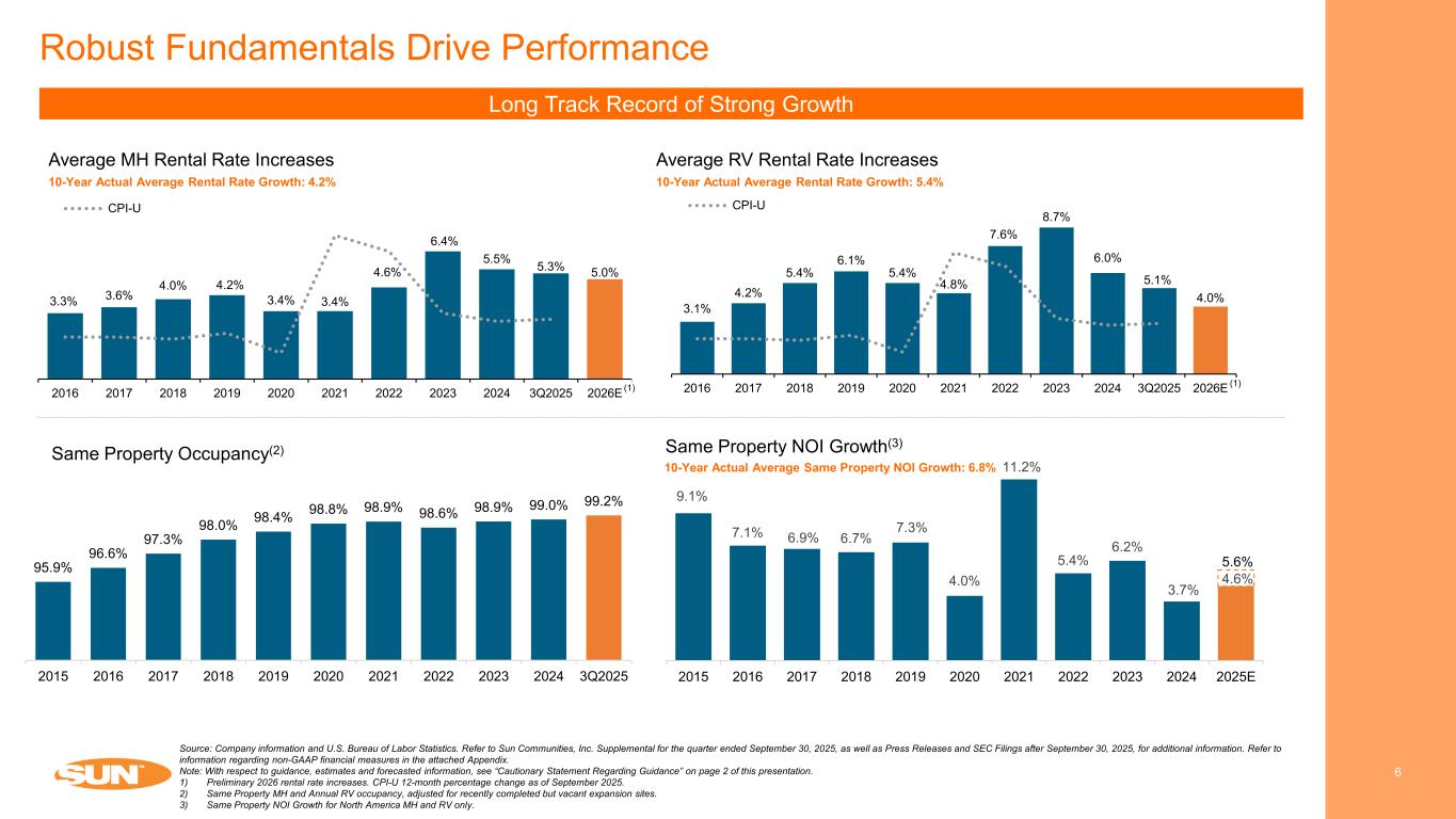 $721 $817 $921 $976 $1,015 $1,055 2020 2021 2022 2023 2024 2025E Resilient Real Property Operations Drive Growth 5 Real Property NOI is the primary driver of results, with MH accounting for ~65% of Real Property NOI(1) Real Property NOI (in mms) Rental Income Generates 90% of NOI(1) Forecasted consolidated NOI for the year ending December 31, 2025 Source: Company information. Refer to Sun Communities, Inc. Supplemental for the quarter ended September 30, 2025, as well as Press Releases and SEC Filings after September 30, 2025, for additional information. Refer to information regarding non-GAAP financial measures in the attached Appendix. Note: With respect to guidance, estimates and forecasted information, see “Cautionary Statement Regarding Guidance” on page 2 of this presentation. 1) Forecasted for the year ending December 31, 2025, excluding marinas. (1) Real Property 91% Home Sales 7% Ancillary 2%