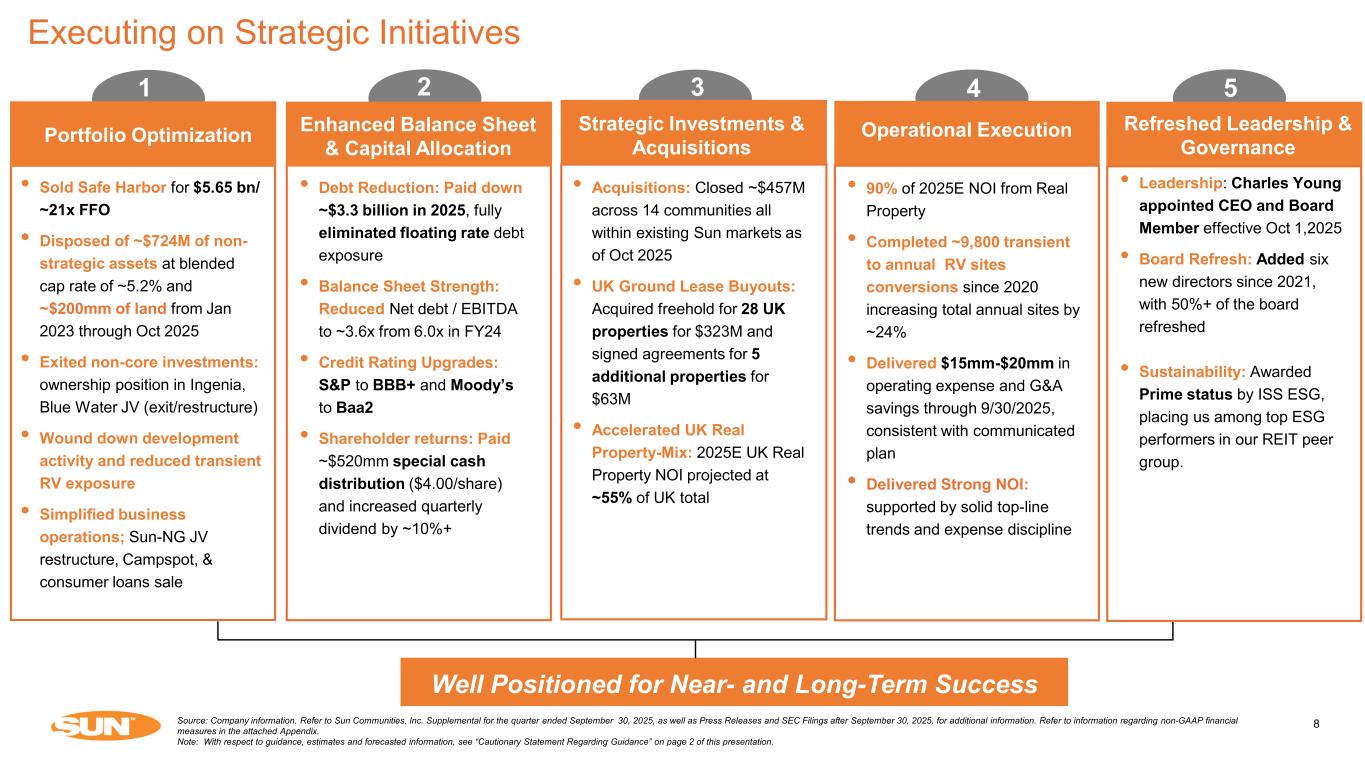 7 3Q Performance Update Source: Company information. Refer to Sun Communities, Inc. Supplemental for the quarter ended September 30, 2025, as well as Press Releases and SEC Filings after September 30, 2025, for additional information. Refer to information regarding non-GAAP financial measures in the attached Appendix. Note: With respect to guidance, estimates and forecasted information, see “Cautionary Statement Regarding Guidance” on page 2 of this presentation. 3Q25 Core FFO per Share $2.28 Projected FY2025 Core FFO per Share $6.59 - $6.67 3Q25 North America Same Property NOI Growth Projected 2025 North America Same Property NOI Growth 5.4% 4.6% - 5.6% 3Q25 UK Same Property NOI Growth Projected 2025 UK Same Property NOI Growth 5.4% 3.7% - 4.4% BLUE HERON PINES – PUNTA GORDA, FL Preliminary rental rate growth assumptions for 2026: • MH: 5.0% • Annual RV: 4.0% • UK: 4.1%