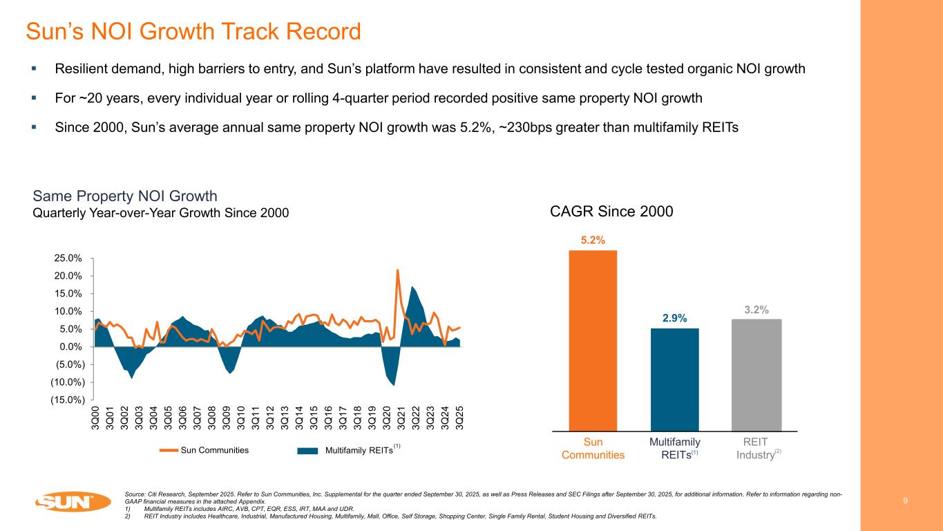 51 2 3 4 Executing on Strategic Initiatives 8 • Sold Safe Harbor for $5.65 bn/ ~21x FFO • Disposed of ~$724M of non- strategic assets at blended cap rate of ~5.2% and ~$200mm of land from Jan 2023 through Oct 2025 • Exited non-core investments: ownership position in Ingenia, Blue Water JV (exit/restructure) • Wound down development activity and reduced transient RV exposure • Simplified business operations; Sun-NG JV restructure, Campspot, & consumer loans sale • Debt Reduction: Paid down ~$3.3 billion in 2025, fully eliminated floating rate debt exposure • Balance Sheet Strength: Reduced Net debt / EBITDA to ~3.6x from 6.0x in FY24 • Credit Rating Upgrades: S&P to BBB+ and Moody’s to Baa2 • Shareholder returns: Paid ~$520mm special cash distribution ($4.00/share) and increased quarterly dividend by ~10%+ • Acquisitions: Closed ~$457M across 14 communities all within existing Sun markets as of Oct 2025 • UK Ground Lease Buyouts: Acquired freehold for 28 UK properties for $323M and signed agreements for 5 additional properties for $63M • Accelerated UK Real Property-Mix: 2025E UK Real Property NOI projected at ~55% of UK total Enhanced Balance Sheet & Capital Allocation Strategic Investments & Acquisitions Well Positioned for Near- and Long-Term Success Portfolio Optimization • Leadership: Charles Young appointed CEO and Board Member effective Oct 1,2025 • Board Refresh: Added six new directors since 2021, with 50%+ of the board refreshed • Sustainability: Awarded Prime status by ISS ESG, placing us among top ESG performers in our REIT peer group. Refreshed Leadership & Governance Operational Execution • 90% of 2025E NOI from Real Property • Completed ~9,800 transient to annual RV sites conversions since 2020 increasing total annual sites by ~24% • Delivered $15mm-$20mm in operating expense and G&A savings through 9/30/2025, consistent with communicated plan • Delivered Strong NOI: supported by solid top-line trends and expense discipline Source: Company information. Refer to Sun Communities, Inc. Supplemental for the quarter ended September 30, 2025, as well as Press Releases and SEC Filings after September 30, 2025, for additional information. Refer to information regarding non-GAAP financial measures in the attached Appendix. Note: With respect to guidance, estimates and forecasted information, see “Cautionary Statement Regarding Guidance” on page 2 of this presentation. 8