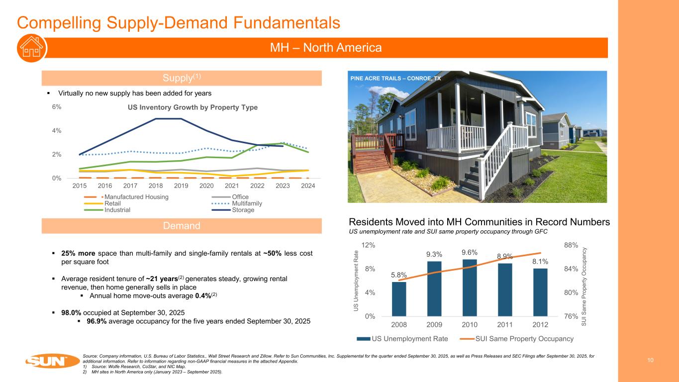 Sun’s NOI Growth Track Record 9 Multifamily REITsSun Communities Resilient demand, high barriers to entry, and Sun’s platform have resulted in consistent and cycle tested organic NOI growth For ~20 years, every individual year or rolling 4-quarter period recorded positive same property NOI growth Since 2000, Sun’s average annual same property NOI growth was 5.2%, ~230bps greater than multifamily REITs Same Property NOI Growth Quarterly Year-over-Year Growth Since 2000 Source: Citi Research, September 2025. Refer to Sun Communities, Inc. Supplemental for the quarter ended September 30, 2025, as well as Press Releases and SEC Filings after September 30, 2025, for additional information. Refer to information regarding non- GAAP financial measures in the attached Appendix. 1) Multifamily REITs includes AIRC, AVB, CPT, EQR, ESS, IRT, MAA and UDR. 2) REIT Industry includes Healthcare, Industrial, Manufactured Housing, Multifamily, Mall, Office, Self Storage, Shopping Center, Single Family Rental, Student Housing and Diversified REITs. (1) CAGR Since 2000 Sun Communities Multifamily REITs REIT Industry(1) (2) 5.2% 2.9% 3.2% (15.0%) (10.0%) (5.0%) 0.0% 5.0% 10.0% 15.0% 20.0% 25.0% 3Q 00 3Q 01 3Q 02 3Q 03 3Q 04 3Q 05 3Q 06 3Q 07 3Q 08 3Q 09 3Q 10 3Q 11 3Q 12 3Q 13 3Q 14 3Q 15 3Q 16 3Q 17 3Q 18 3Q 19 3Q 20 3Q 21 3Q 22 3Q 23 3Q 24 3Q 25