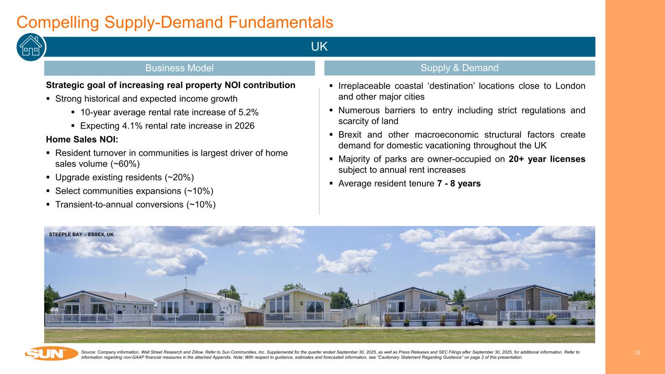 Compelling Supply-Demand Fundamentals 11 RV Continued Demand for Affordable Vacationing Despite Declining RV Sales Growth in annual RV shipments and historical RV revenue growth Installed base: 8.1 million households own an RV versus 1.7 million RV campsites in the U.S. From 2008-2012, RV revenue for a portfolio of independent, single park operators grew at a 4.4%(2) CAGR Nearly 21 million new camping households since 2014 Offer affordable vacations where the average trip is 2-3 hours from a customer’s home address Source: Company information, KOA and RVIA. Refer to Sun Communities, Inc. Supplemental for the quarter ended September 30, 2025, as well as Press Releases and SEC Filings after September 30, 2025, for additional information. Refer to information regarding non-GAAP financial measures in the attached Appendix. 1) New RV shipments. 2) Represents a portfolio of independently owned and operated RV community franchises that the Company did not have an interest in until after the period shown. -32.9% -30.1% 46.2% 4.2% 13.2%4.8% 0.8% 6.6% 5.4% 4.9% 2008 2009 2010 2011 2012 RV Shipments RV Revenue(2) Annual Active Camping Households (in mms) 5.1% CAGR (1) SUN OUTDOORS GARDEN CITY UTAH – GARDEN CITY, UT 32 35 37 39 39 42 48 57 58 54 53 2014 2015 2016 2017 2018 2019 2020 2021 2022 2023 2024