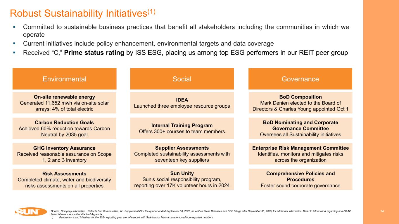 Unencumbered 80% Encumbered 20% Fortress, Investment Grade Balance Sheet (as of 9/30/2025) 13 100% fixed rate 0% variable rate Credit Statistics Rate Type(1) Upcoming Mortgage Maturities ($ in millions)(1)(2) 0.0% 11.5% 0.0% 4.1% % of Total Encumbrance(1) Gross Asset Value 69.5% NOI Unencumbered(3) Total Debt Outstanding ($ in millions)(1)(2) $- $492 $- $176 $311 2025 2026 2027 2028 2029 As of September 30, 2025 Mortgage Loans Payable & Secured Borrowings $2,485.8 Unsecured Notes (Bonds) 1,785.9 Total Debt Outstanding $4,271.7 Net Debt / TTM EBITDA 3.3x Net Debt / TTM EBITDA(4) 3.6x BBB+ Baa2 7.3% Source: Company information. Refer to Sun Communities, Inc. Supplemental for the quarter ended September 30, 2025, as well as Press Releases and SEC Filings after September 30, 2025, for additional information. Refer to information regarding non-GAAP financial measures in the attached Appendix. Note: With respect to guidance, estimates and forecasted information, see “Cautionary Statement Regarding Guidance” on page 2 of this presentation. 1) As of September 30, 2025. 2) For further debt breakdown, please refer to the Supplemental for the quarter ended September 30, 2025. 3) Calculated using trailing 12-months NOI for the quarter ended September 30, 2025. 4) Pro Forma for closed transactions and our common distribution, as of October 29, 2025.