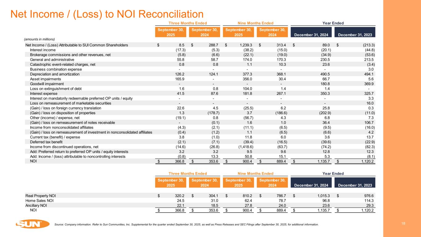 17 Source: Company information. Refer to Sun Communities, Inc. Supplemental for the quarter ended September 30, 2025, as well as Press Releases and SEC Filings after September 30, 2025, for additional information. Net Income / (Loss) to FFO Reconciliation (amounts in millions except per share data) September 30, 2025 September 30, 2024 September 30, 2025 September 30, 2024 December 31, 2024 December 31, 2023 Net Income / (Loss) Attributable to SUI Common Shareholders 8.5$ 288.7$ 1,239.3$ 313.4$ 89.0$ (213.3)$ Adjustments Depreciation and amortization - continuing operations 124.1 123.5 373.0 366.0 487.3 491.3 Depreciation and amortization - discontinued operations - 48.1 36.1 142.1 190.2 165.9 Depreciation on nonconsolidated affiliates 0.2 0.1 0.6 0.3 0.5 0.2 Asset impairments - continuing operations 165.9 - 356.0 30.4 66.7 5.6 Asset impairments - discontinued operations - 0.2 2.3 2.1 4.7 4.5 Goodwill impairment - - - - 180.8 369.9 Loss on remeasurement of marketable securities - - - - - 16.0 (Gain) / loss on remeasurement of investment in nonconsolidated affiliates (0.4) (1.2) 1.1 (6.5) (6.6) 4.2 (Gain) / loss on remeasurement of notes receivable - (0.1) 1.6 1.0 36.4 106.7 Loss on remeasurement of collateralized receivables and secured borrowings, net - - - - - 0.4 (Gain) / loss on dispositions of properties, including tax effect - continuing operations (0.3) (181.4) 3.7 (188.5) (203.6) (8.9) Gain on dispositions of properties, including tax effect - discontinued operations (13.8) - (1,458.8) - - - Add: Returns on preferred OP units 3.1 3.2 9.3 9.5 8.3 11.8 Add: Income / (loss) attributable to noncontrolling interests (0.9) 13.3 50.8 15.1 4.8 (8.1) Gain on dispositions of assets, net (3.9) (7.1) (11.8) (21.1) (27.1) (38.0) FFO Attributable to SUI Common Shareholders and Convertible Securities 282.5$ 287.3$ 603.2$ 663.8$ 831.4$ 908.2$ Adjustments Business combination expense - continuing operations - - - - - 3.0 Business combination expense - discontinued operations - 0.2 - 0.4 0.4 - Acquisition and other transaction costs - continuing operations 2.2 2.4 18.5 12.9 19.3 25.3 Acquisition and other transaction costs - discontinued operations 0.5 0.5 63.4 3.0 0.3 - Loss on extinguishment of debt 1.6 0.8 104.0 1.4 1.4 - Catastrophic event-related charges, net - continuing operations 0.8 0.8 1.1 10.3 27.1 3.8 Catastrophic event-related charges, net - discontinued operations - 0.1 - 0.1 - - Loss of earnings - catastrophic event-related charges, net 4.2 5.9 2.5 11.5 3.4 2.1 (Gain) / loss on foreign currency exchanges 22.6 4.5 (25.5) 6.2 25.8 0.3 Other adjustments, net - continuing operations (20.0) 3.7 (88.7) 0.7 (17.2) (27.6) Other adjustments, net - discontinued operations - - 14.8 (9.9) (10.0) 0.2 Core FFO Attributable to SUI Common Shareholders and Convertible Securities 294.4$ 306.2$ 693.3$ 700.4$ 881.9$ 915.3$ Weighted Average Common Shares and OP Units Outstanding 129.3 129.5 131.2 129.4 129.5 128.9 FFO Attributable to SUI Common Shareholders and Convertible Securities Per Share 2.18$ 2.22$ 4.60$ 5.13$ 6.42$ 7.05$ Core FFO Attributable to SUI Common Shareholders and Convertible Securities Per Share 2.28$ 2.36$ 5.28$ 5.41$ 6.81$ 7.10$ September 30, 2025 September 30, 2024 September 30, 2025 September 30, 2024 December 31, 2024 December 31, 2023 Hurricane Ian - Three Fort Myers, Florida RV communities impaired Estimated loss of earnings in excess of the applicable business interruption deductible 4.1$ 4.6$ 12.0$ 15.2$ 19.2$ 21.9$ Insurance recoveries received for previously estimated loss of earnings - - (9.9) (5.0) (16.3) (19.7) Hurricane Irma - Three Florida Keys communities impaired Estimated loss of earnings in excess of the applicable business interruptions deductible, net - - - - - (0.1) Hurricane Helene - one Dunedin Florida RV community impaired Estimated loss of earnings in excess of the applicable business interruptions deductible 0.1 - 0.4 - 0.5 - Flooding event - estimated loss of earnings at one New Hampshire RV community Estimated loss of earnings in excess of the applicable business interruptions deductible - 1.3 - 1.3 1.3 - Insurance recoveries received for previously estimated loss of earnings - - - - (1.3) - Loss of earnings - catastrophic event-related charges, net 4.2$ 5.9$ 2.5$ 10.2$ 3.4$ 2.1$ Year EndedNine Months EndedThree Months Ended Three Months Ended Nine Months Ended Year Ended