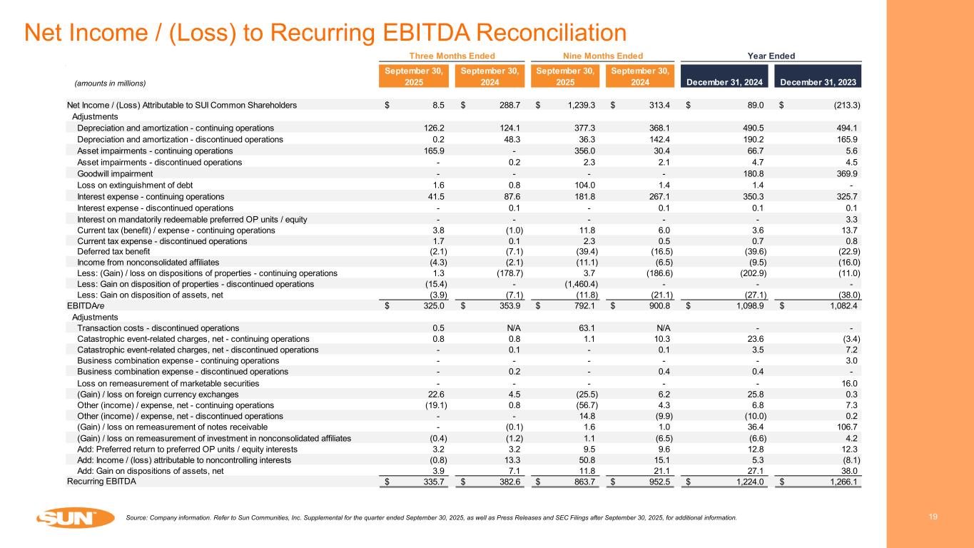 September 30, 2025 September 30, 2024 September 30, 2025 September 30, 2024 December 31, 2024 December 31, 2023 Net Income / (Loss) Attributable to SUI Common Shareholders 8.5$ 288.7$ 1,239.3$ 313.4$ 89.0$ (213.3)$ Interest income (17.3) (5.3) (38.2) (15.0) (20.1) (44.8) Brokerage commissions and other revenues, net (5.8) (6.6) (22.1) (19.0) (34.9) (53.6) General and administrative 55.8 58.7 174.0 170.3 230.5 213.5 Catastrophic event-related charges, net 0.8 0.8 1.1 10.3 23.6 (3.4) Business combination expense - - - - - 3.0 Depreciation and amortization 126.2 124.1 377.3 368.1 490.5 494.1 Asset impairments 165.9 - 356.0 30.4 66.7 5.6 Goodwill impairment - - - - 180.8 369.9 Loss on extinguishment of debt 1.6 0.8 104.0 1.4 1.4 - Interest expense 41.5 87.6 181.8 267.1 350.3 325.7 Interest on mandatorily redeemable preferred OP units / equity - - - - - 3.3 Loss on remeasurement of marketable securities - - - - - 16.0 (Gain) / loss on foreign currency translation 22.6 4.5 (25.5) 6.2 25.8 0.3 (Gain) / loss on disposition of properties 1.3 (178.7) 3.7 (186.6) (202.9) (11.0) Other (income) / expense, net (19.1) 0.8 (56.7) 4.3 6.8 7.3 (Gain) / loss on remeasurement of notes receivable - (0.1) 1.6 1.0 36.4 106.7 Income from nonconsolidated affiliates (4.3) (2.1) (11.1) (6.5) (9.5) (16.0) (Gain) / loss on remeasurement of investment in nonconsolidated affiliates (0.4) (1.2) 1.1 (6.5) (6.6) 4.2 Current tax (benefit) / expense 3.8 (1.0) 11.8 6.0 3.6 13.7 Deferred tax benefit (2.1) (7.1) (39.4) (16.5) (39.6) (22.9) Income from discontinued operations, net (14.6) (26.8) (1,418.6) (63.7) (74.2) (82.3) Add: Preferred return to preferred OP units / equity interests 3.2 3.2 9.5 9.6 12.8 12.3 Add: Income / (loss) attributable to noncontrolling interests (0.8) 13.3 50.8 15.1 5.3 (8.1) NOI 366.8$ 353.6$ 900.4$ 889.4$ 1,135.7$ 1,120.2$ September 30, 2025 September 30, 2024 September 30, 2025 September 30, 2024 December 31, 2024 December 31, 2023 Real Property NOI 320.2$ 304.1$ 810.2$ 786.7$ 1,015.3$ 976.6$ Home Sales NOI 24.5 31.0 62.4 78.7 96.8 114.3 Ancillary NOI 22.1 18.5 27.8 24.0 23.6 29.3 NOI 366.8$ 353.6$ 900.4$ 889.4$ 1,135.7$ 1,120.2$ Year Ended Year Ended Three Months Ended Three Months Ended Nine Months Ended Nine Months Ended Net Income / (Loss) to NOI Reconciliation 18Source: Company information. Refer to Sun Communities, Inc. Supplemental for the quarter ended September 30, 2025, as well as Press Releases and SEC Filings after September 30, 2025, for additional information. (amounts in millions)